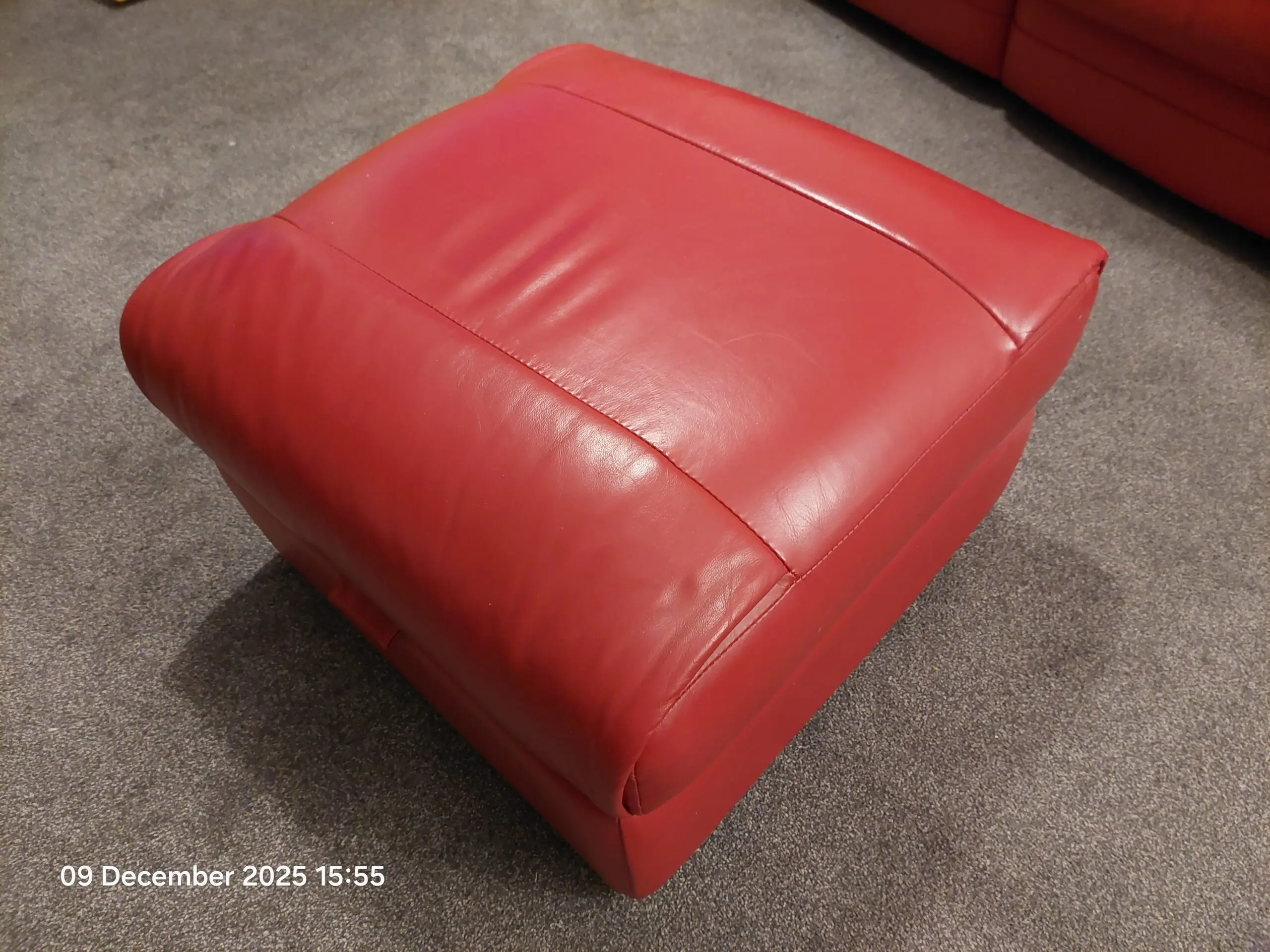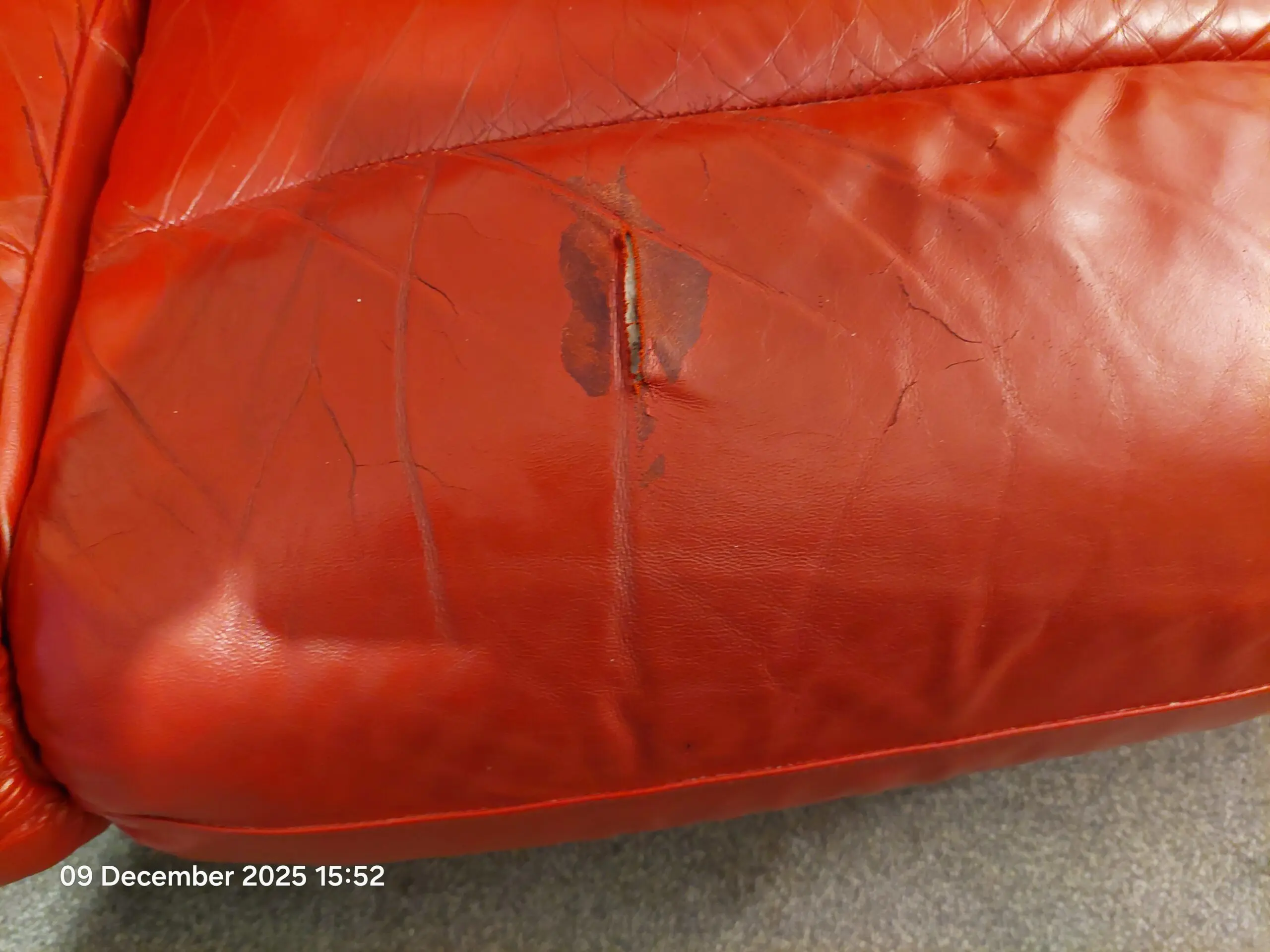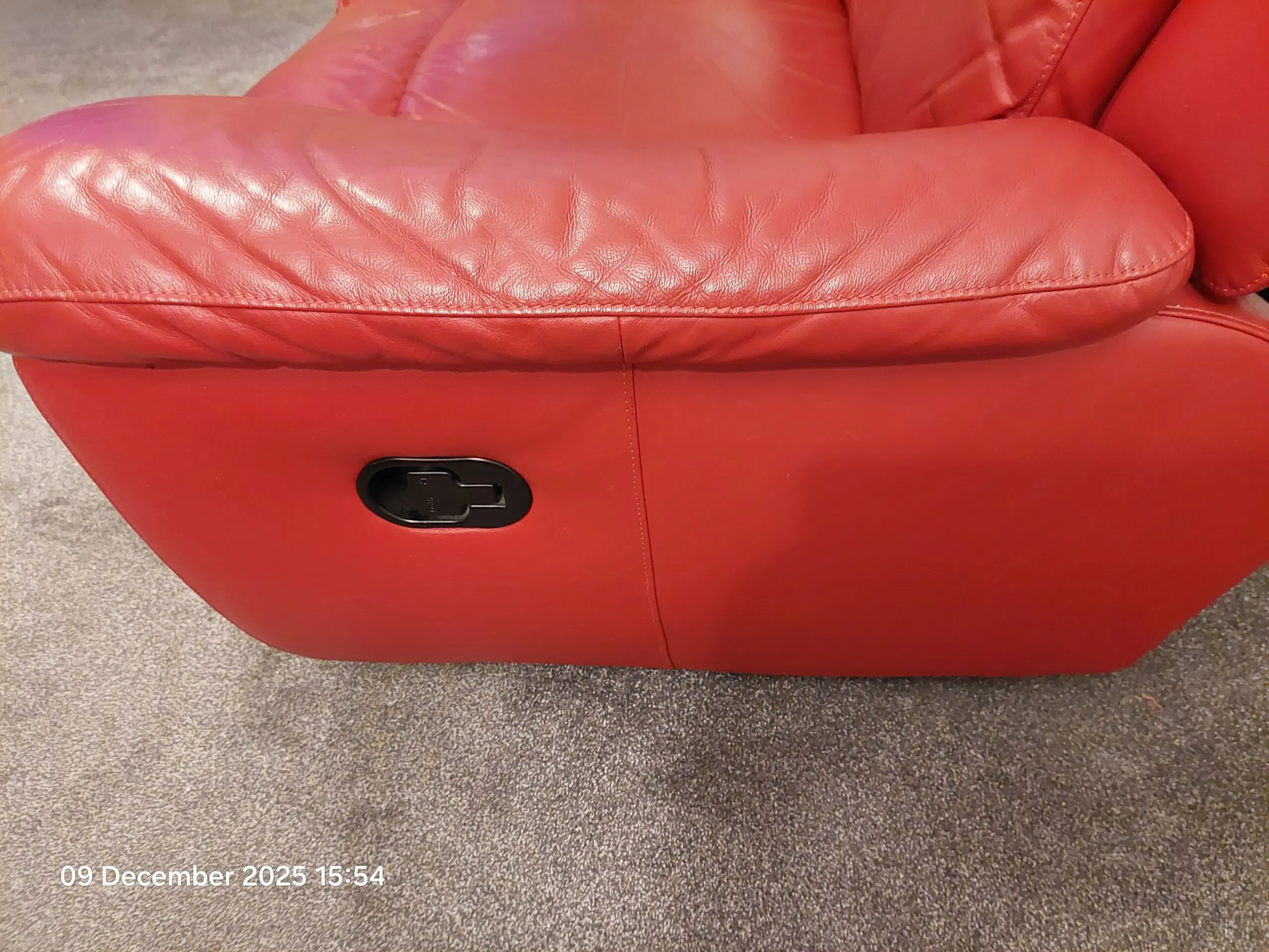 2 seater manual dual full reclining sofa in red leather has small tear on left hand seat cushion (see picture 4) Removable backs for easy transportation.