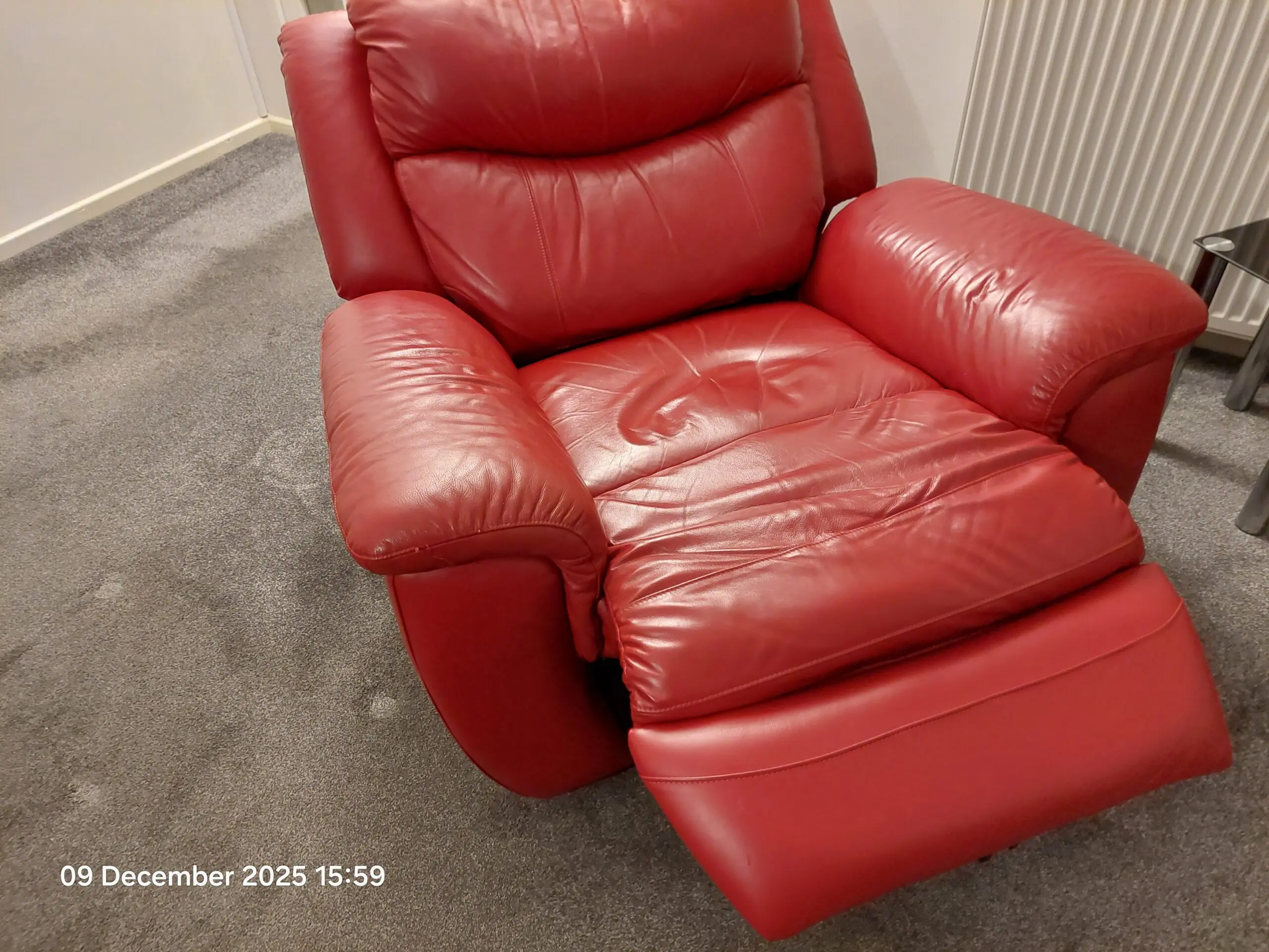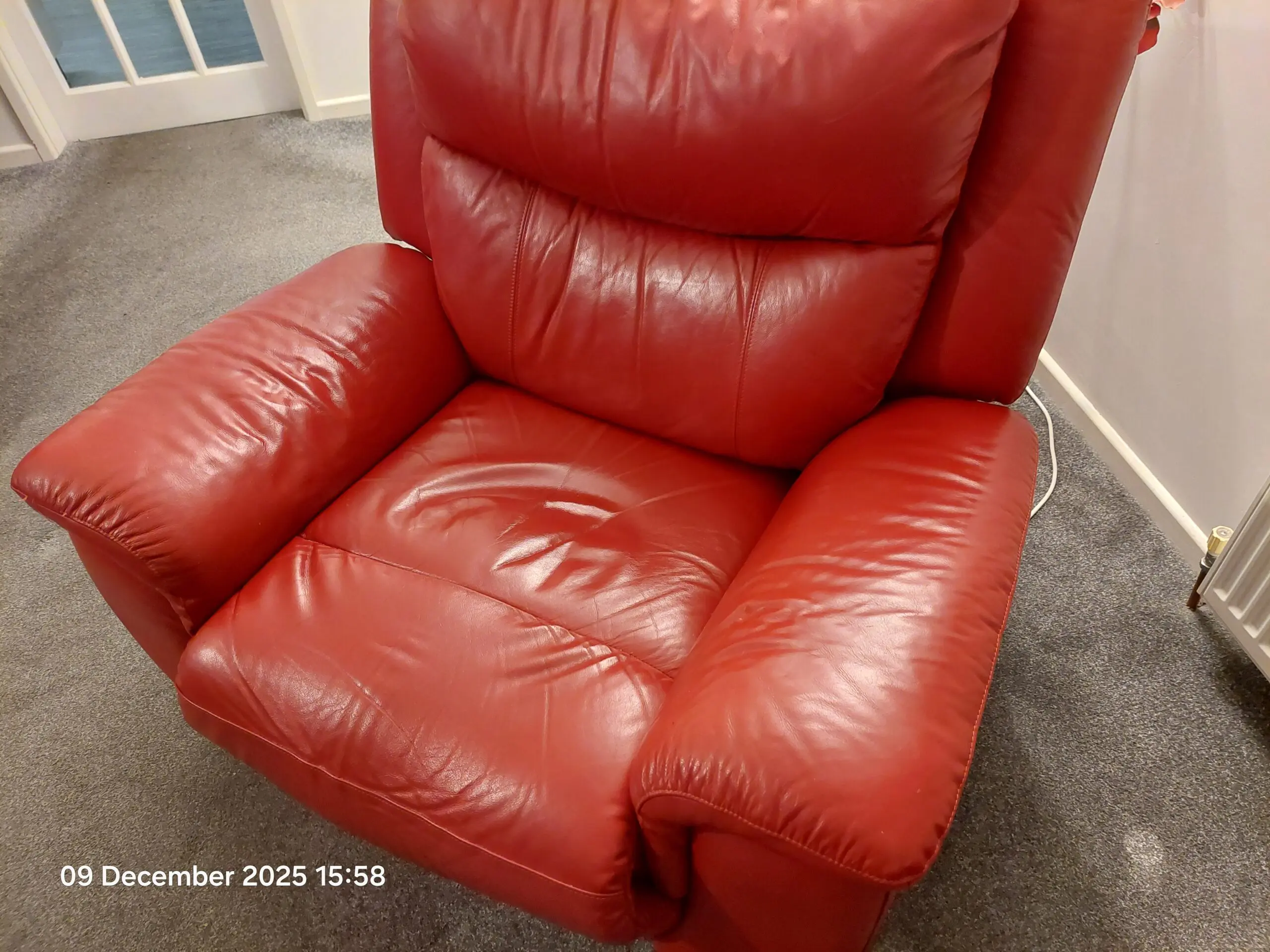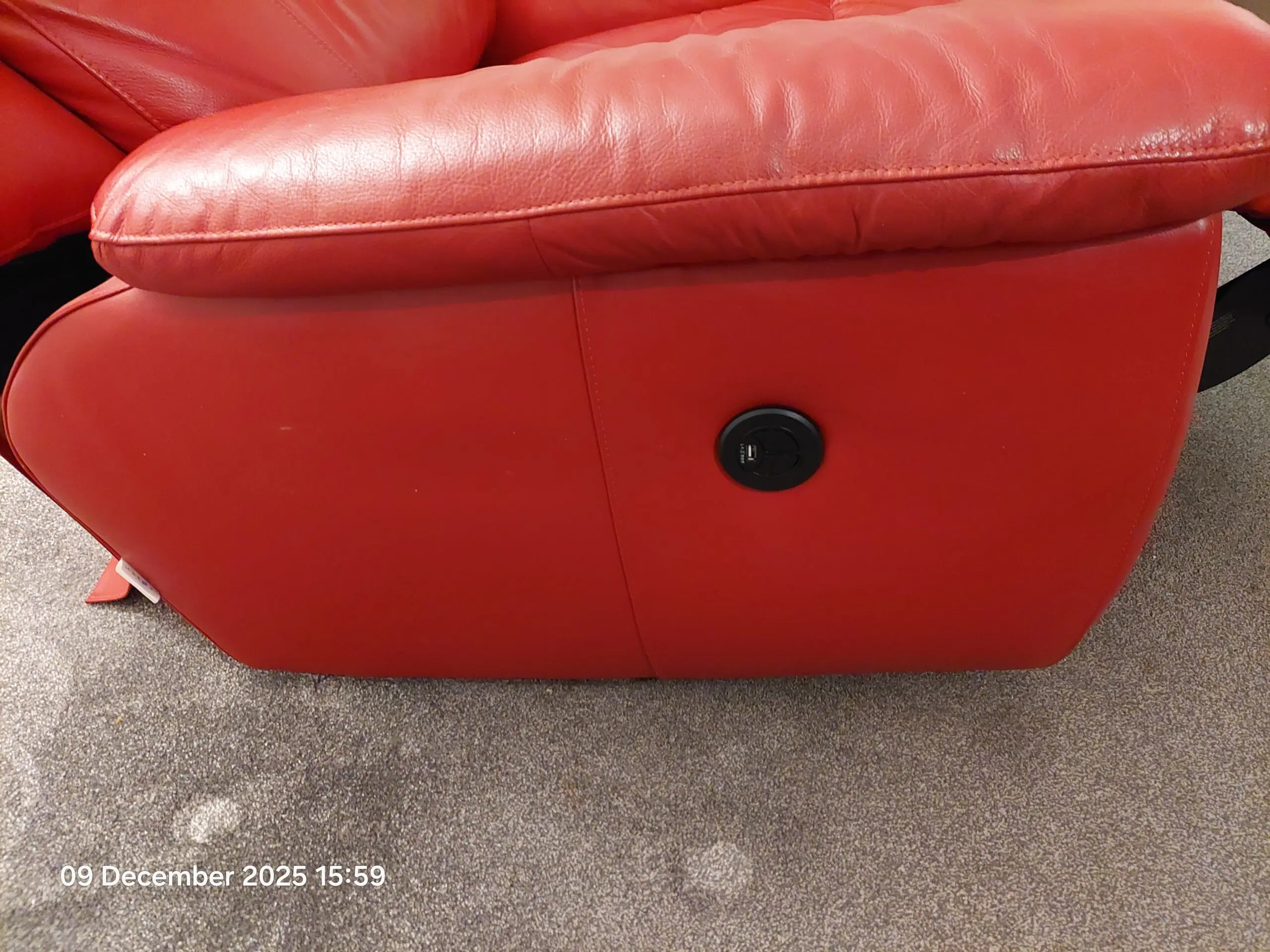 Chair power full reclining in red leather with built in USB all cables present minimal wear also has removable back.