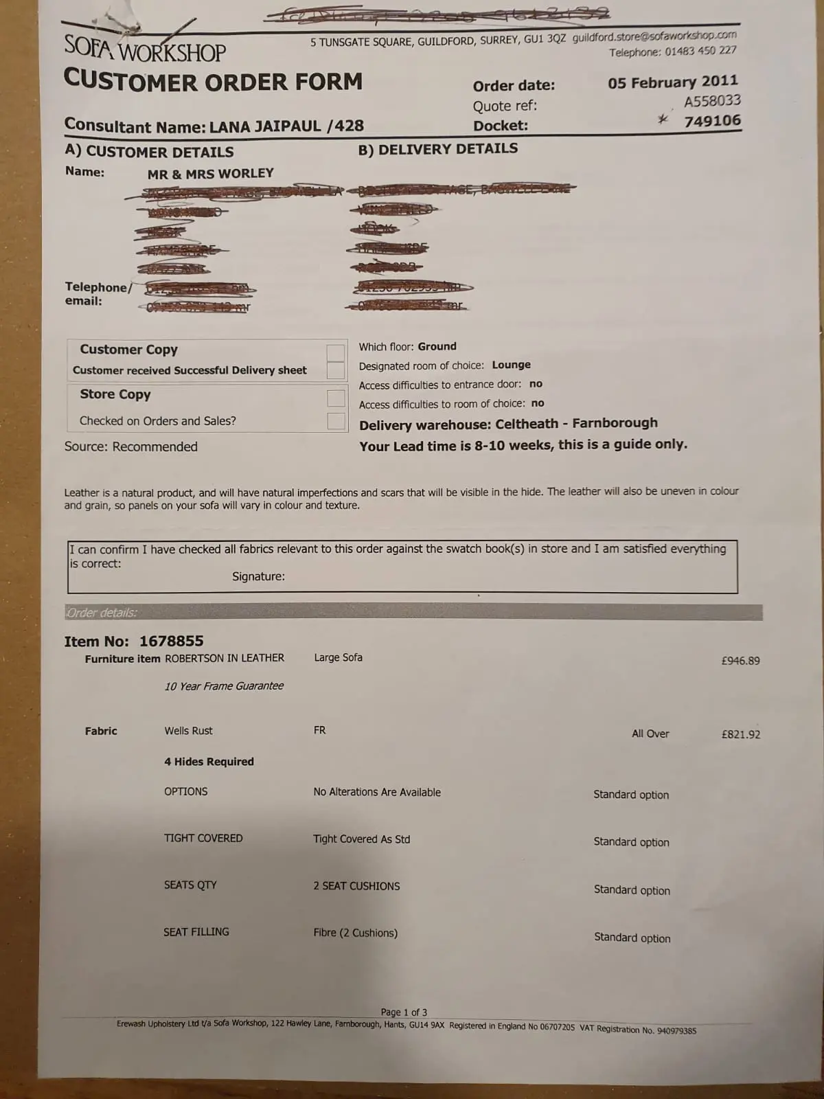 Made to order at SofaWorkshop in Feb 2011 under name of Robertson in Leather, for which previous owners paid £946