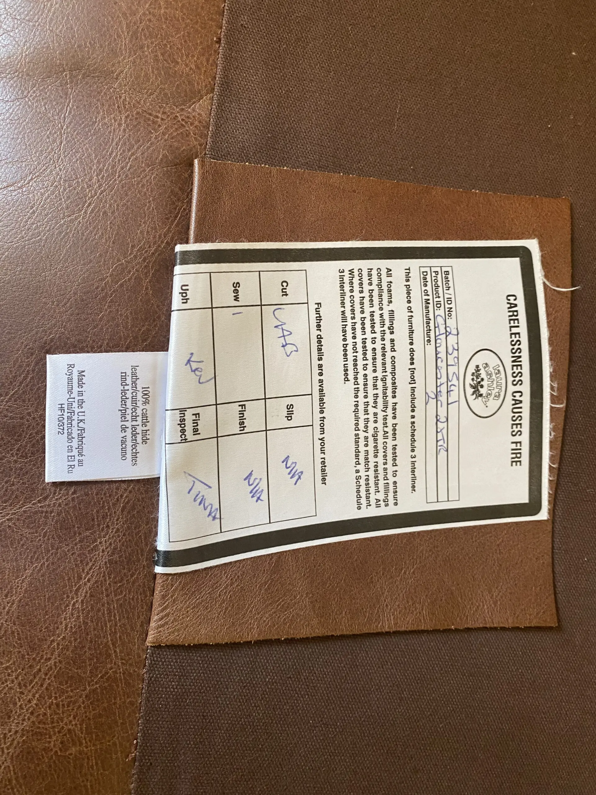 Laura Ashley Gloucester Large 2 Seater Brown Leather Sofa and Footstool. Good condition, fire safety label, some faded areas on sofa and especially footstool, a few marks as per photos, hardly sat on.