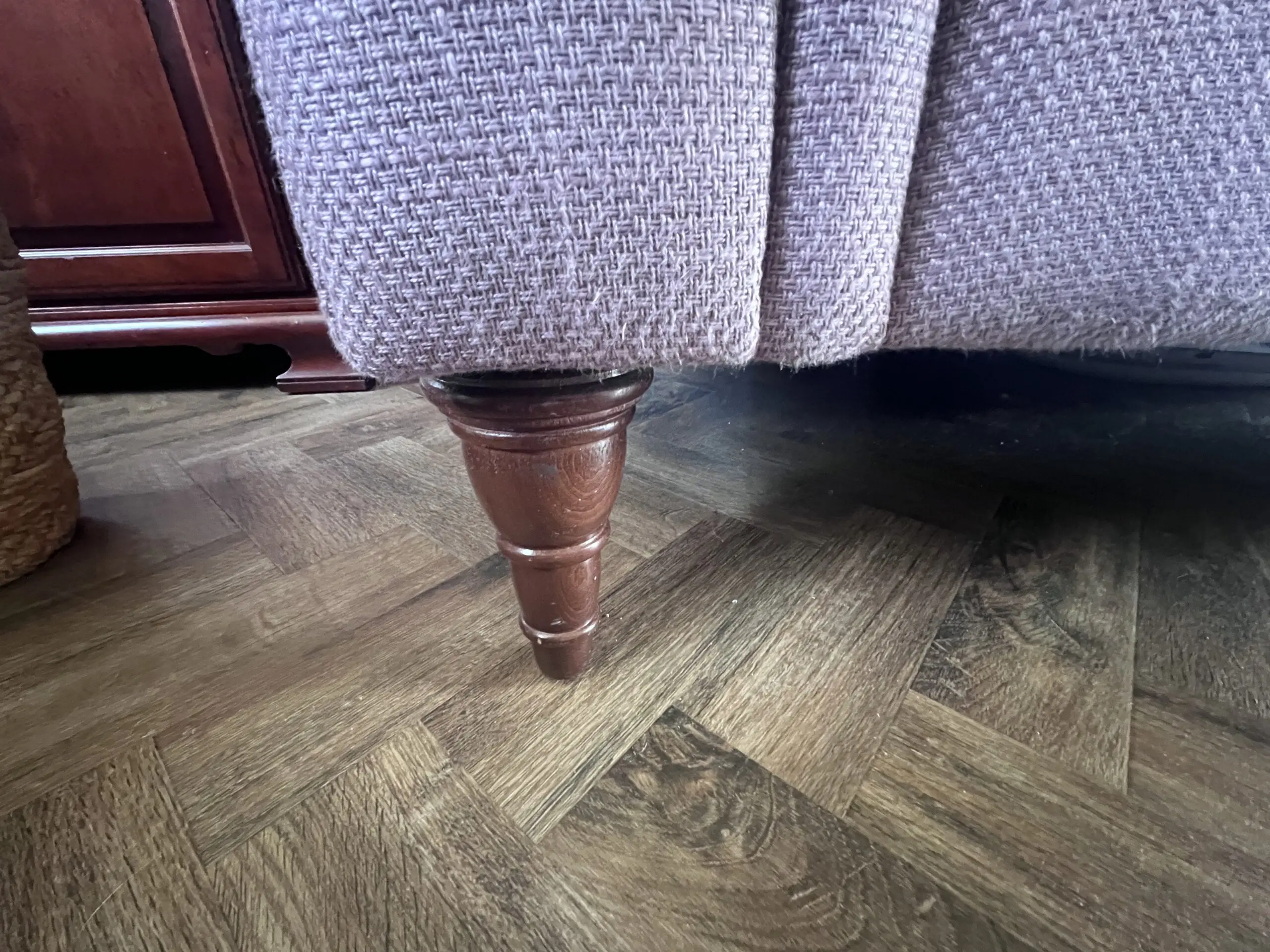 This is a Laura Ashley Mortimer, two seater sofa in Heather, which is a dusty pink colour. Fitted with the harder wearing seat pads. It has mahogany removable wooden legs and is in good clean condition and has no stains or defects but may show signs of minimal wear, consistent with use.