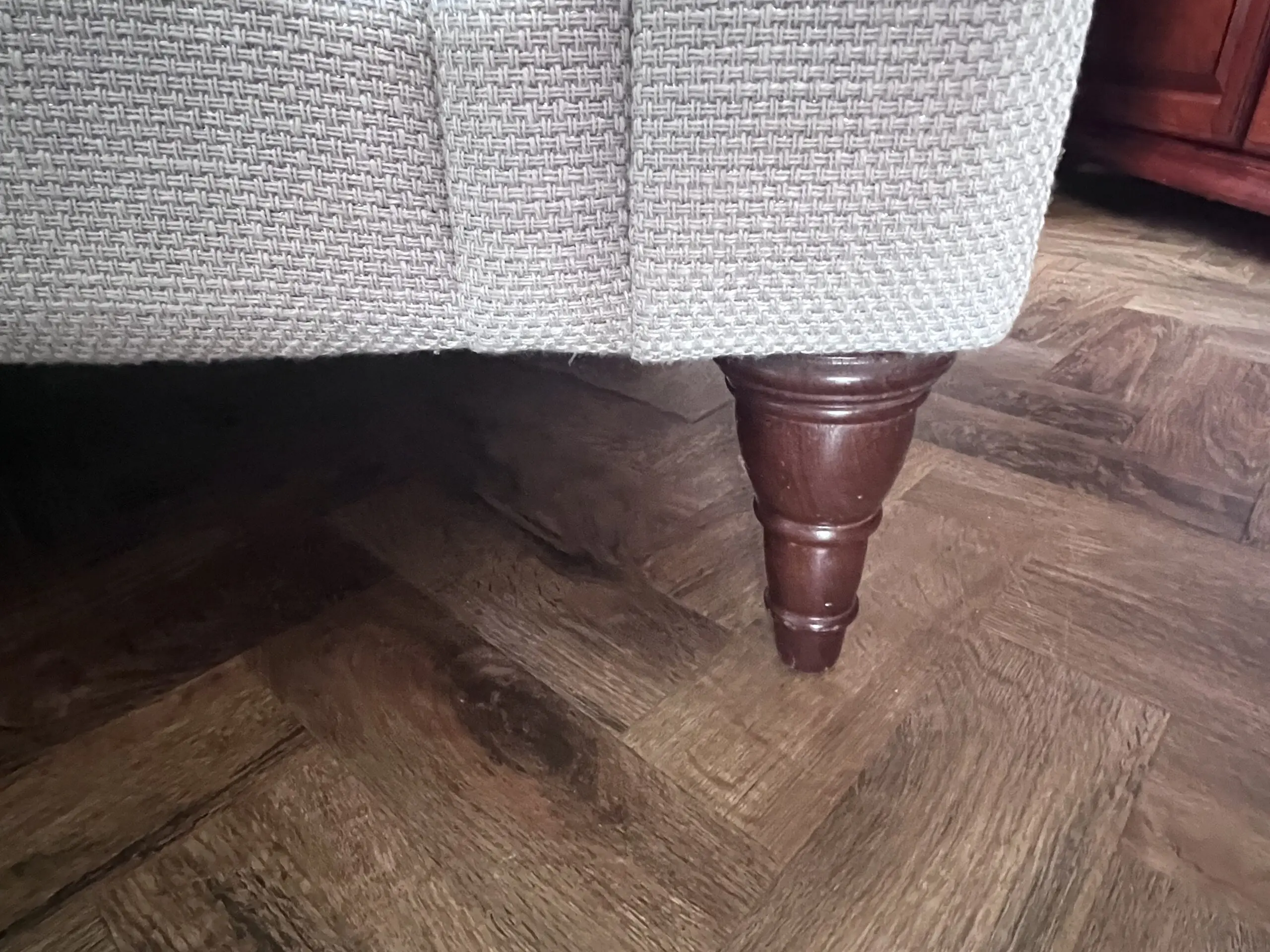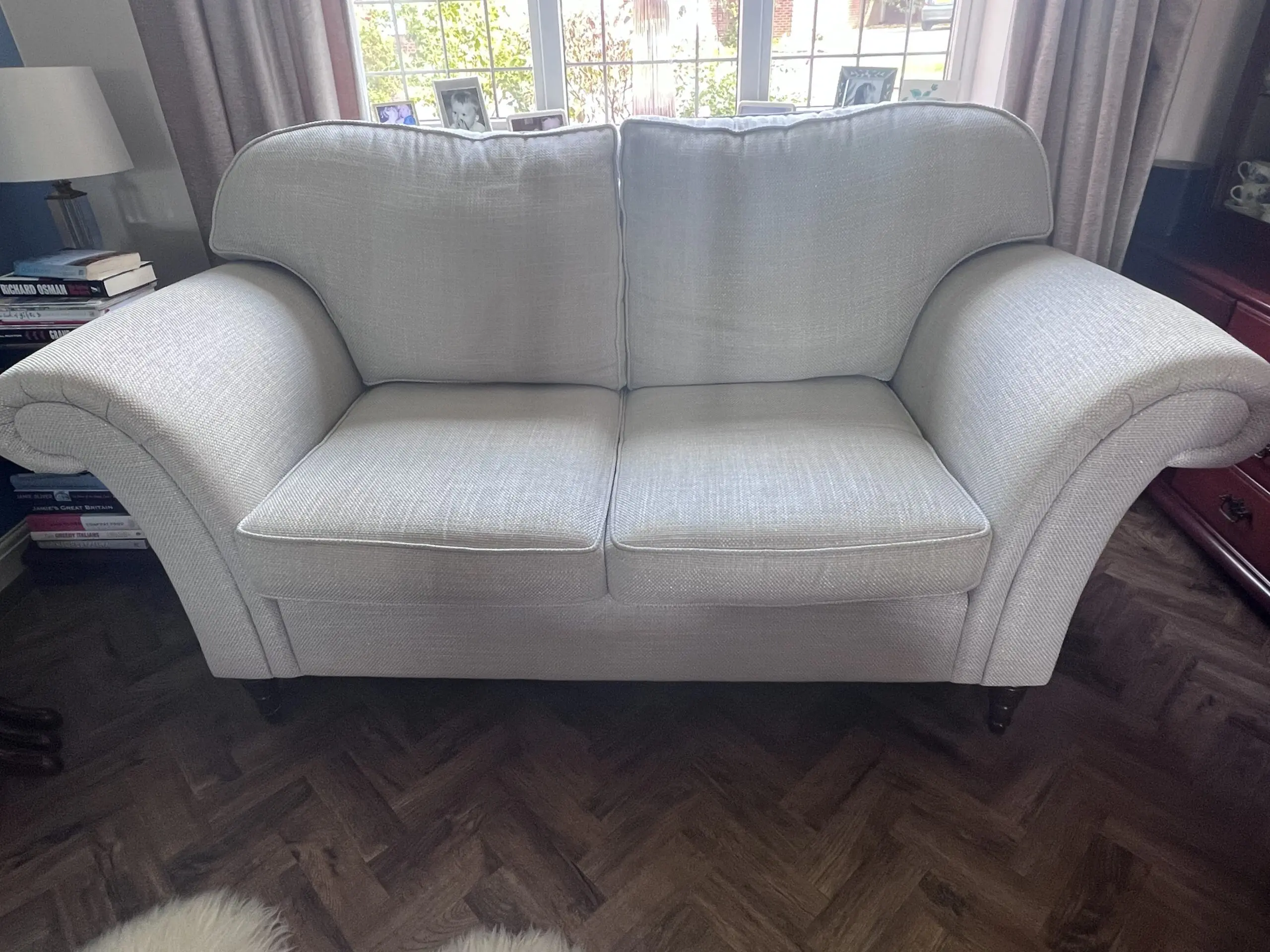 This is a Laura Ashley Mortimer, two seater sofa in Heather, which is a dusty pink colour. Fitted with the harder wearing seat pads. It has mahogany removable wooden legs and is in good clean condition and has no stains or defects but may show signs of minimal wear, consistent with use. The lines in the photo are shadow and not marks on the sofa.