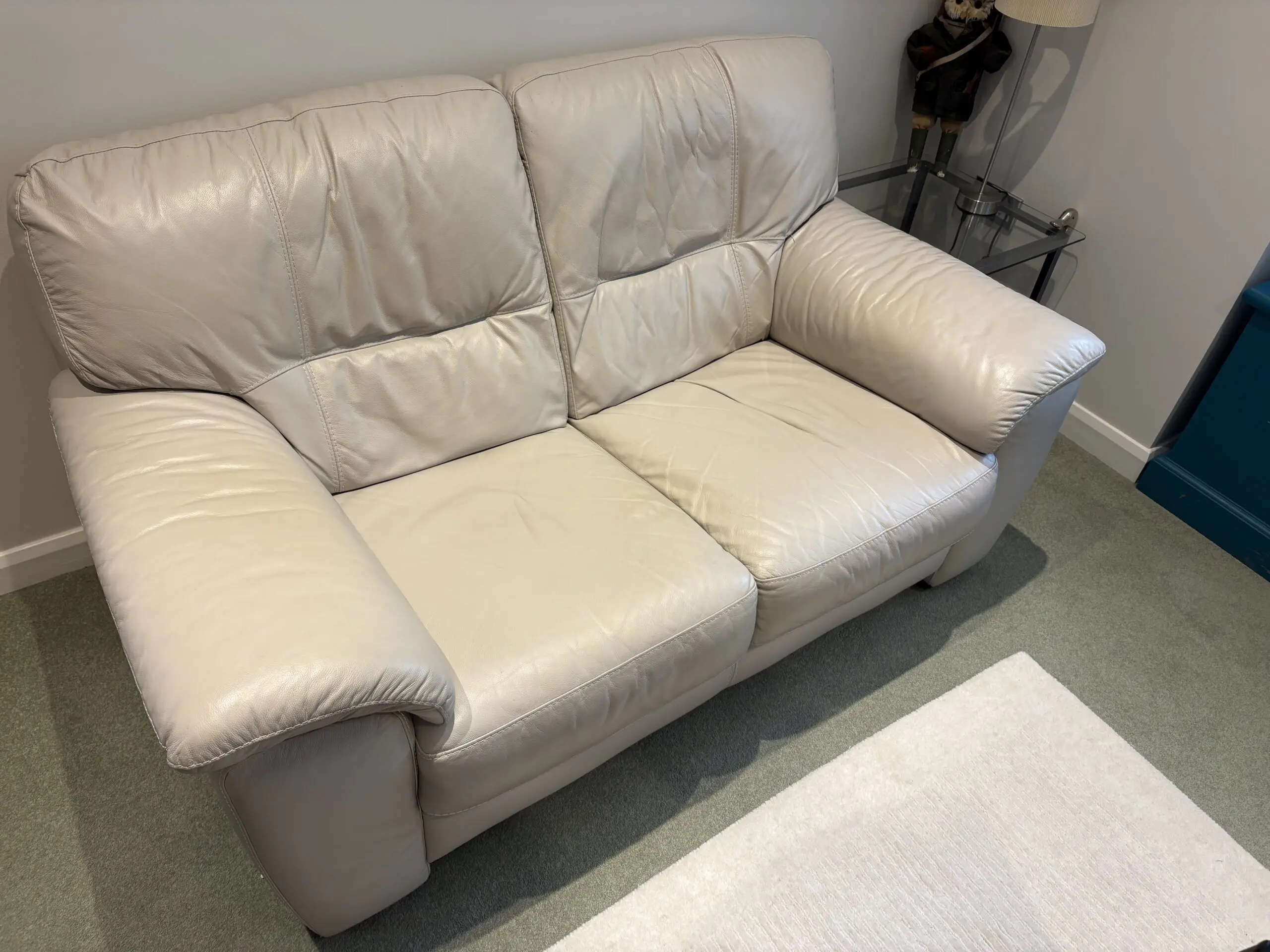 Large two seater leather sofa in beige/stone, from house with no pets or smoking.