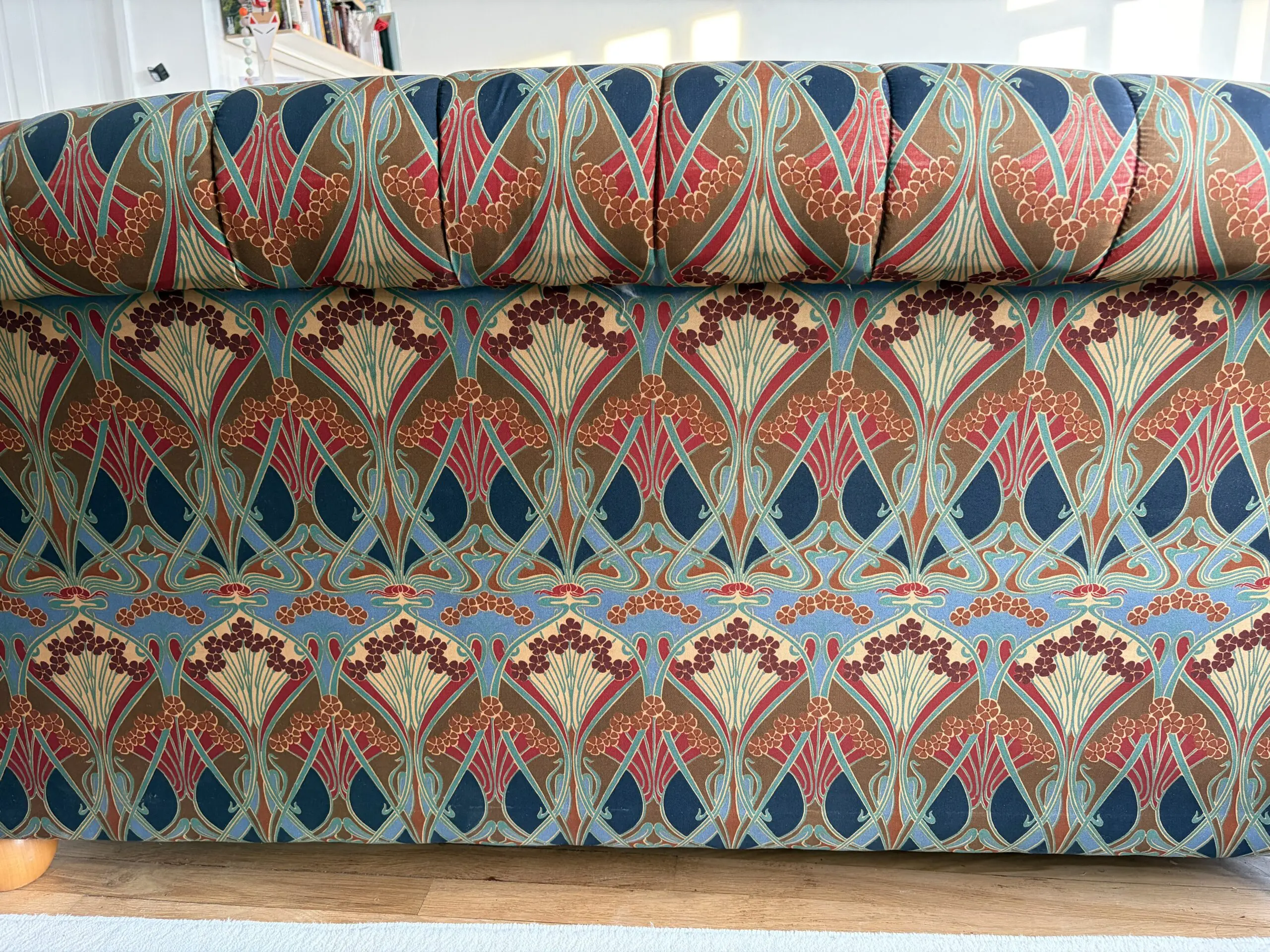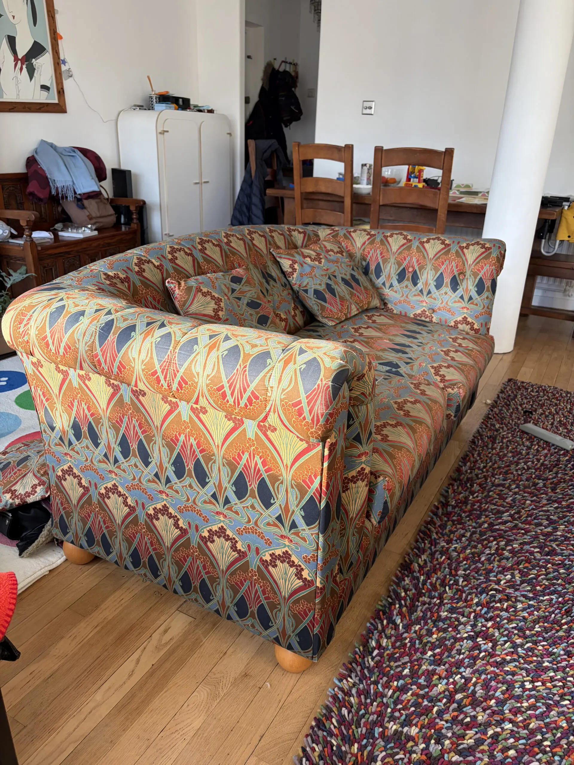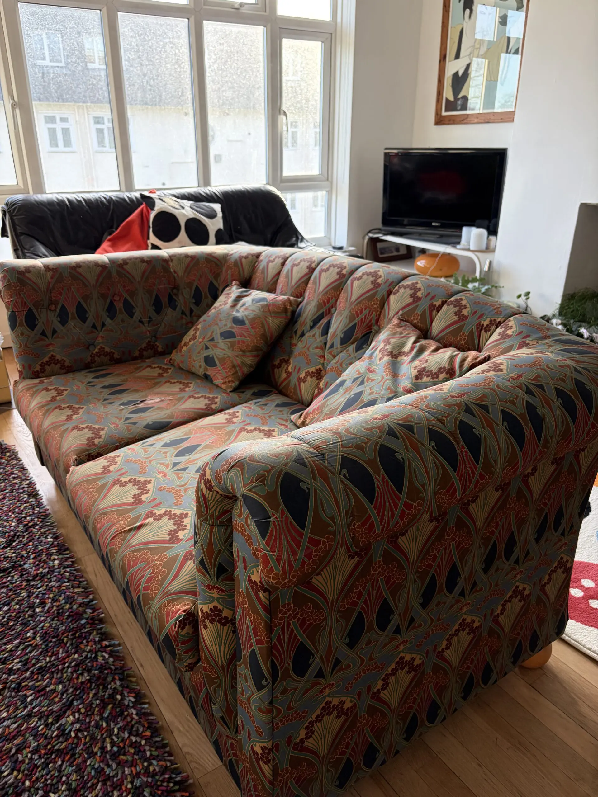 Liberty Ianthe Tana Lawn brown 2-seater fabric purchased from John Lewis 30 years ago. It is in good condition apart from a rip on one seat cushion. Two cushions are included.
