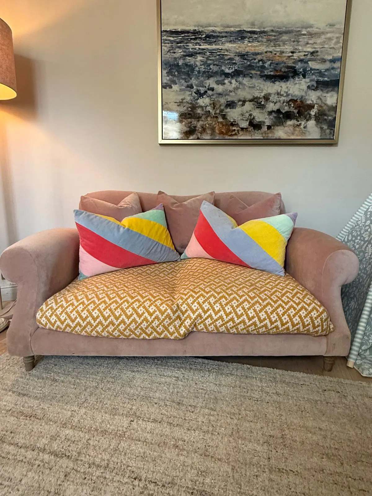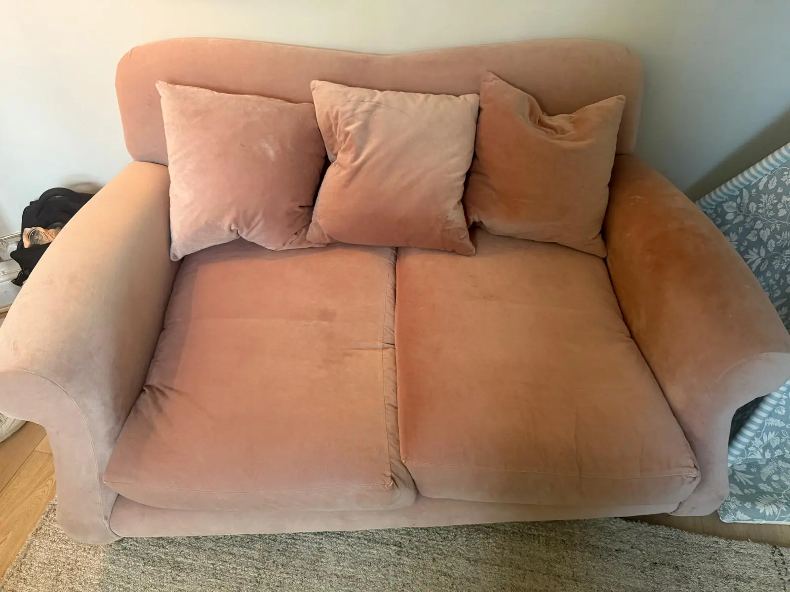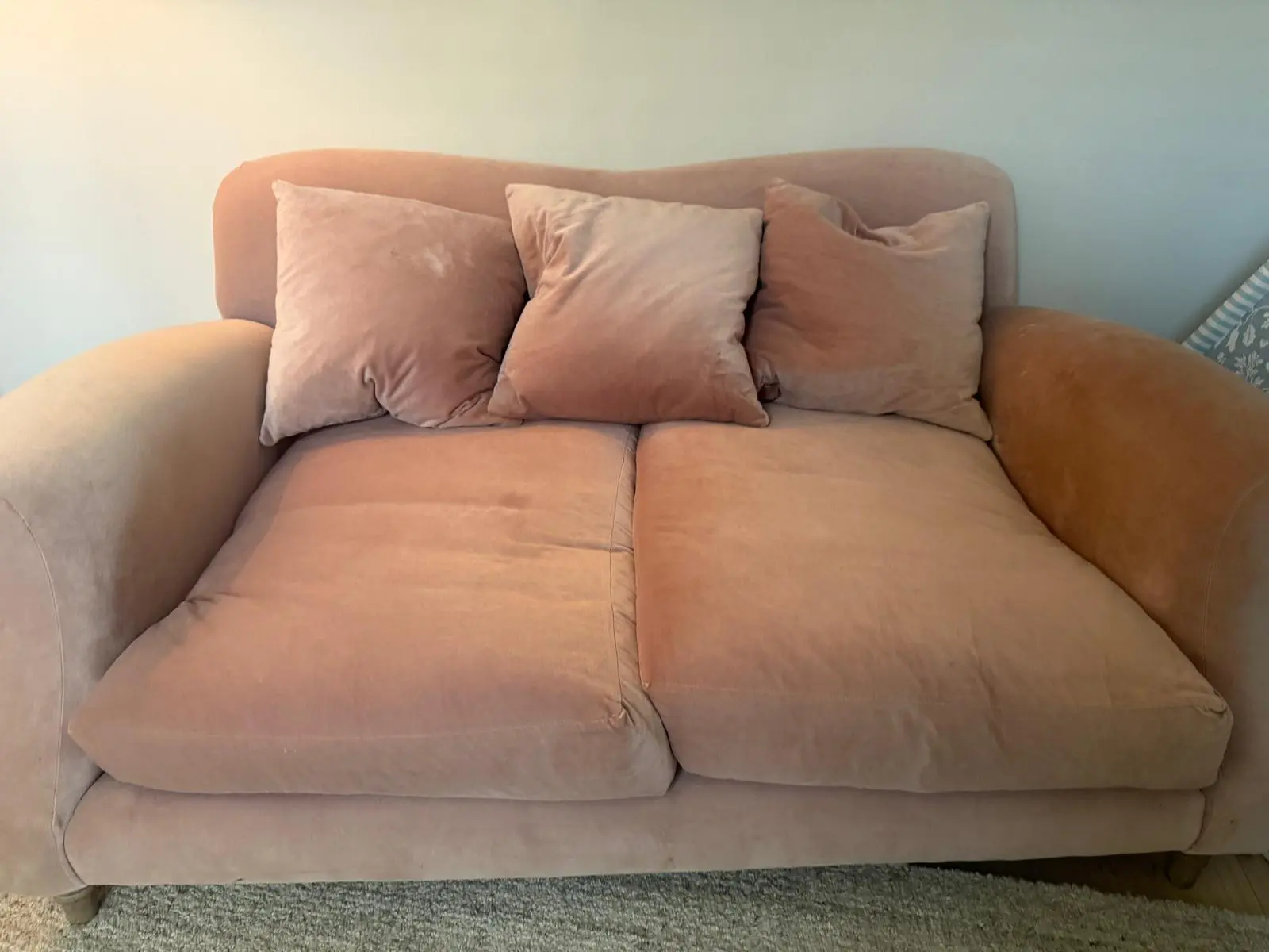 Good condition with a few rust marks where nails are. Hardly used so in very good condition. Selling as need bigger sofa due to growing family. As you can see from the photos the sofa has almost always had a throw on it protecting it.