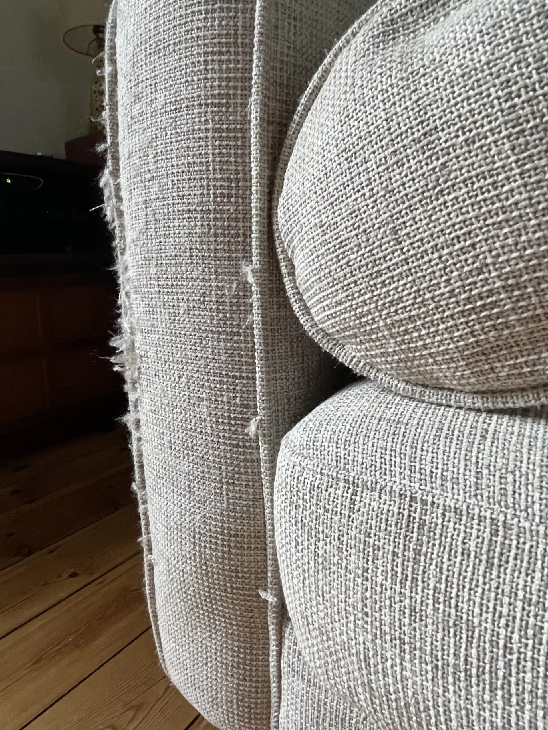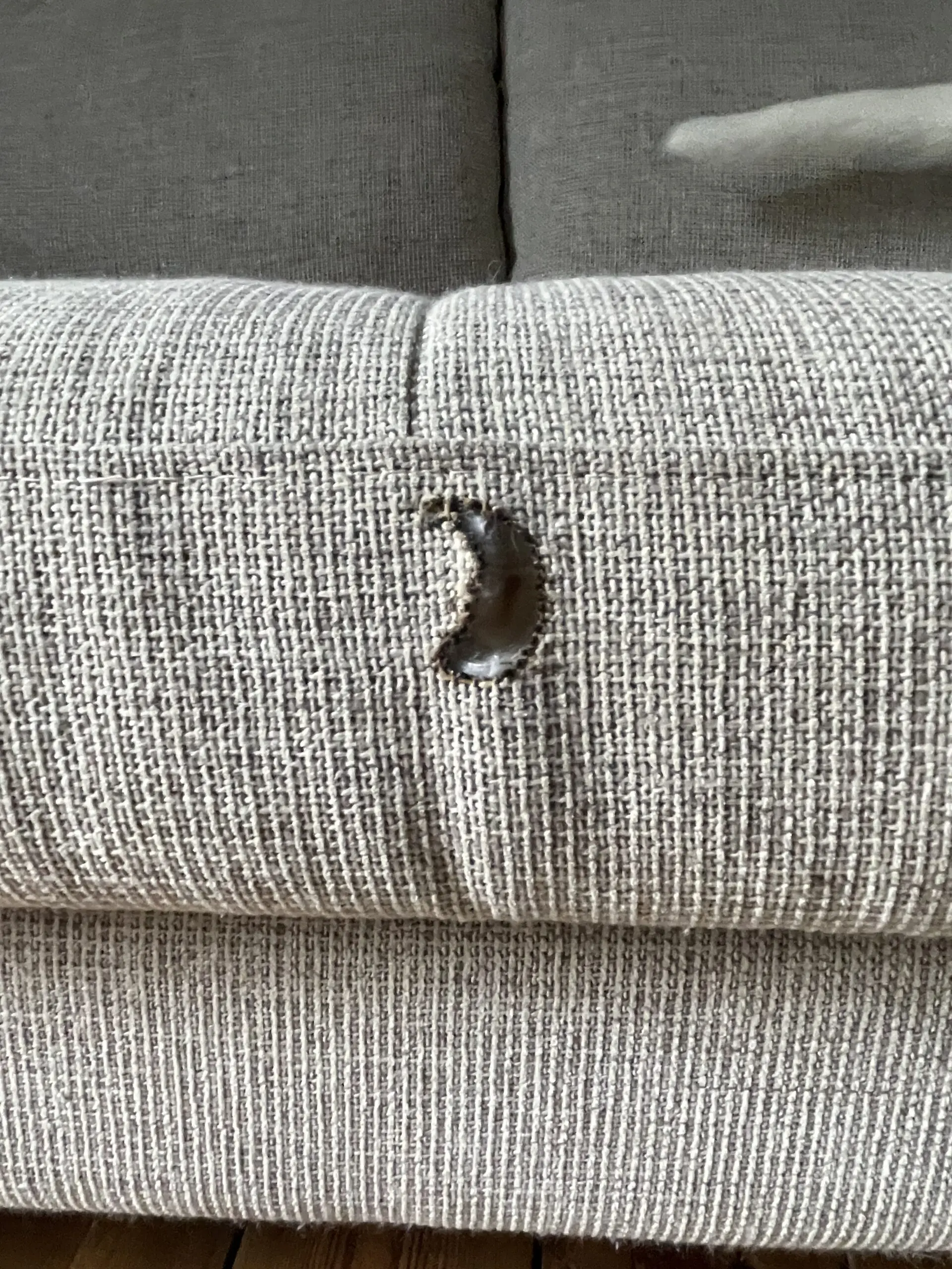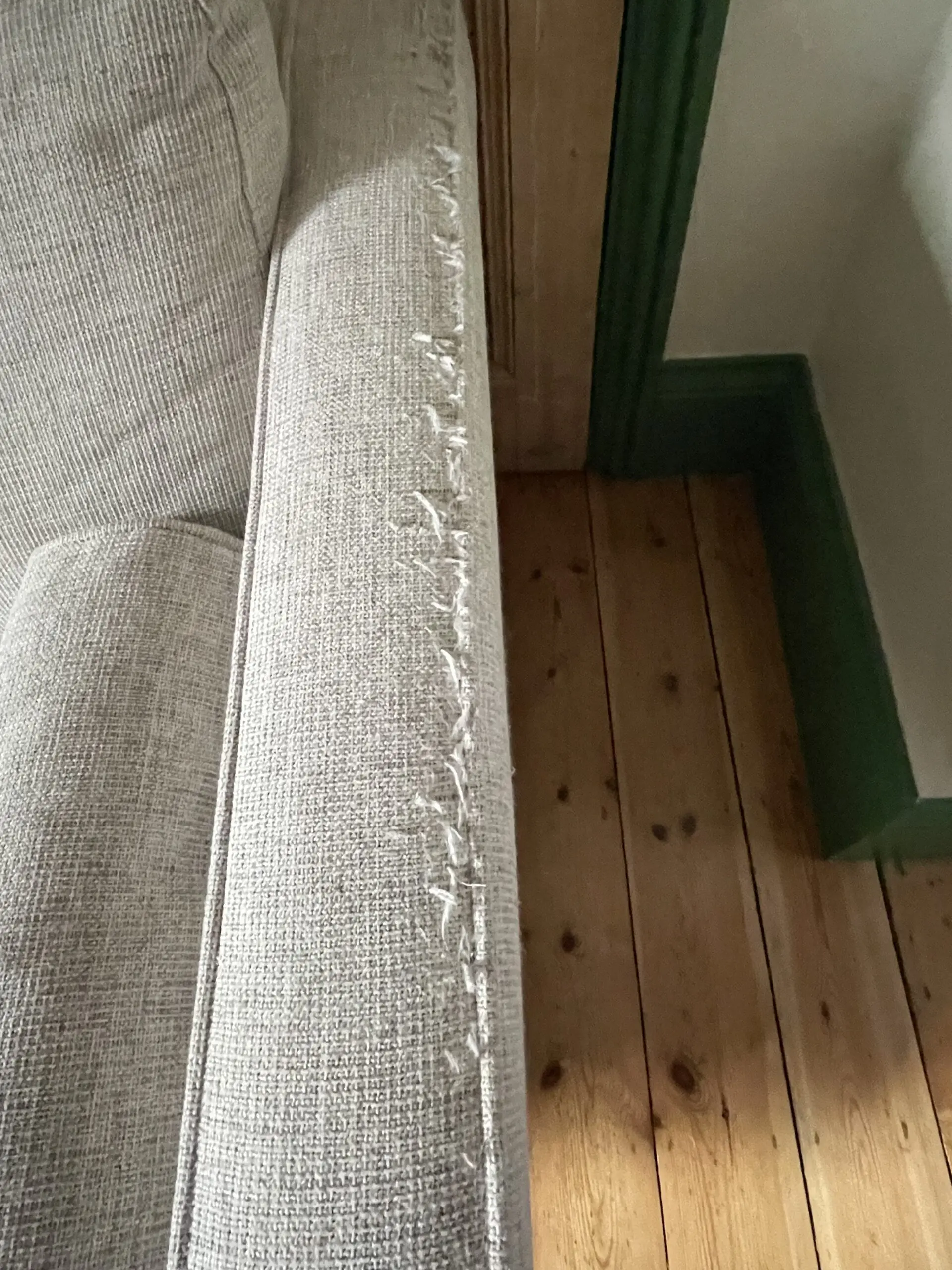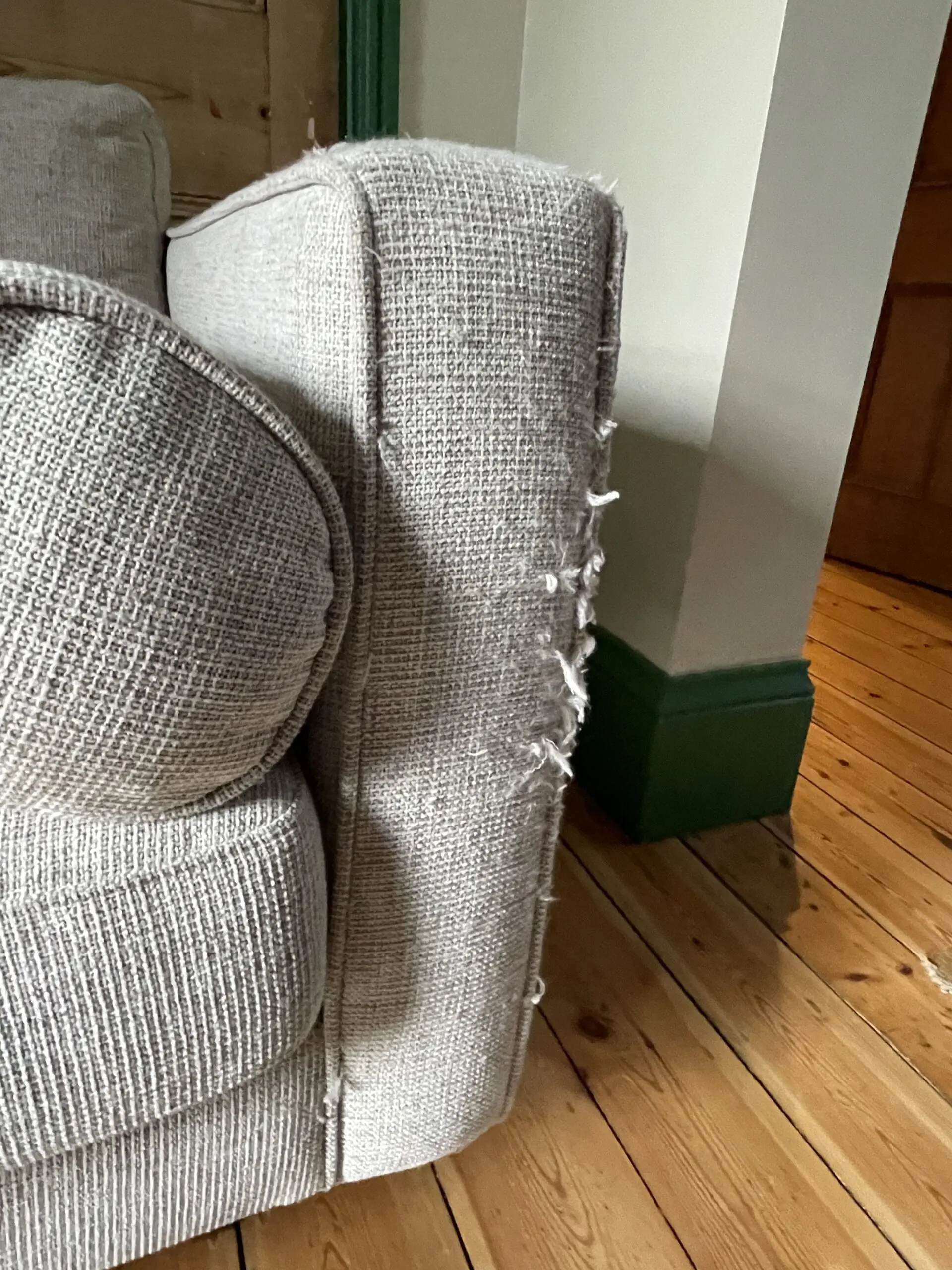There are visible cat scratch damage on the sides/arms and a burn mark on the front edge of the seat (see photos), and so ideally the sofa does need reupholstering, but could be covered with throw. Sofa was professionally cleaned in October.