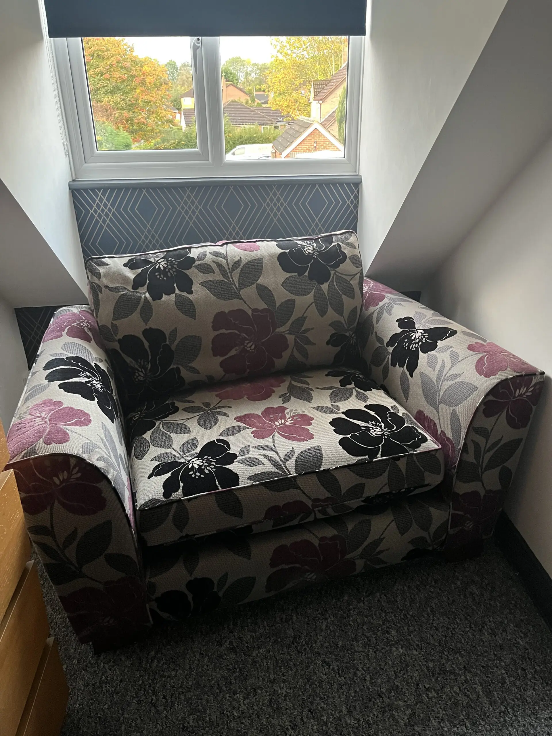 A very cosy and comfortable ‘loveseat’ in multi-coloured (burgundy and black floral on a grey background), Grade A chenille fabric.