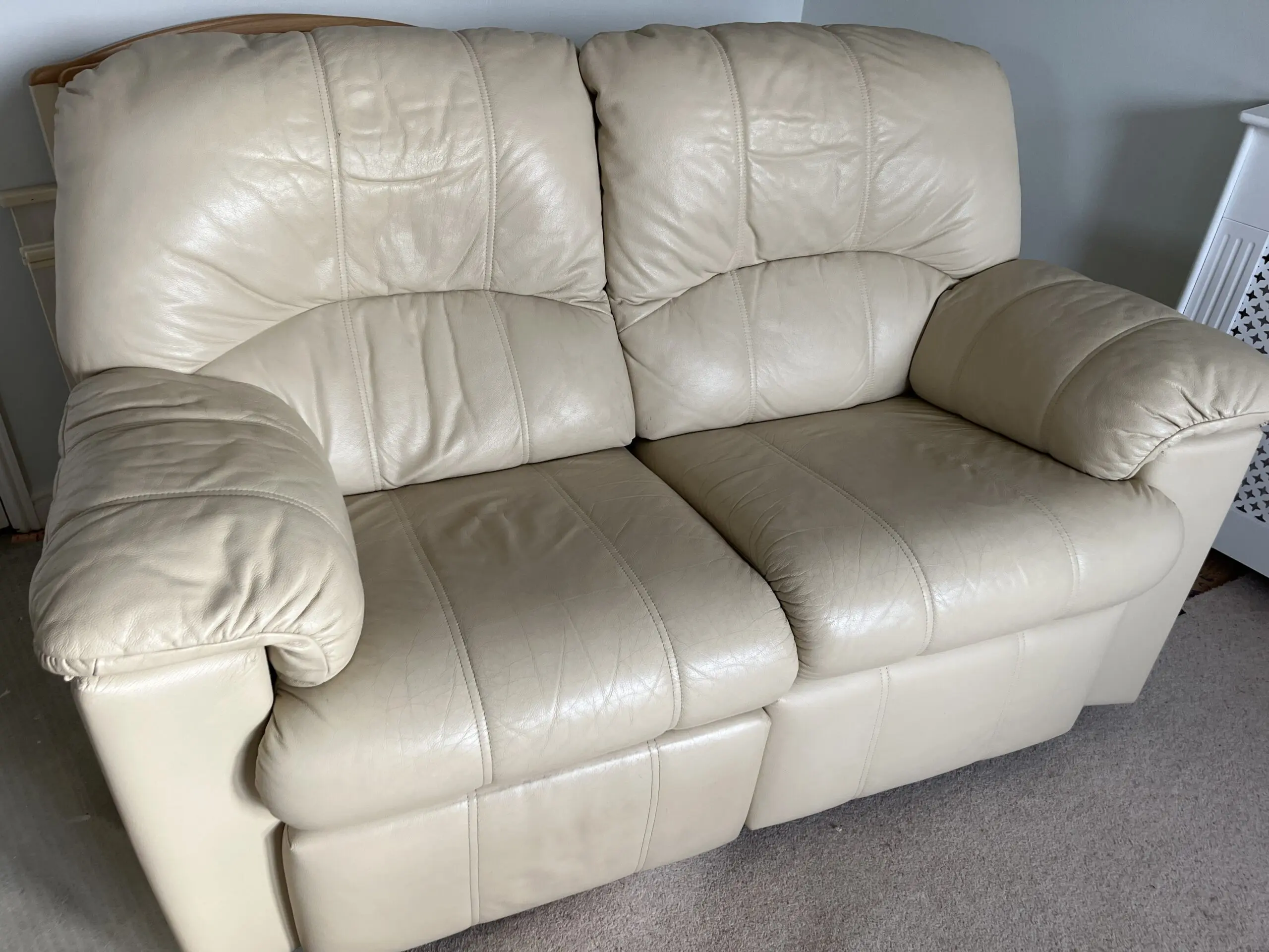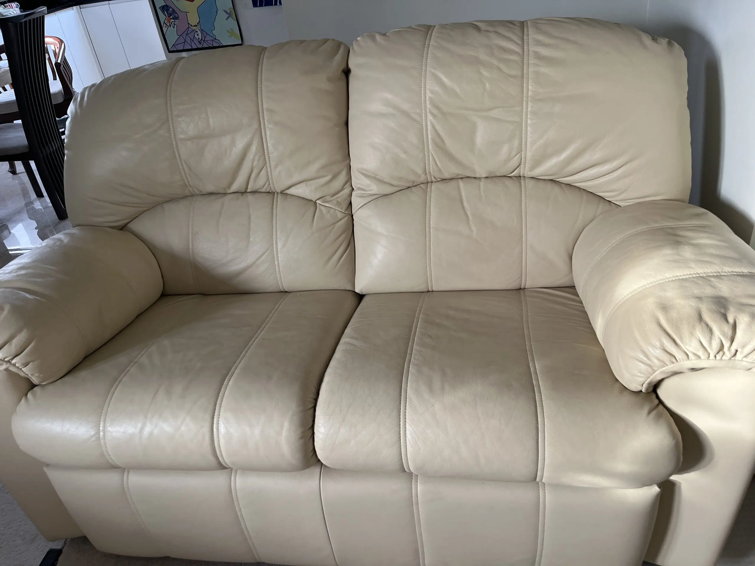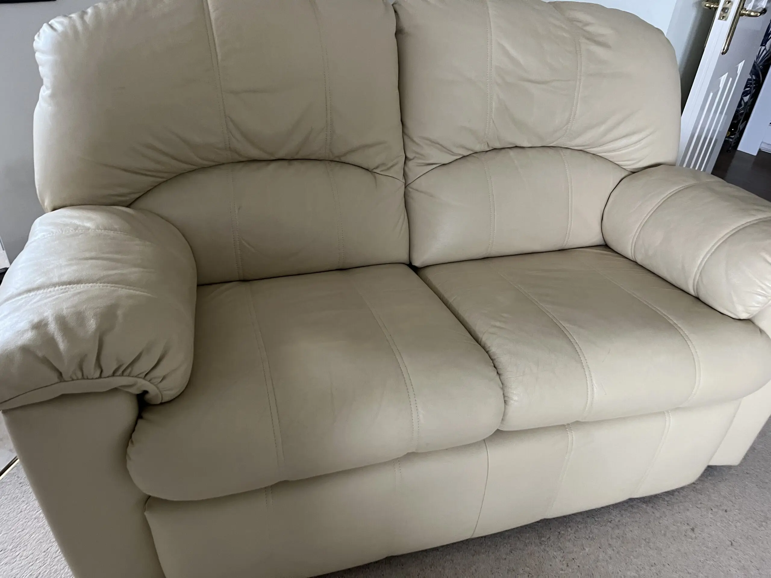 2 x 2 seater sofas. One has a reclining seat. Cream leather. In good condition and from pet and smoke free home. Small damage ‘spot’ ( indicated in picture) on back of sofa that doesn’t have the reclining seat. Would consider selling separately .