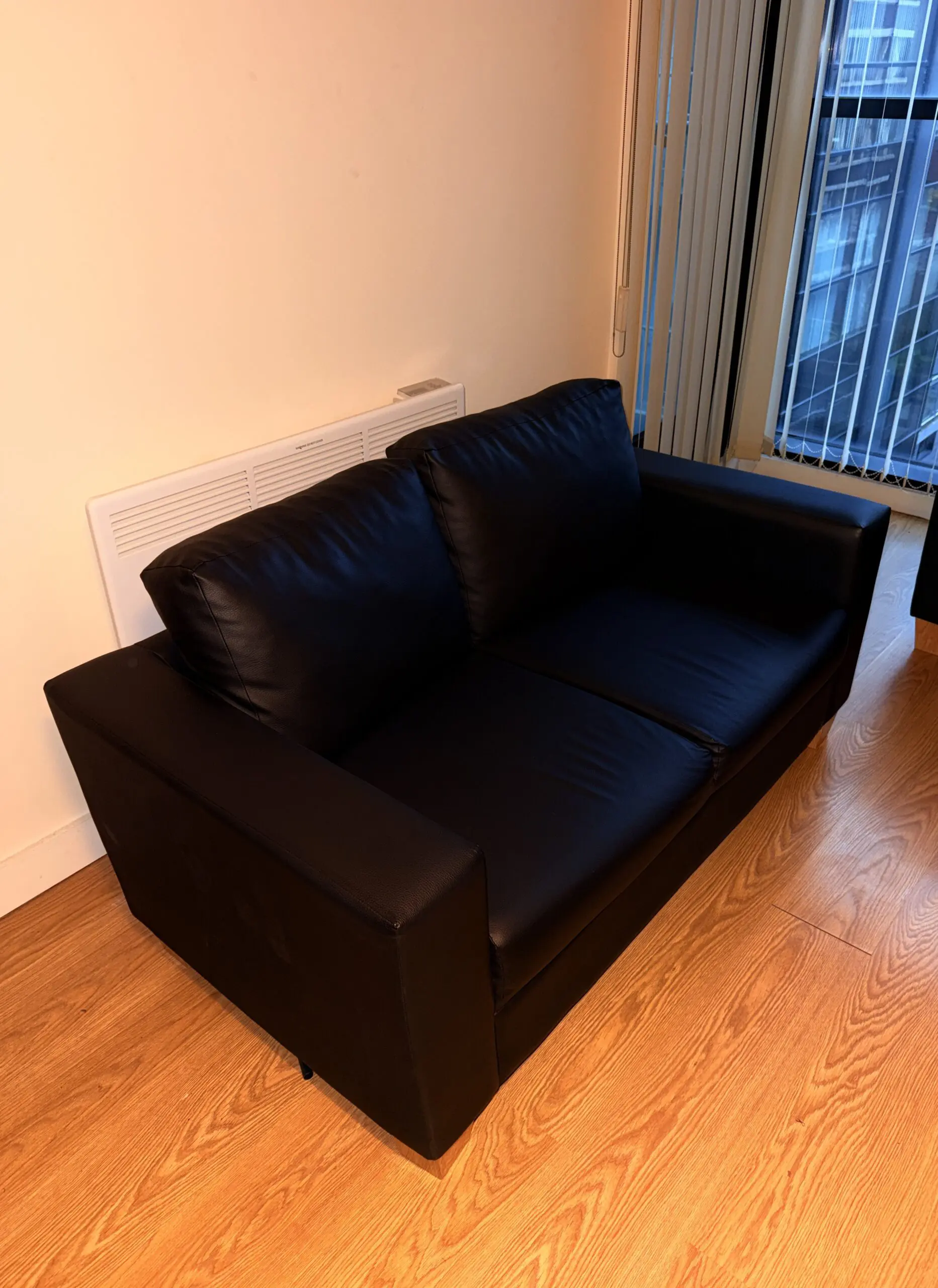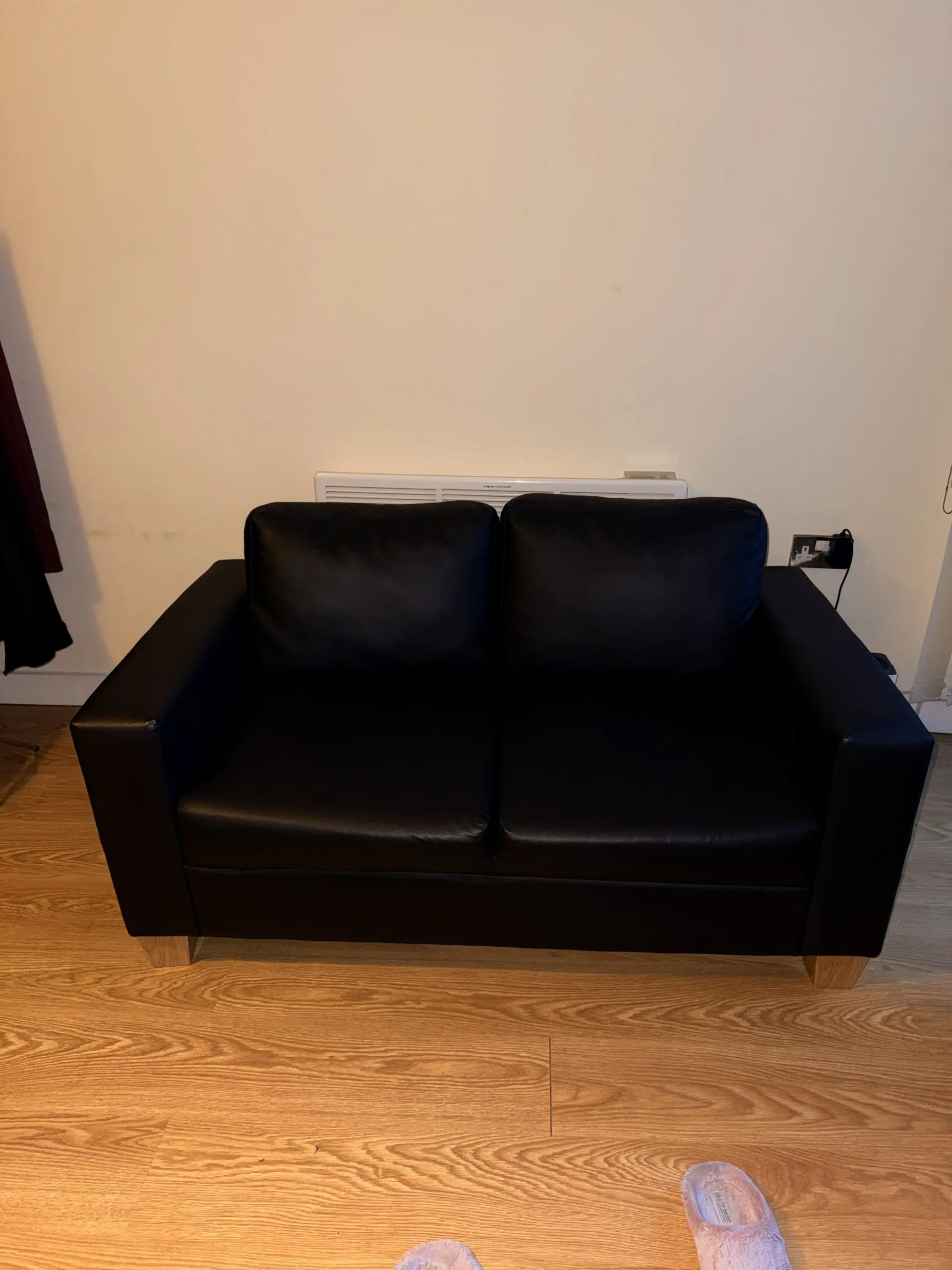 This sleek 2-seater sofa brings contemporary style to any living space with its minimalist design and distinctive metal legs. The clean, geometric lines and compact proportions make it perfect for modern homes, apartments, or smaller rooms. Comfortable seating for two with well-padded cushions and supportive backrests. The sophisticated dark finish and modern aesthetic will complement a wide range of interior styles, from industrial to Scandinavian decor.