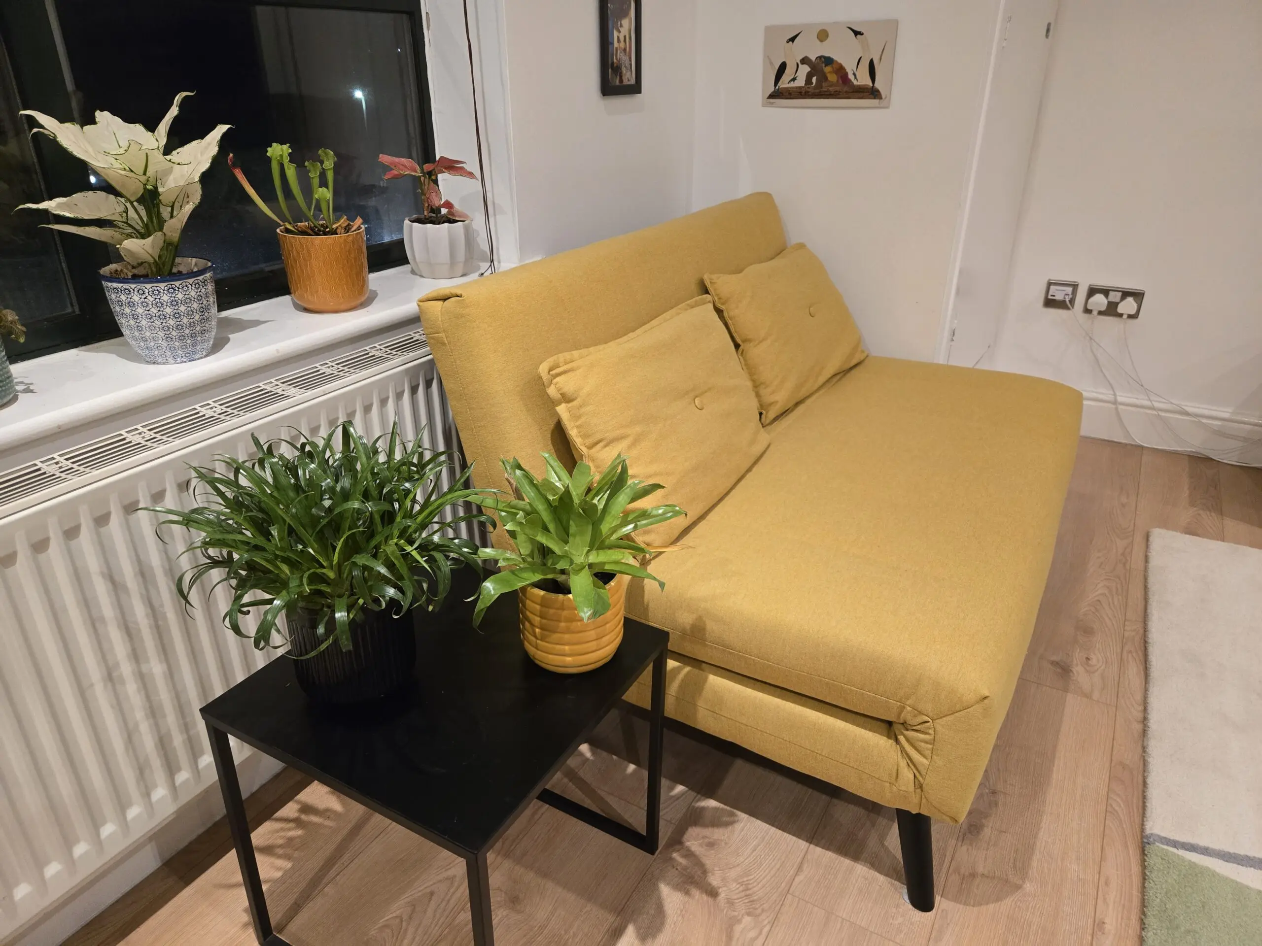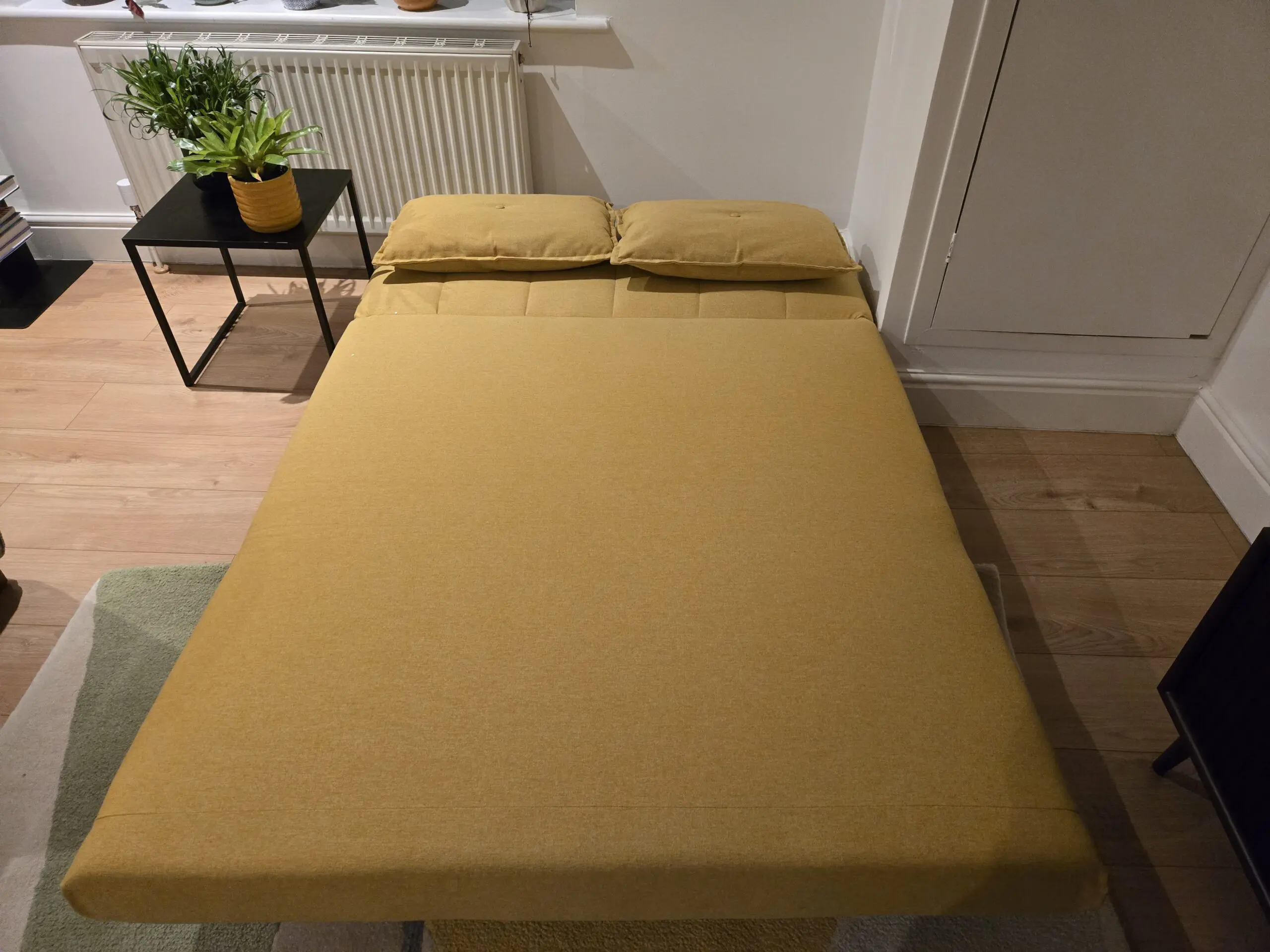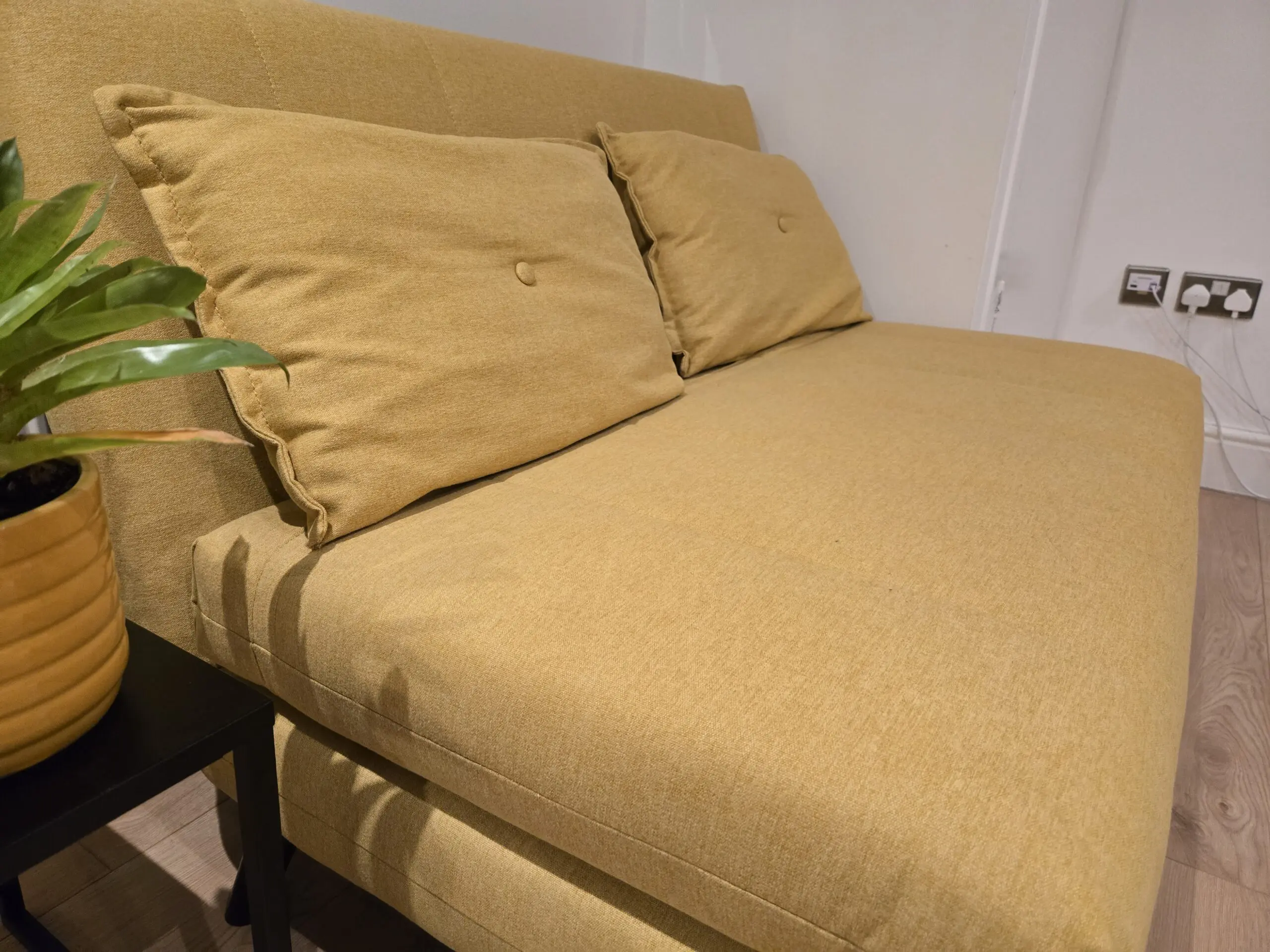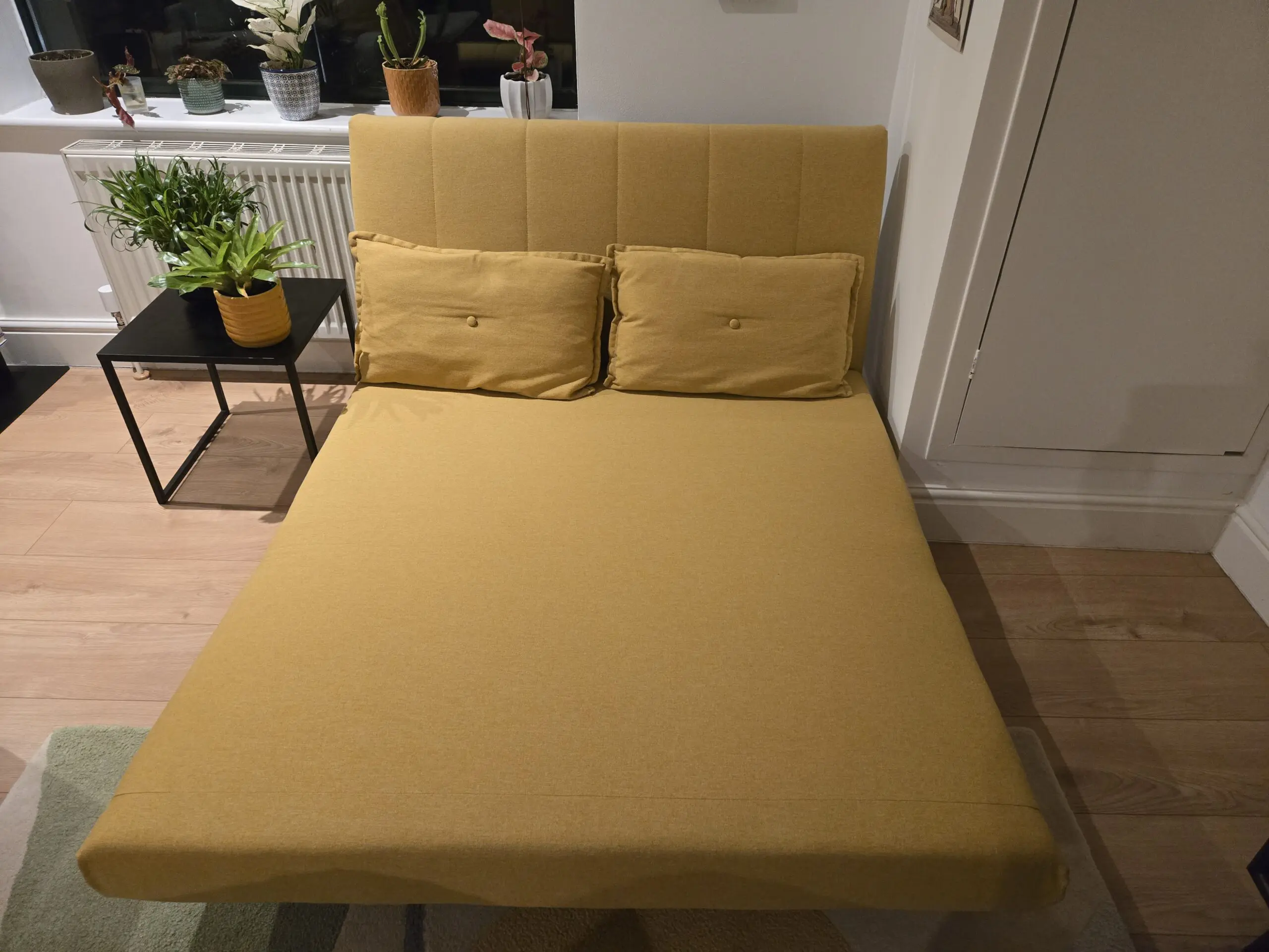Click clack mustard yellow fabric sofa bed. Extra firm to support back, comes with 2x decorative cushions