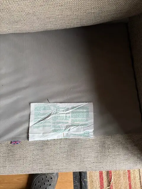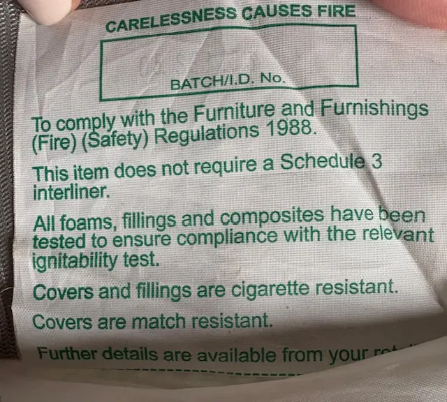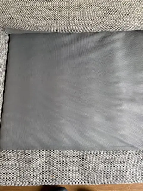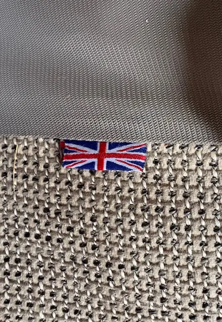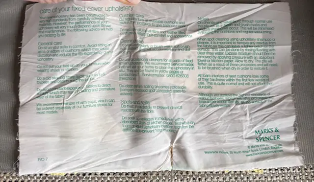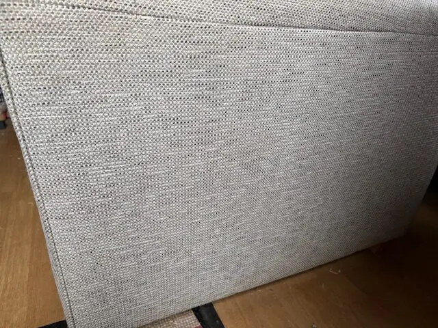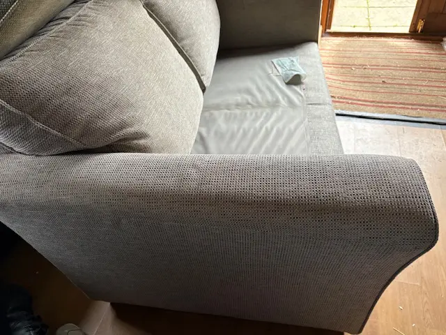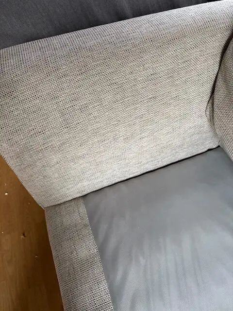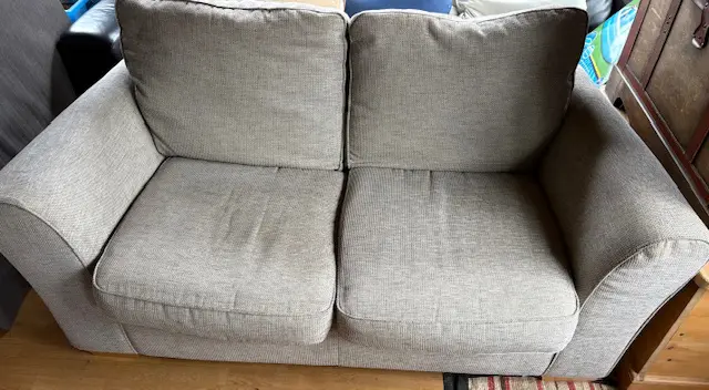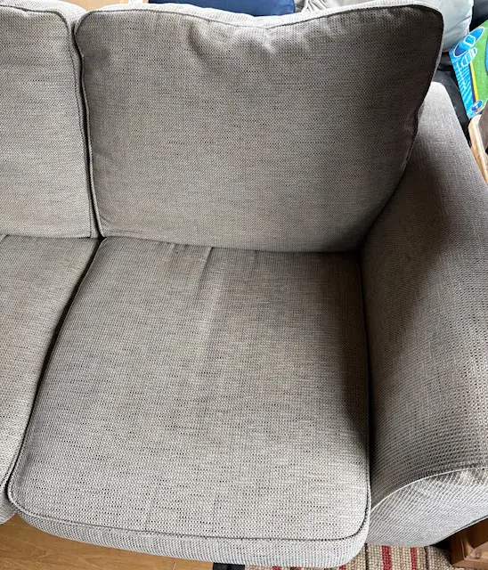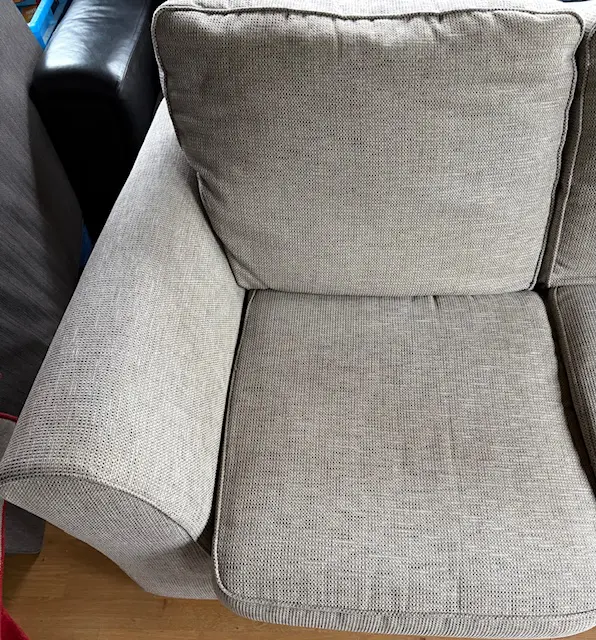 2 seater sofa in a textured grey weave (subtle fleck/two tone in the weave) with relatively broad, sloped arms and loose back cushions