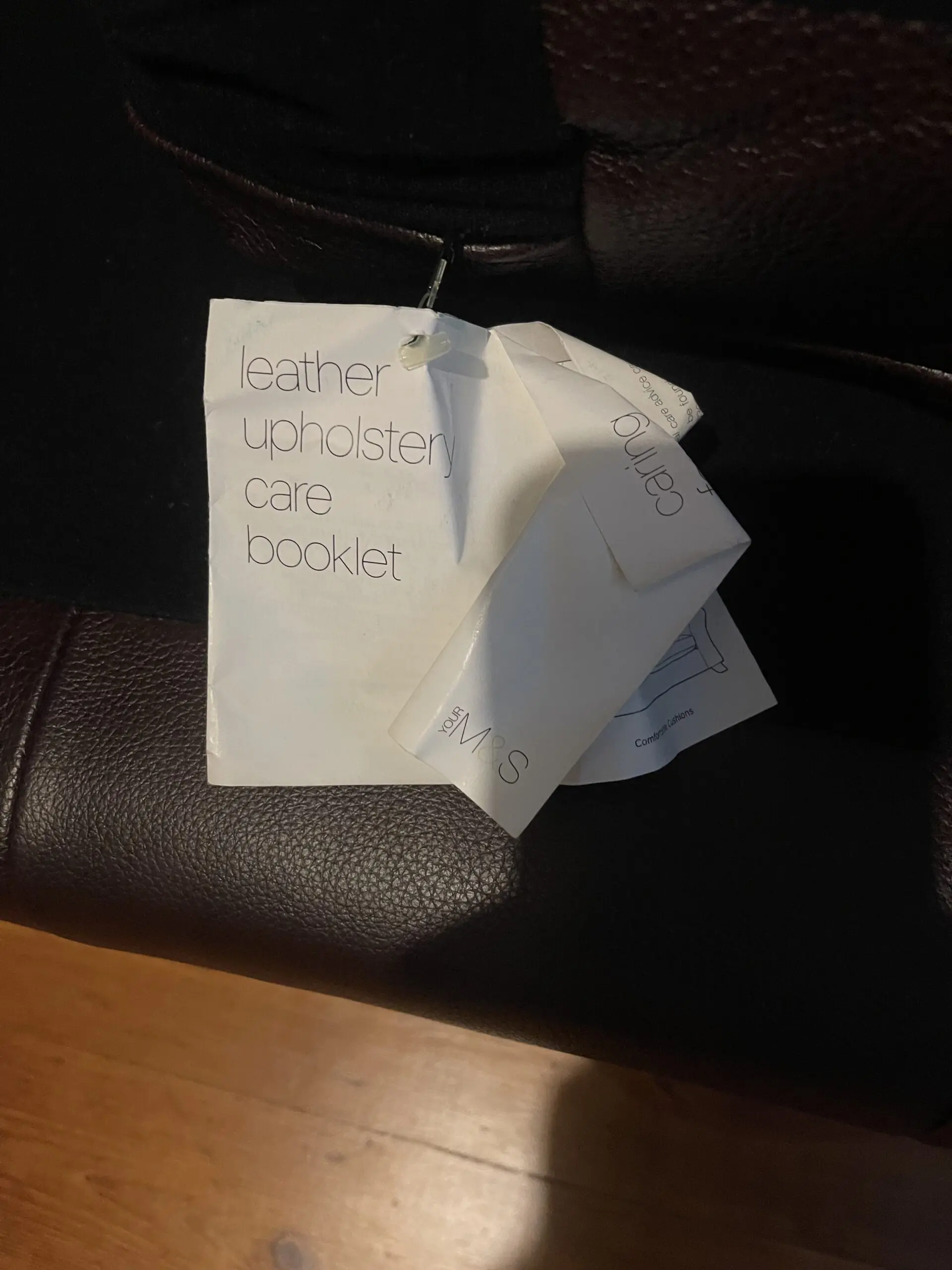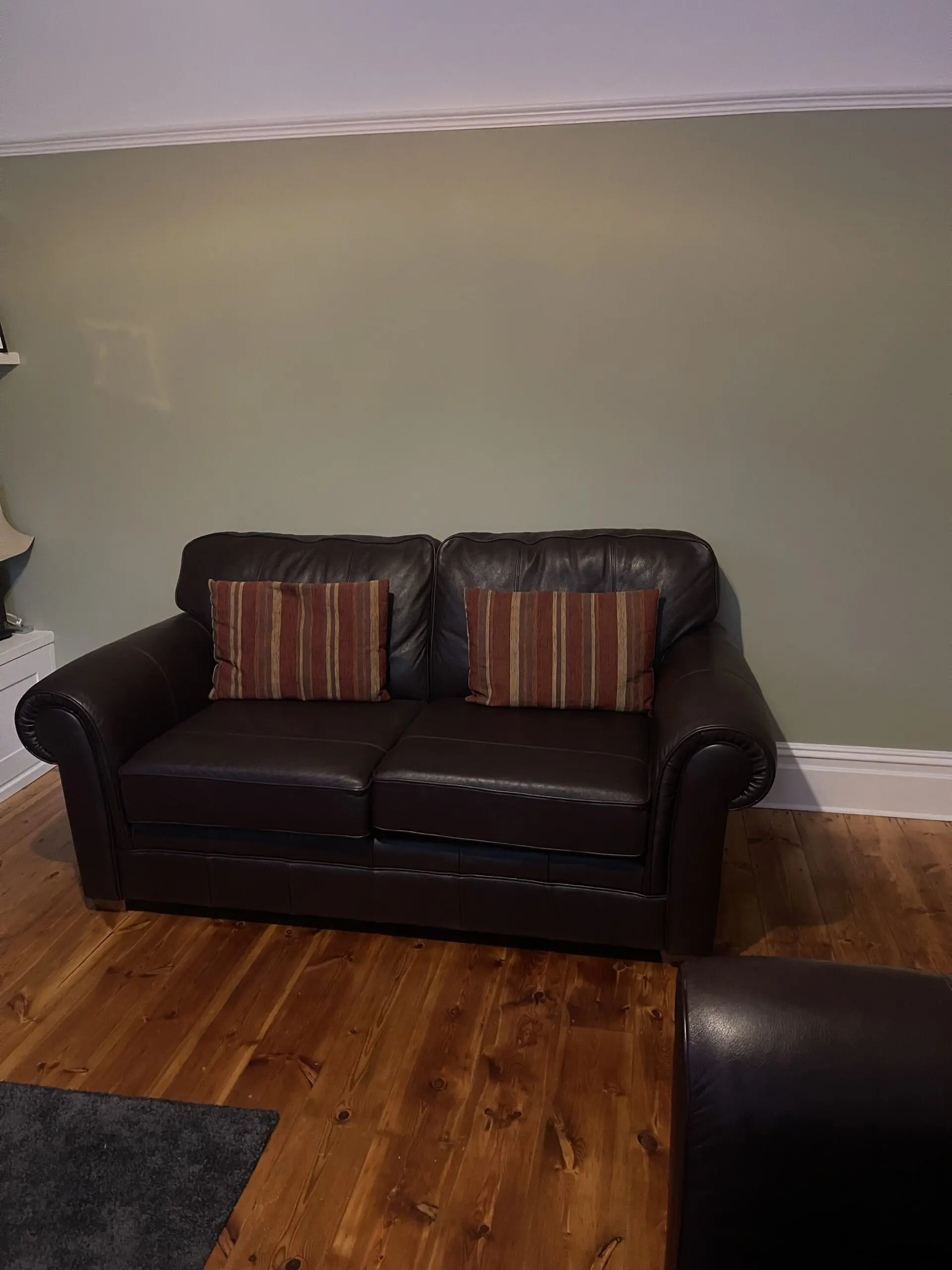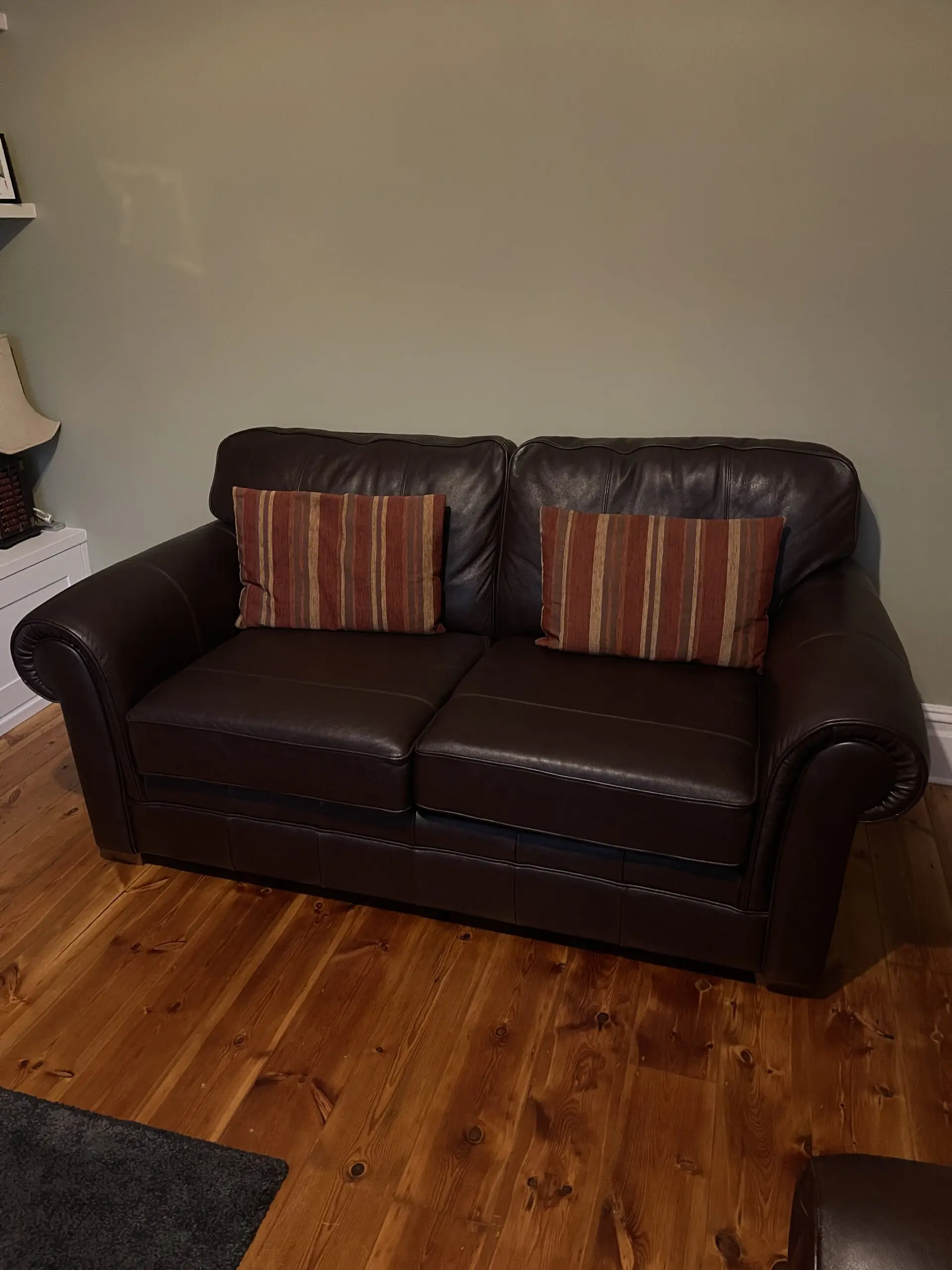 A matching pair of M&S brown leather sofas and cushions. In excellent condition, including labels. Purchased new in 2008, little used.