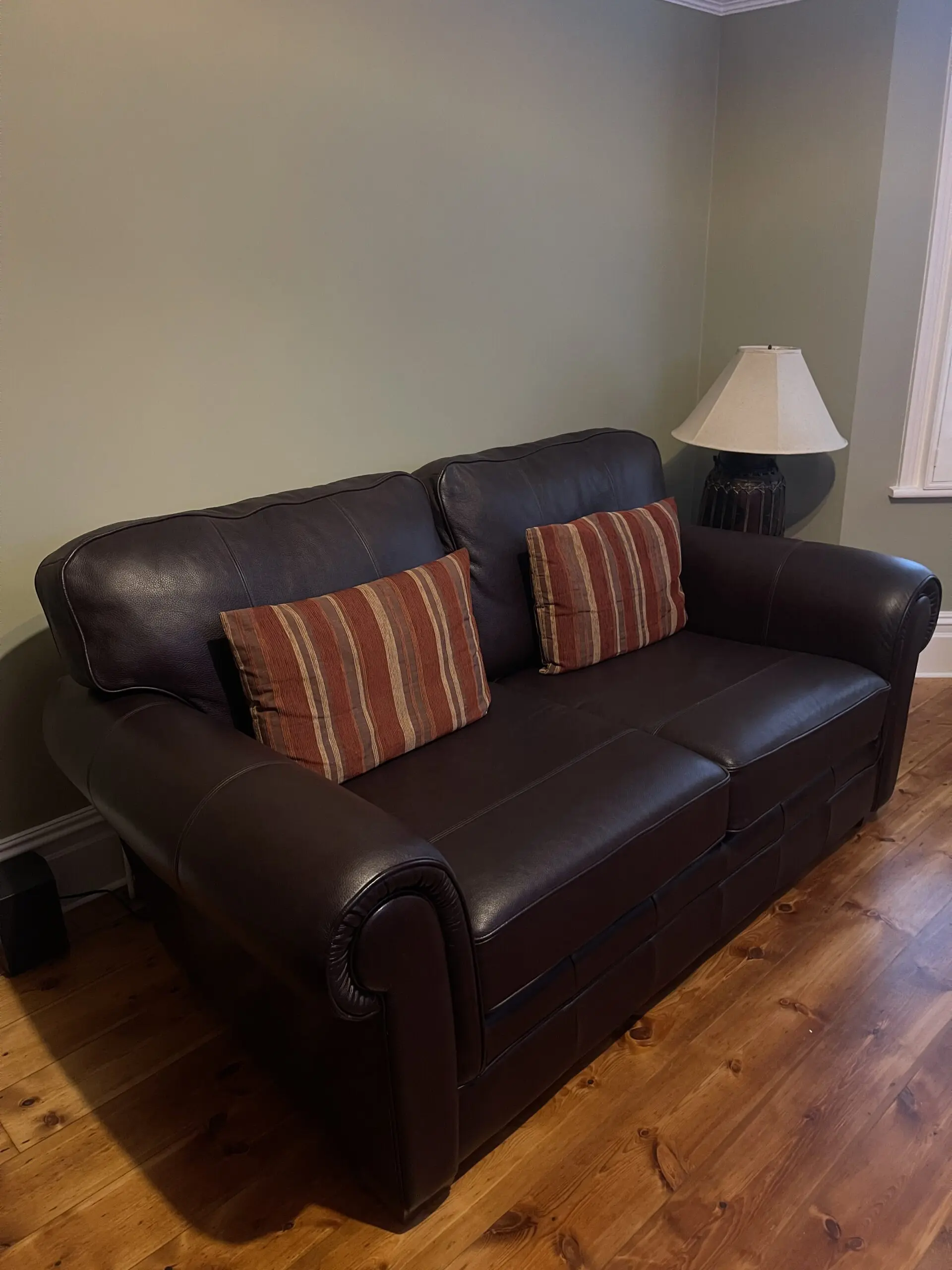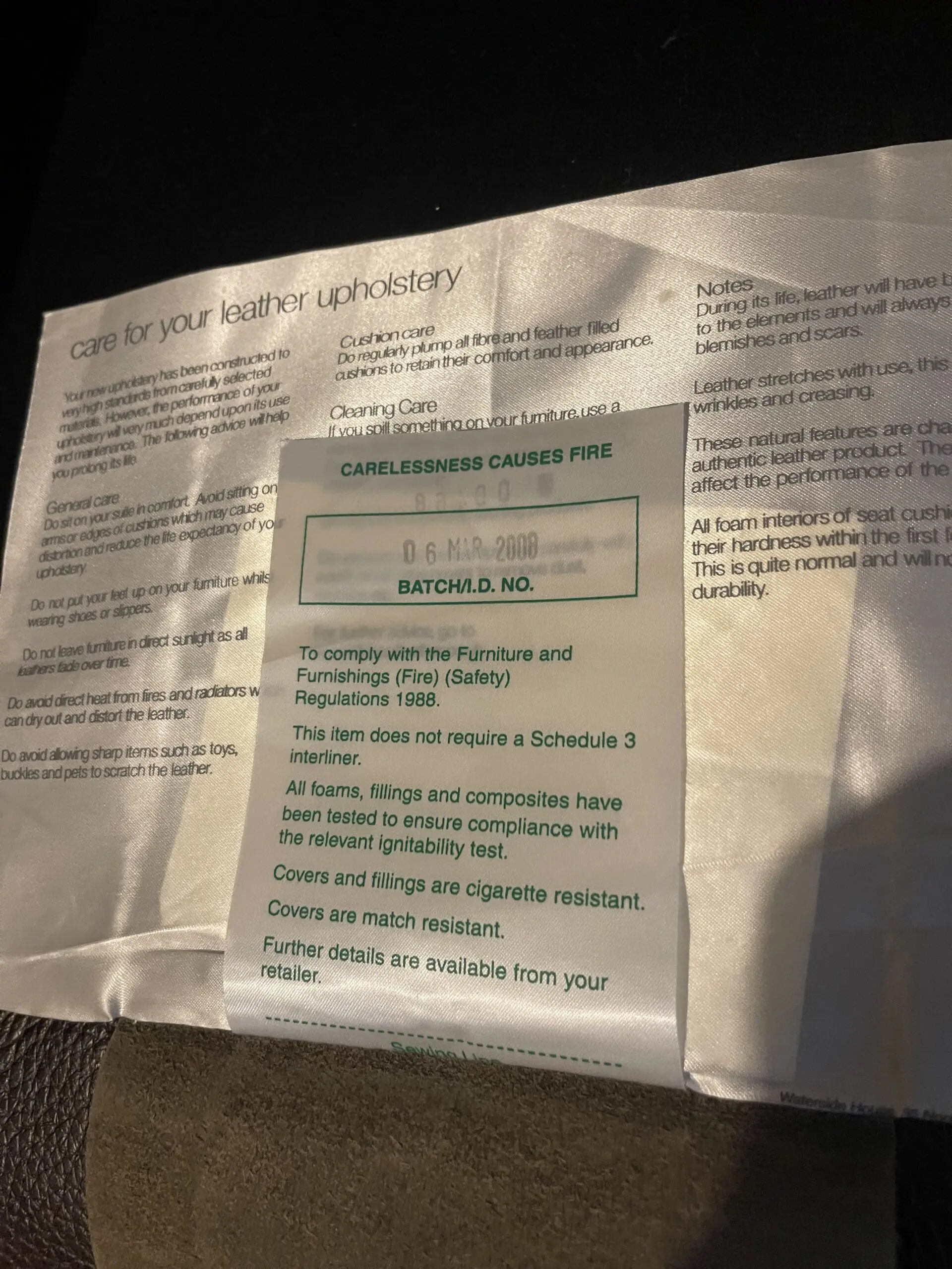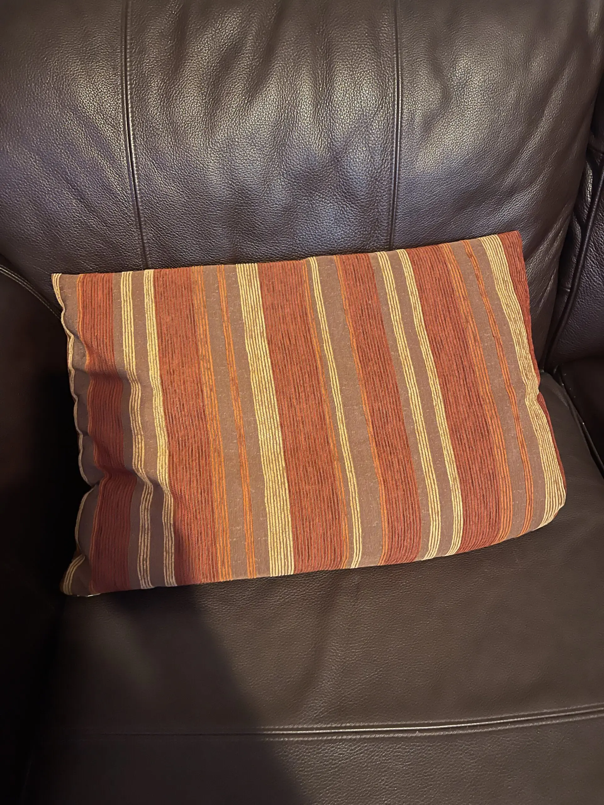 A matching pair of M&S brown leather sofas and cushions. In excellent condition, including labels. Purchased new in 2008, little used.
