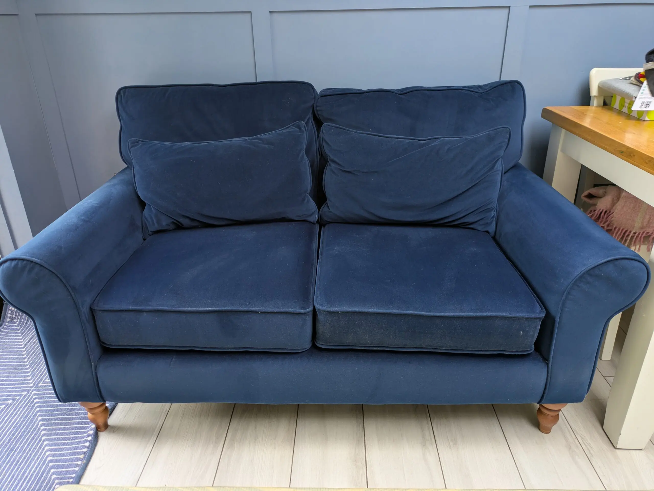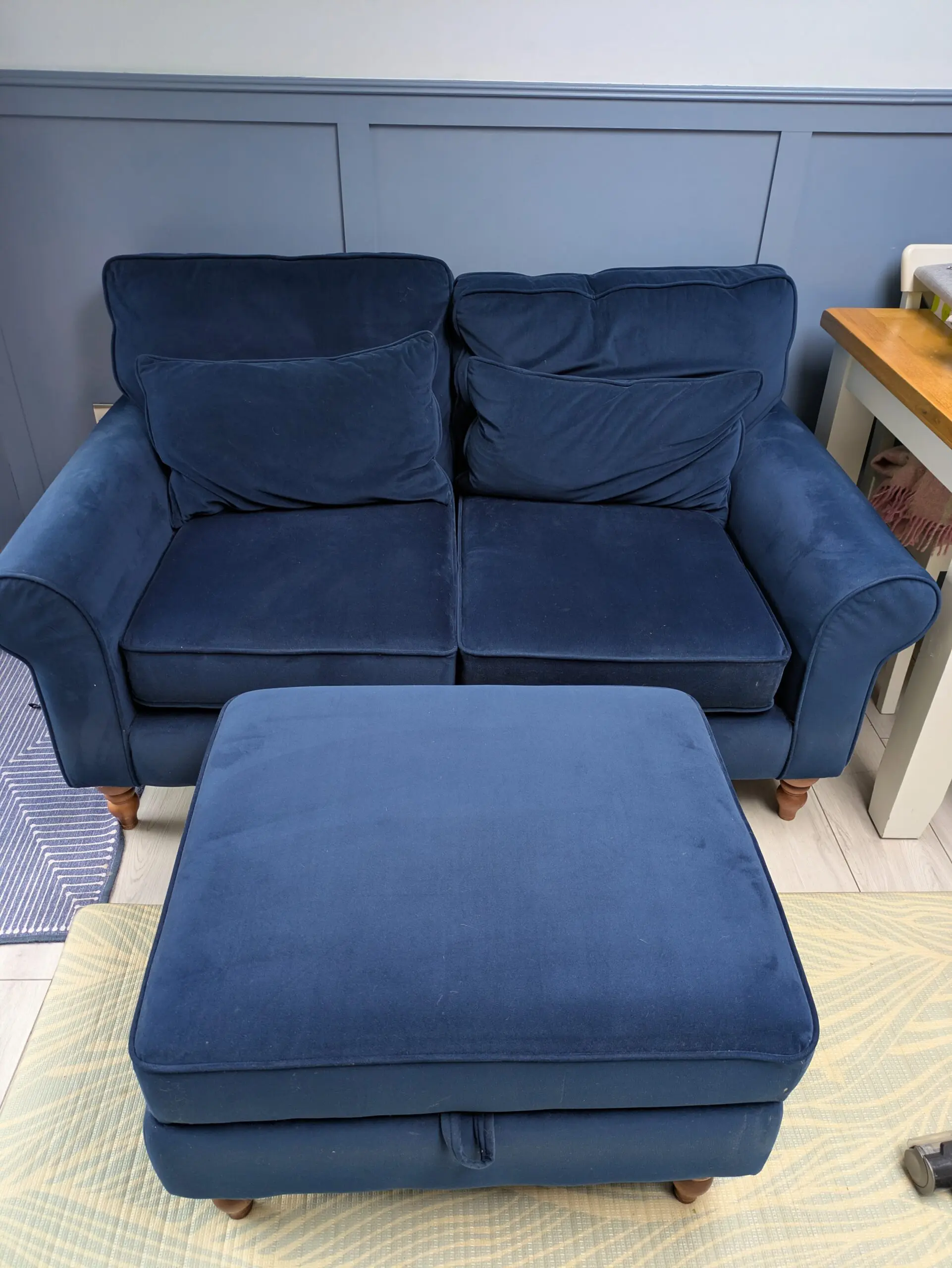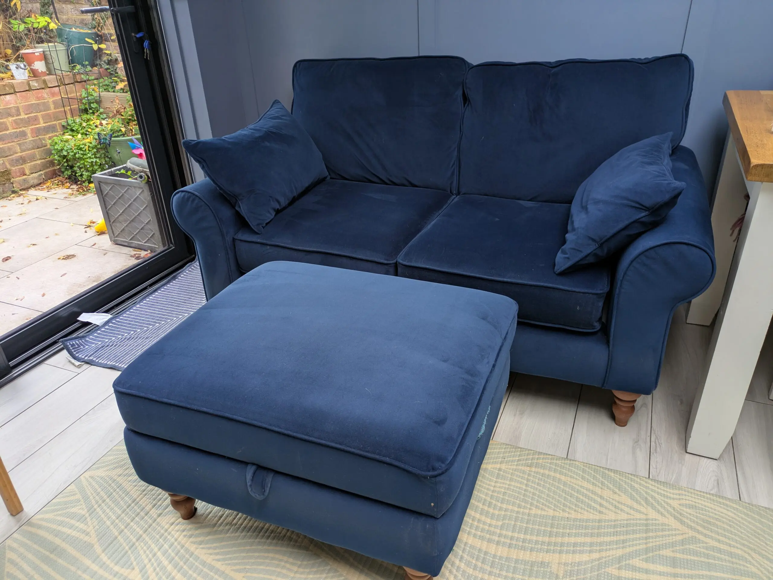 Next two seater Mallory sofa with foot stool. Navy blue plush velvet easy clean fabric. Bought 3 years ago but replacing now with a sofa bed.