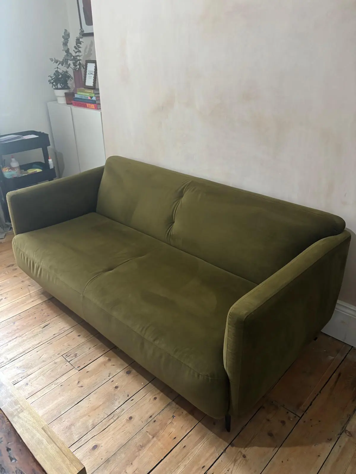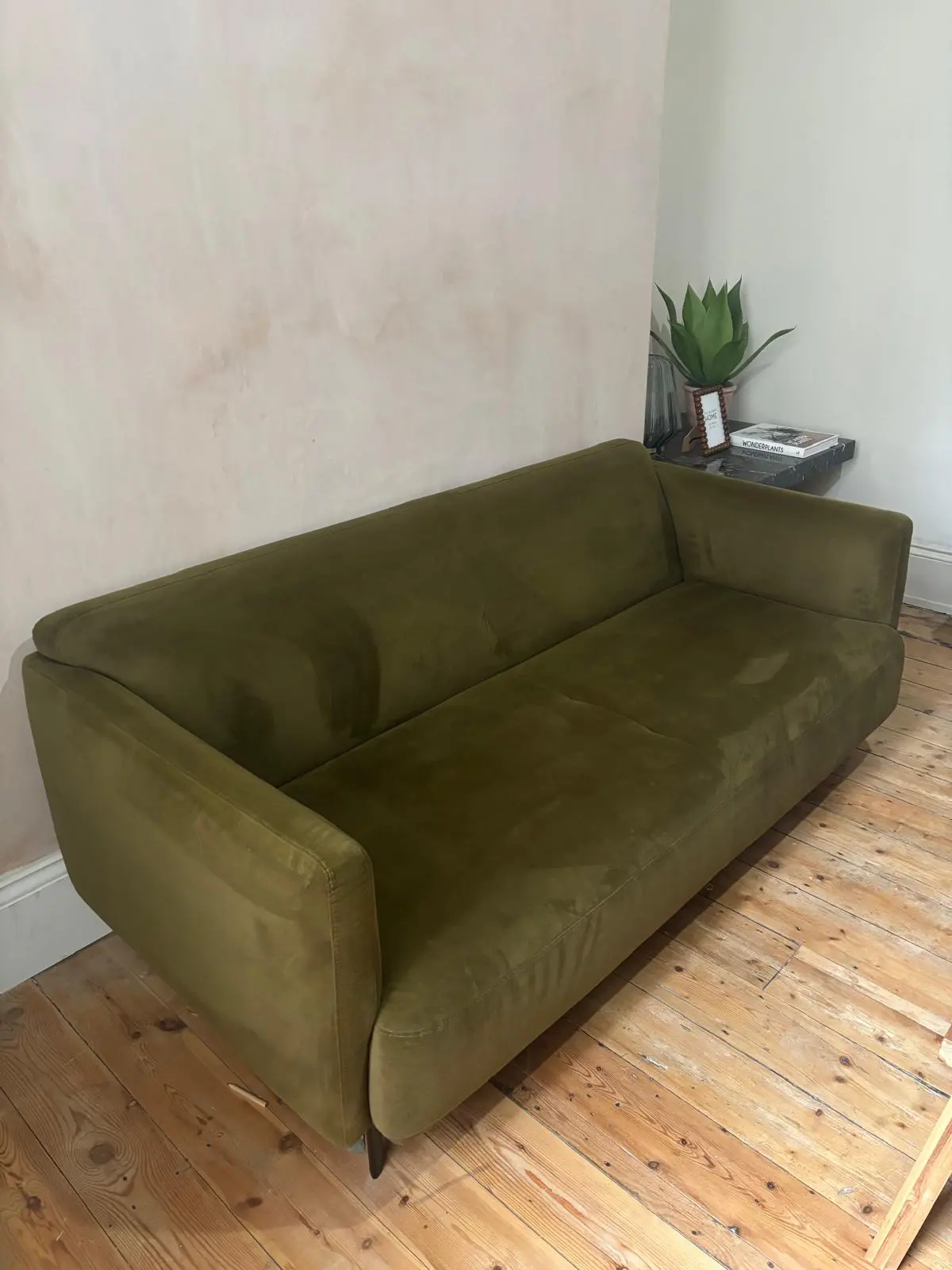 slight scuff to back of chair from attempting to get it up to our attic bedroom (wouldn’t fit hence why selling) some faint marks which would come out with a professional clean I’m sure