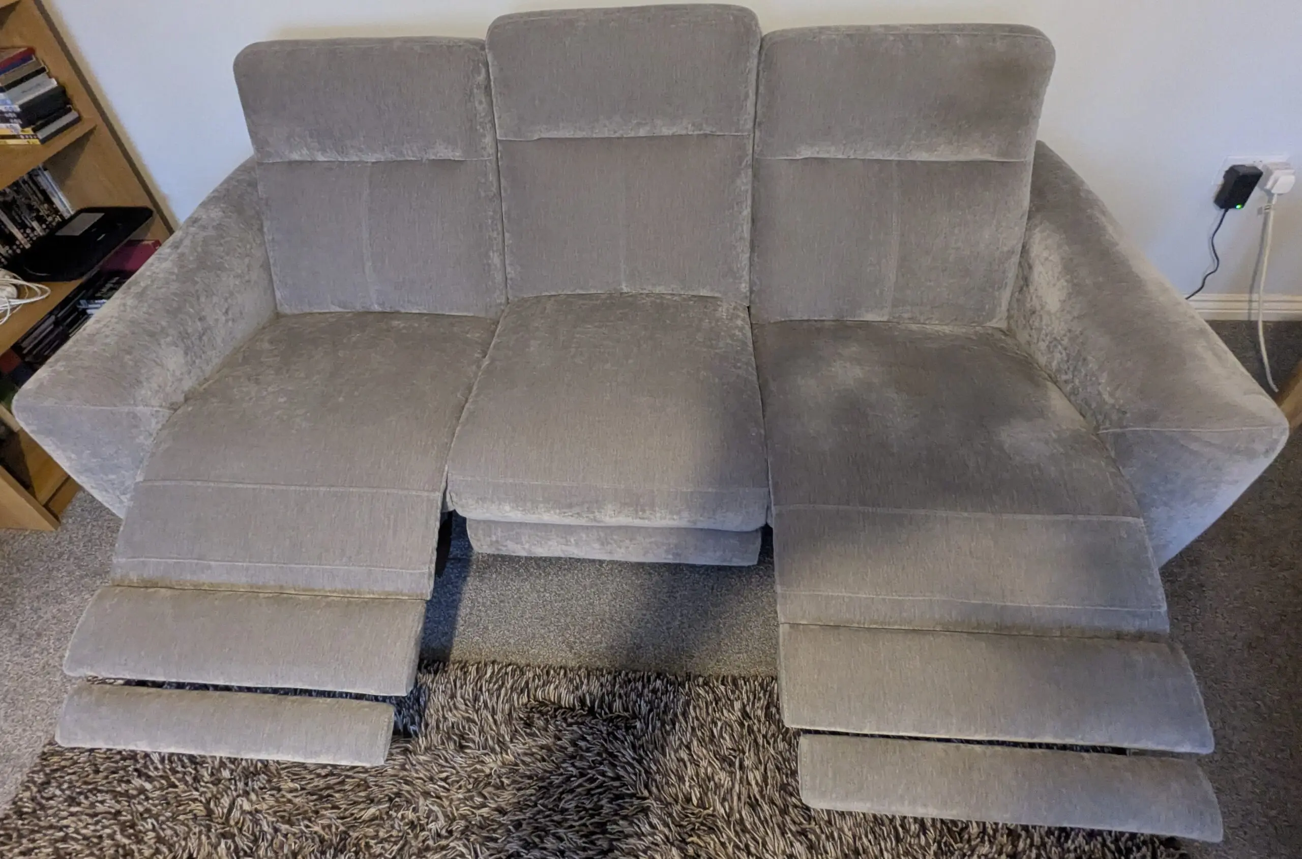 Shown here in Amigo granite, will add a touch of smart, modern design to your living room. Characterized by a sturdy frame, fixed, foam-filled seats, quality back support, and slim oak feet, our3-seater recliner sofa is available in three different fabrics and a range of beautiful neutral shades with colour-matched stitching. The result is a neat, textured look, so you can always snuggle up in style. This 3-seater sofa comprises three sections, one static middle section between two power recliners. The electric reclining mechanism can be operated using two buttons on either arm. Next to both these sets of controls is a USB port, so you and your loved ones can rest for long periods of time, charging your devices as you use them. Our 3-seater recliner sofa can be made the star of your existing furniture, or browse the rest of our Dylan range and style yourself a truly coordinated living room suite.