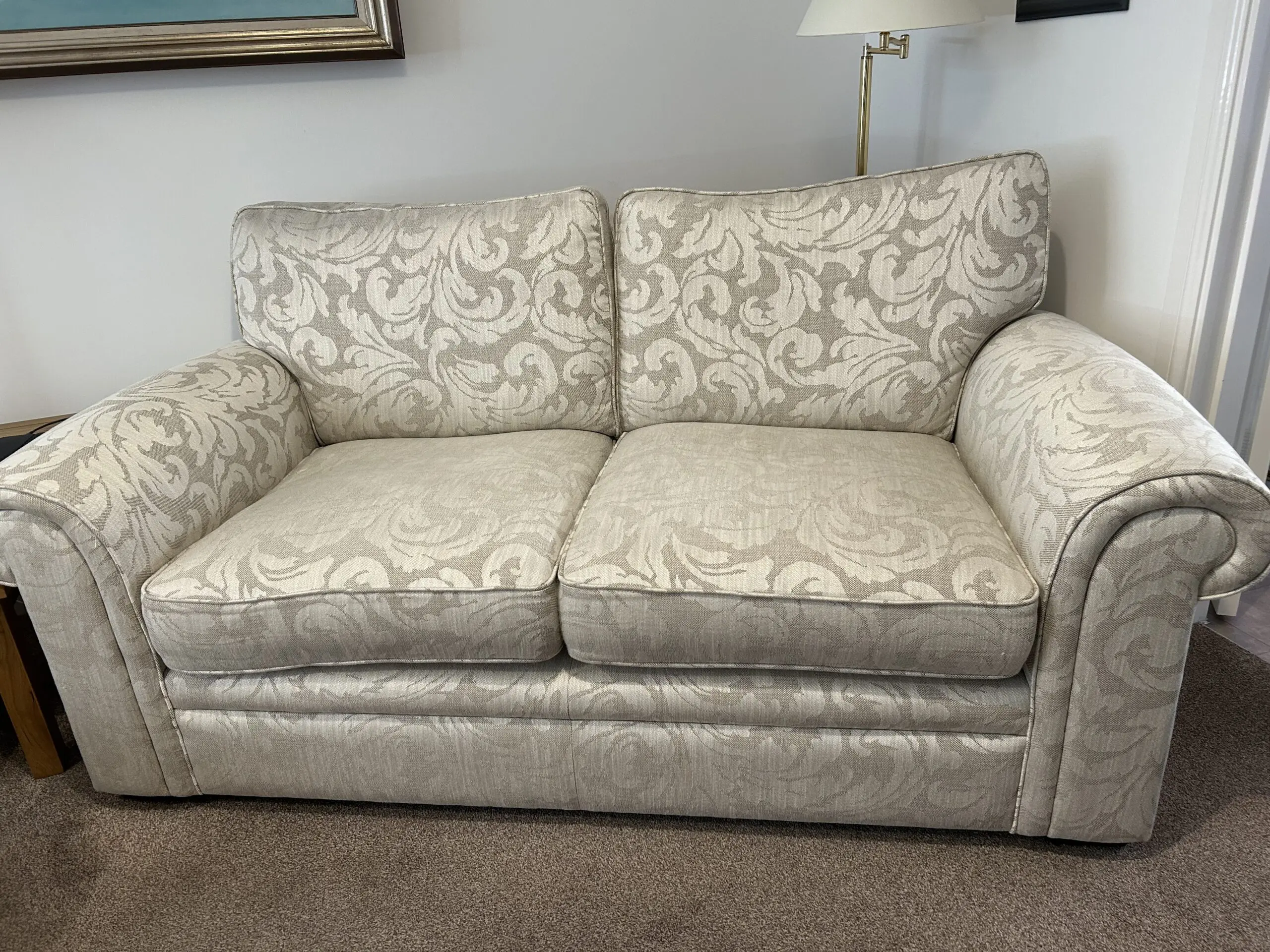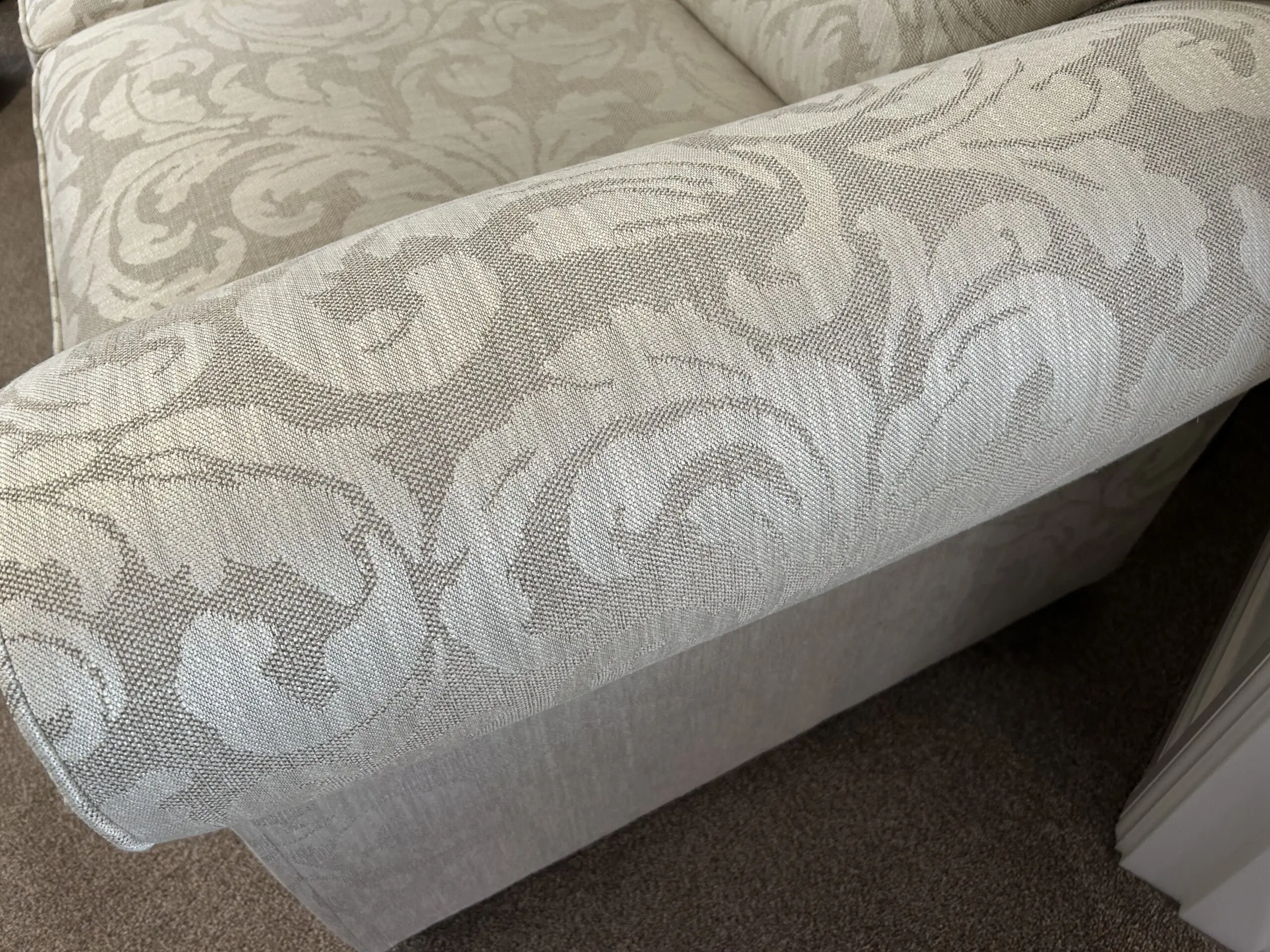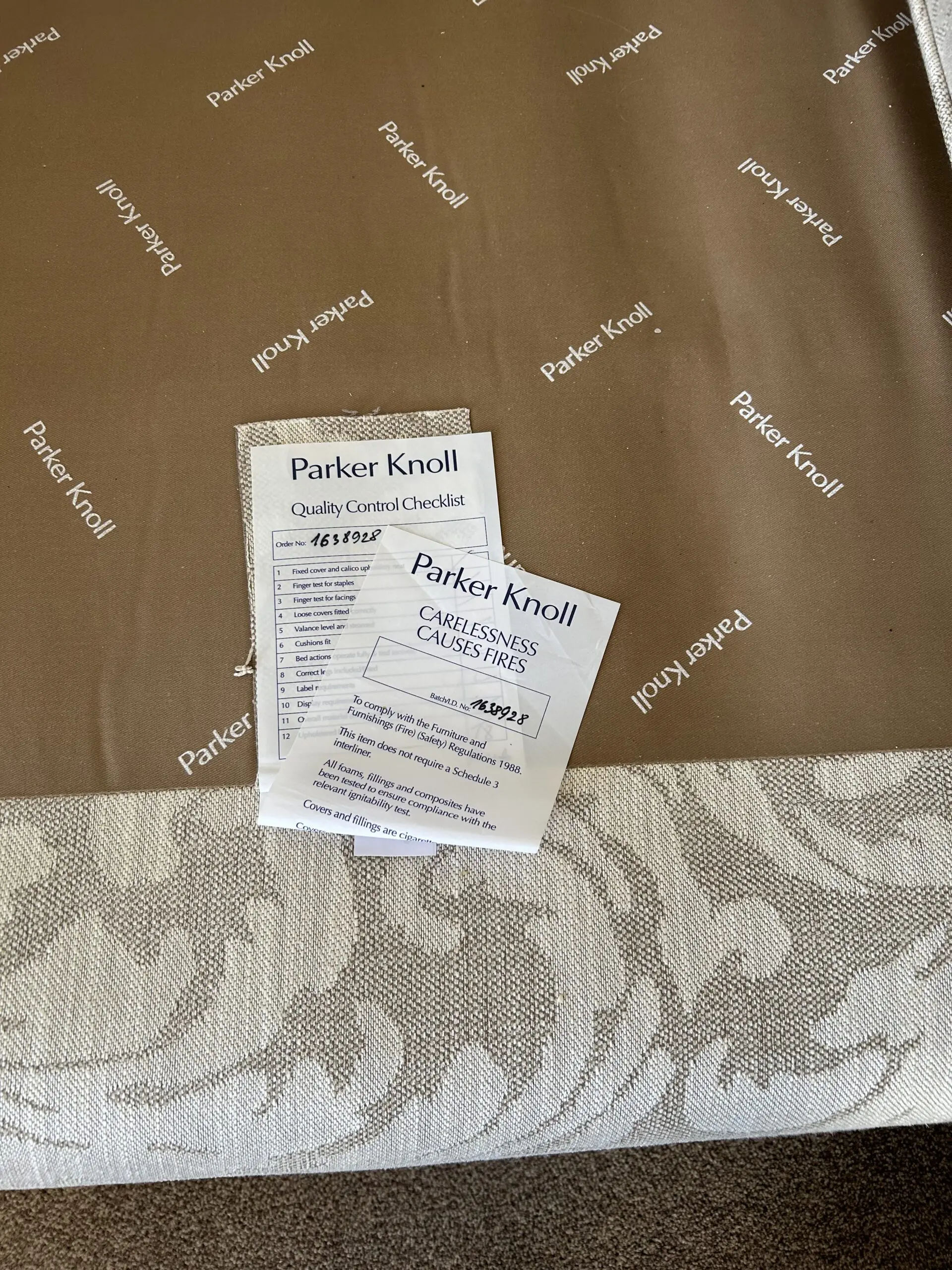 Parker Knoll 2 seater sofa, in oatmeal pattern, just under a year old. Beautiful fabric and immaculate condition. Extra measurement information – Seat H – 53cm, Seat Width – 129cm, Seat Depth – 60cm, Arm Height – 66cm. Seat Interior – Premium Comfort Foam, Mahogany feet.