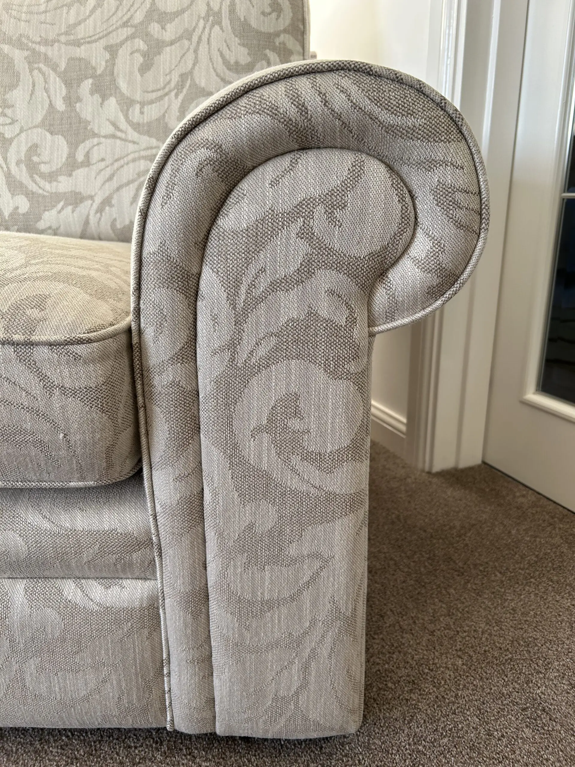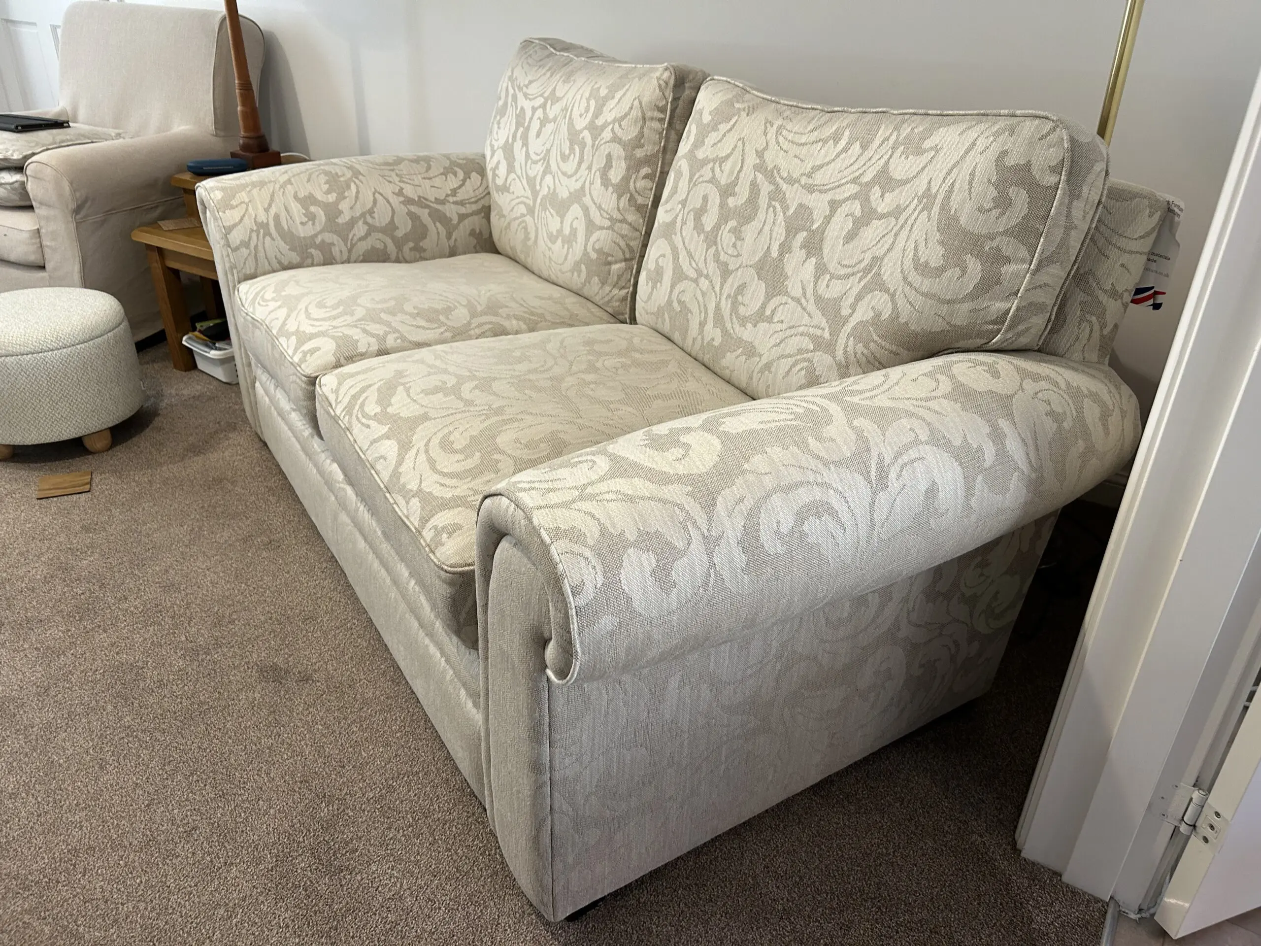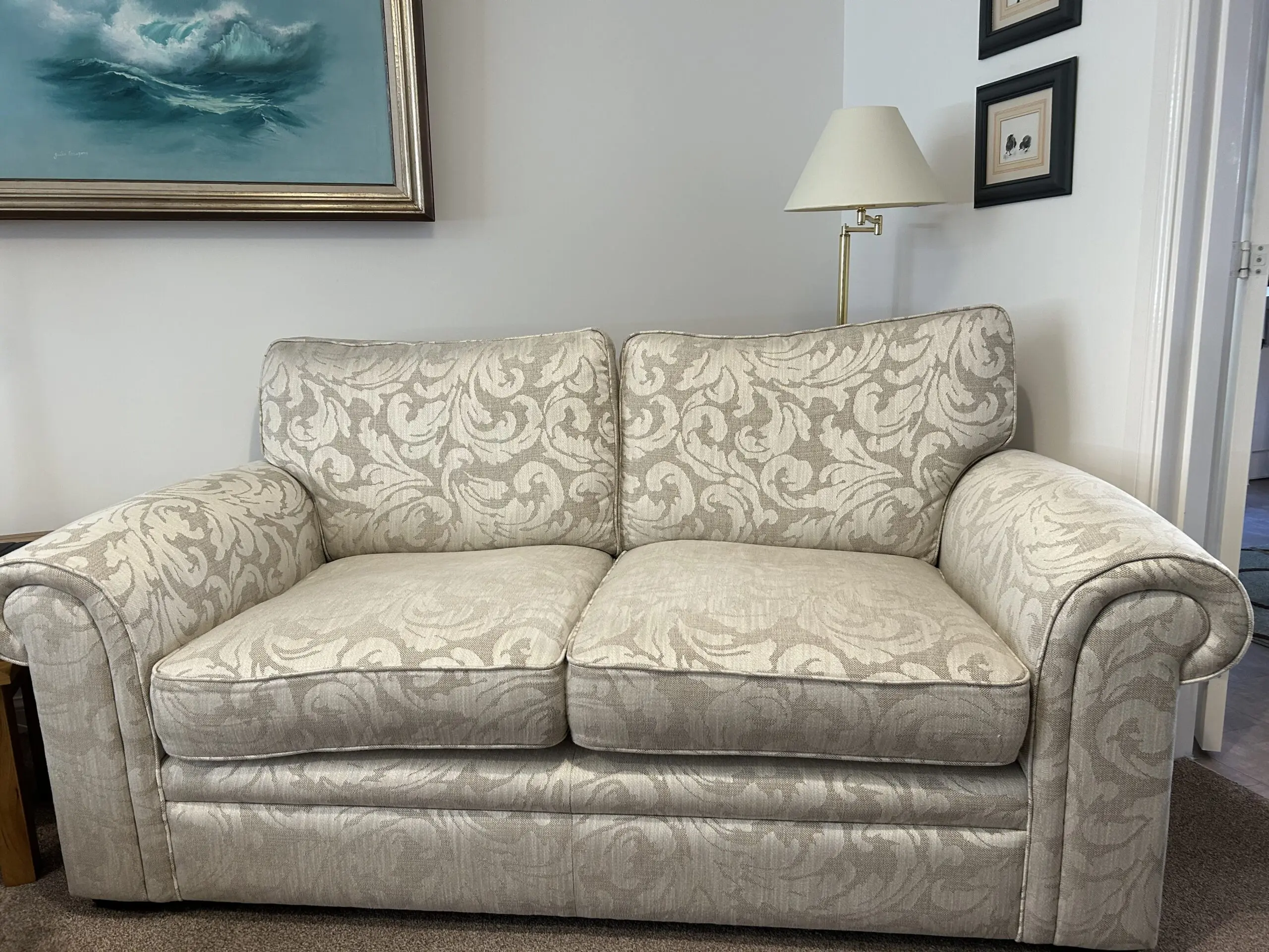 Parker Knoll 2 seater sofa, in oatmeal pattern, just under a year old. Beautiful fabric and immaculate condition. Extra measurement information – Seat H – 53cm, Seat Width – 129cm, Seat Depth – 60cm, Arm Height – 66cm. Seat Interior – Premium Comfort Foam, Mahogany feet.