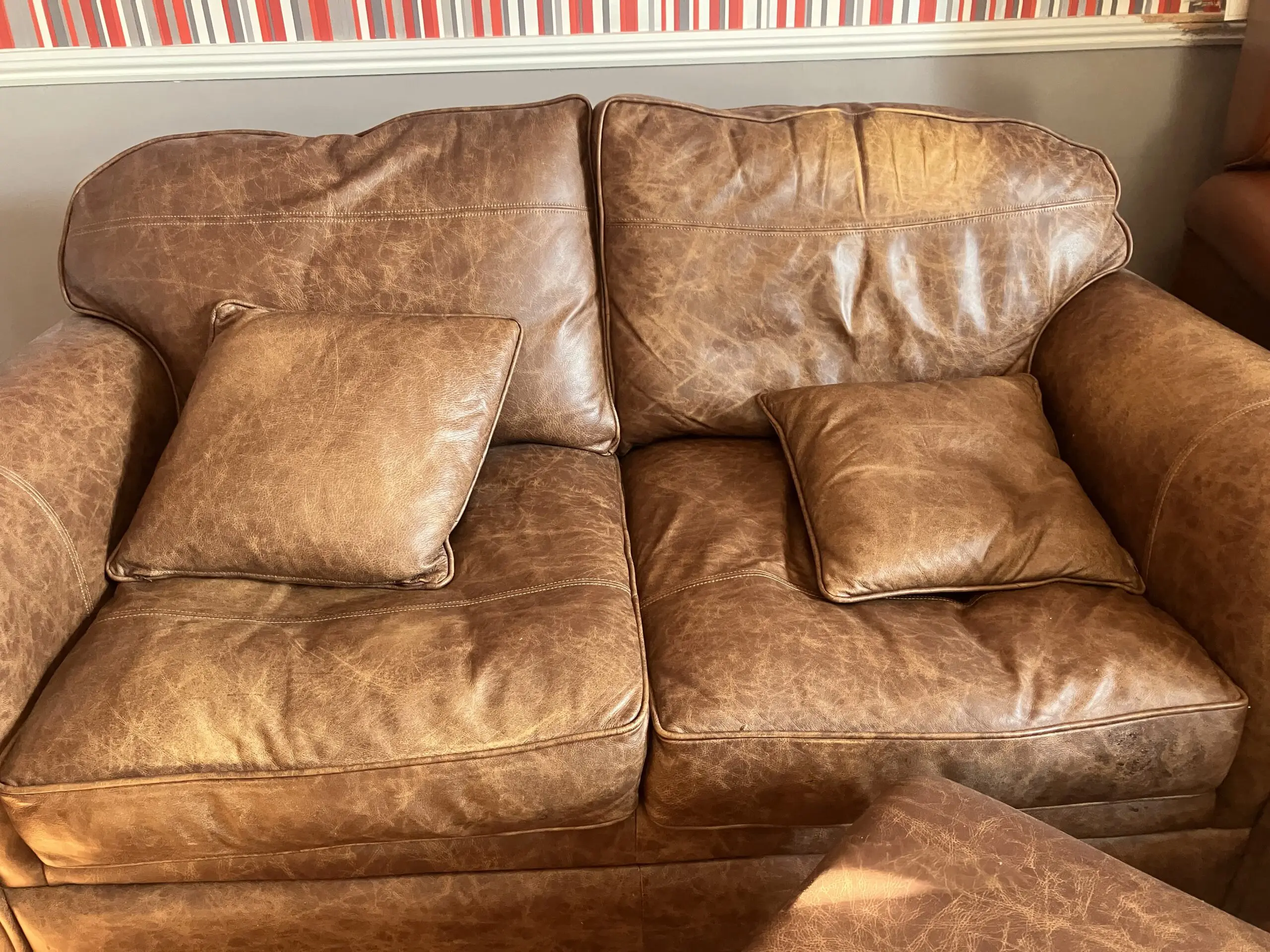 2x 2 seater leather sofas Parker knoll in tan very good condition also comes with ottoman footstool