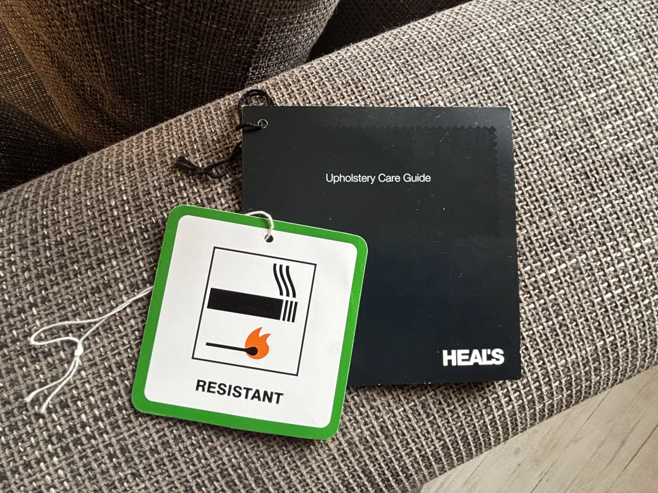 This eleven-year-old sofa has been lovingly cared for and comes with fire resistant certification and Heals cleaning guide.