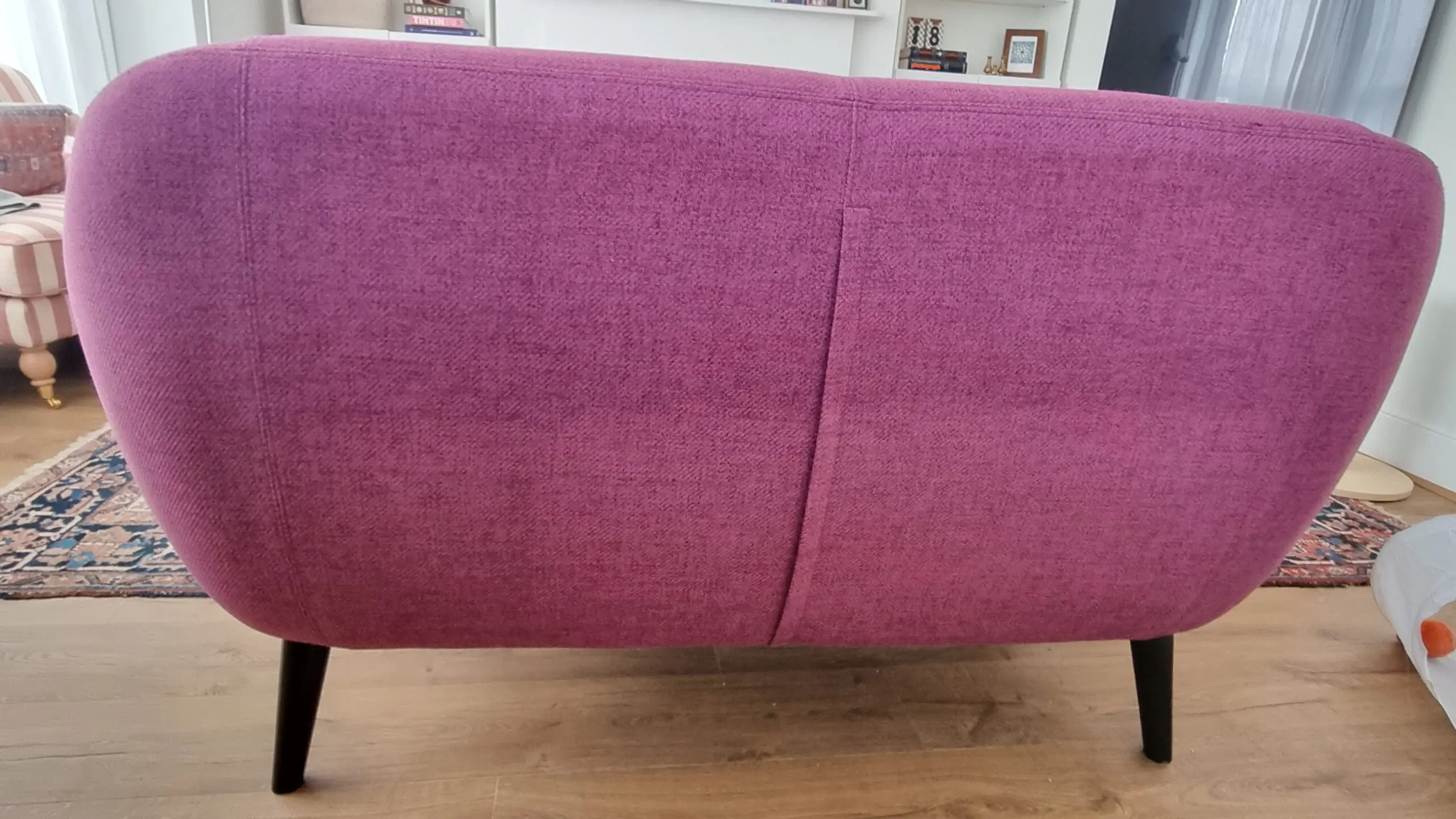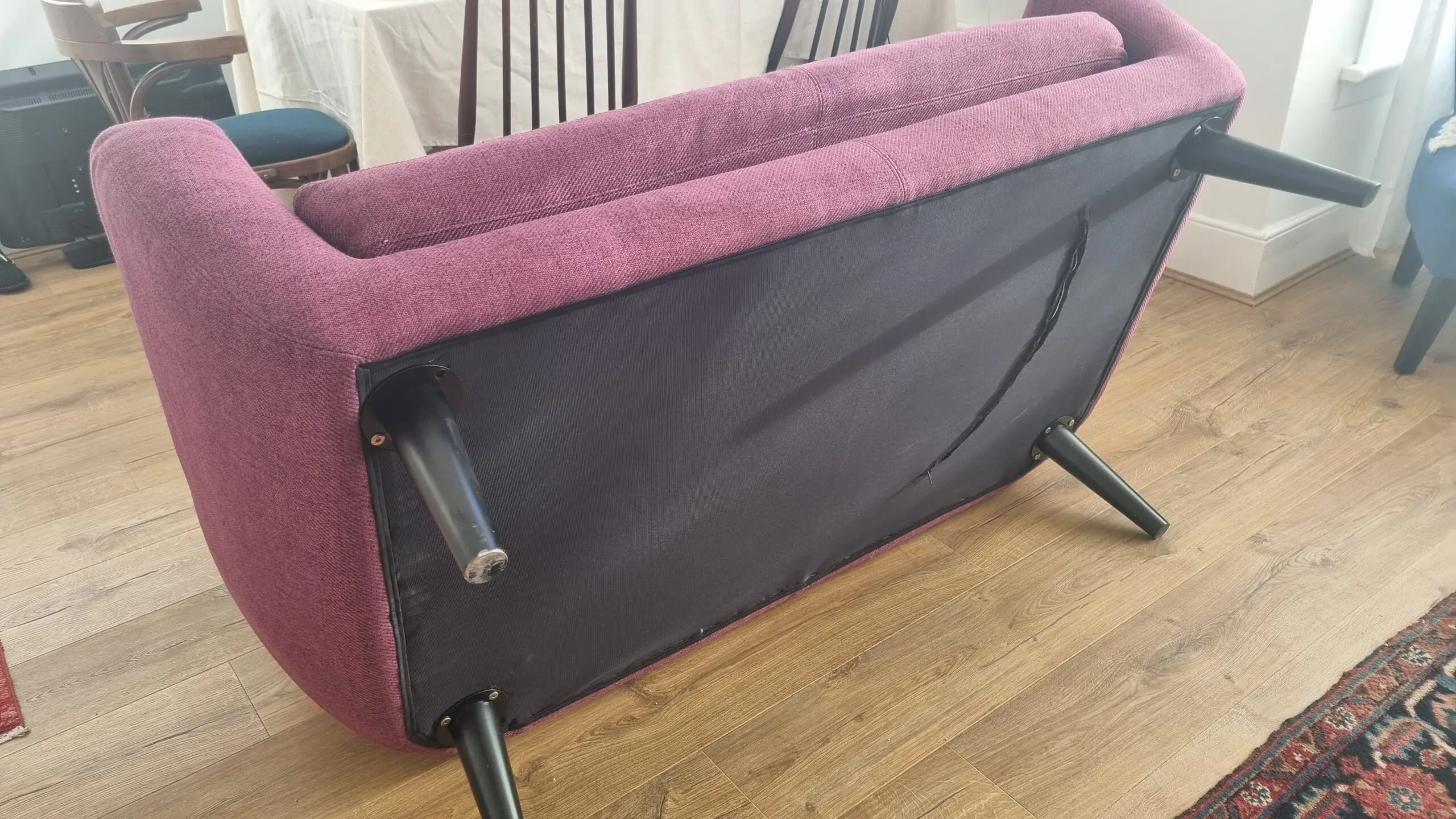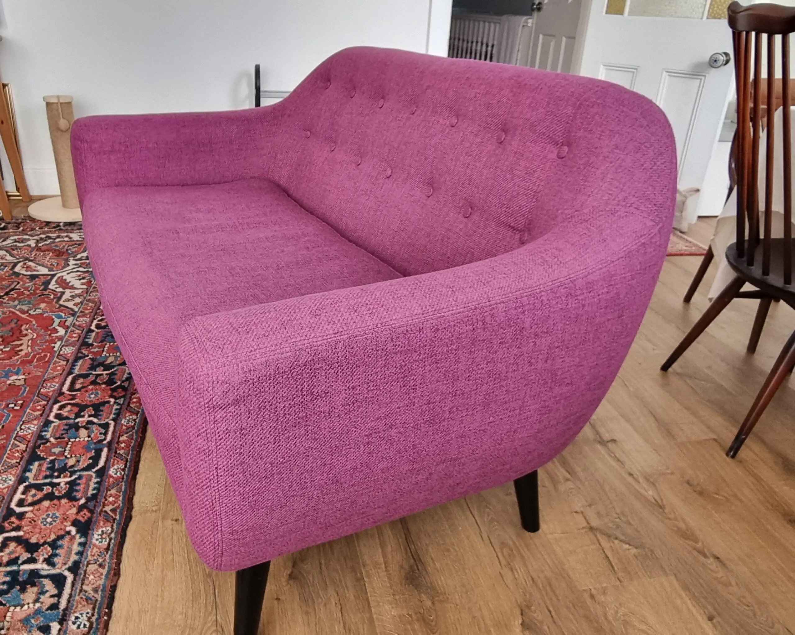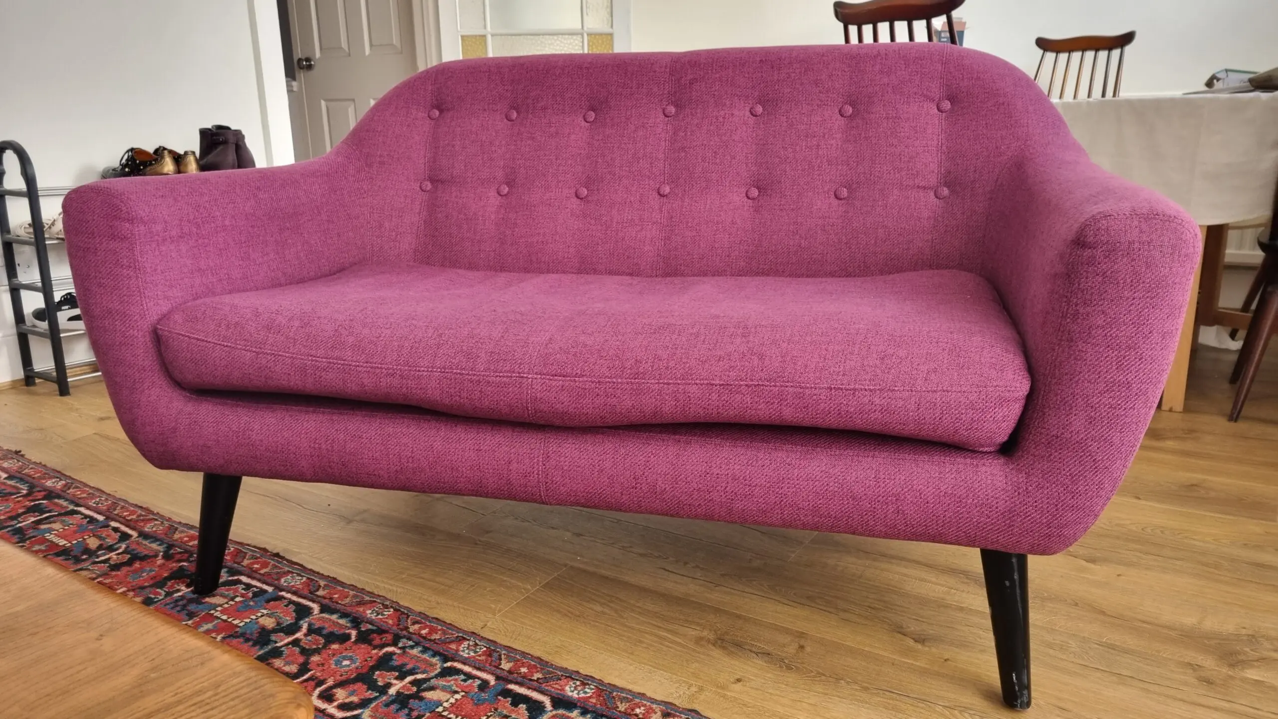Perfect for smaller spaces, the sofa is in great condition with only a little wear on the seat cushion and some scratches on the legs. Legs screw off to help with delivery.