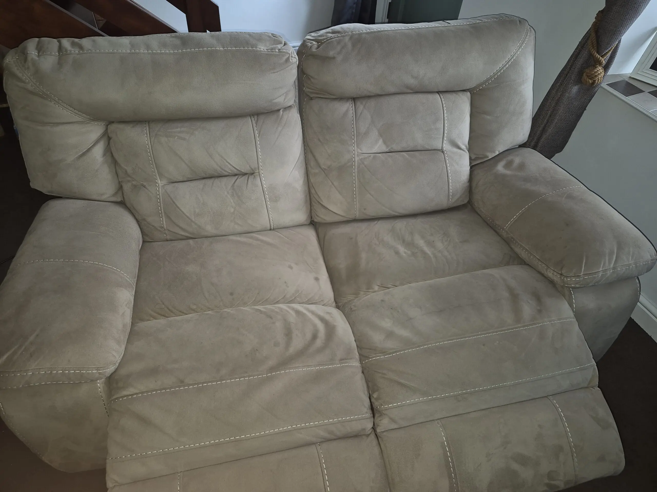 Fully Reclining Powered sofa and chair in good condition. Beige suede effect, viewing highly recommended