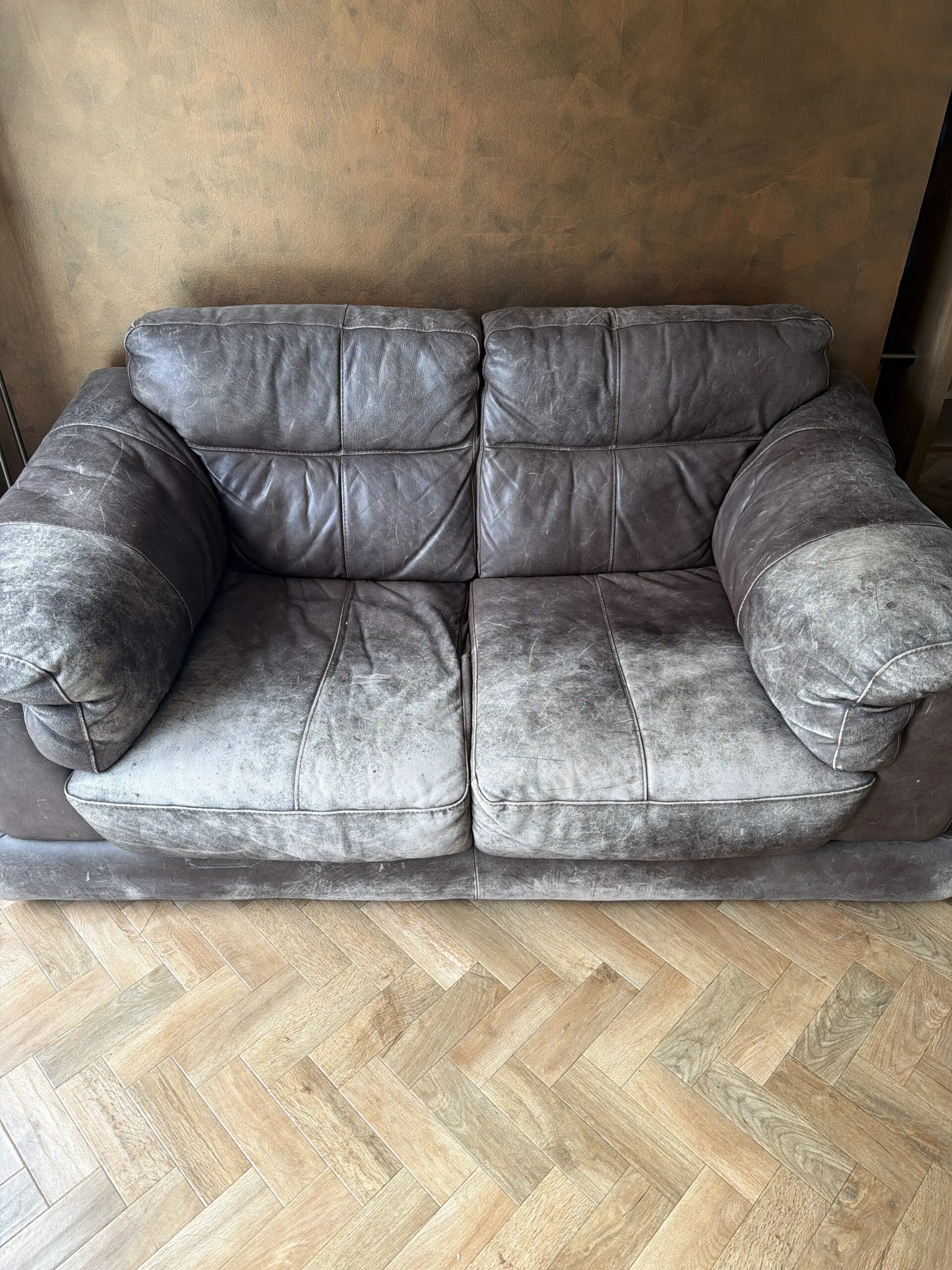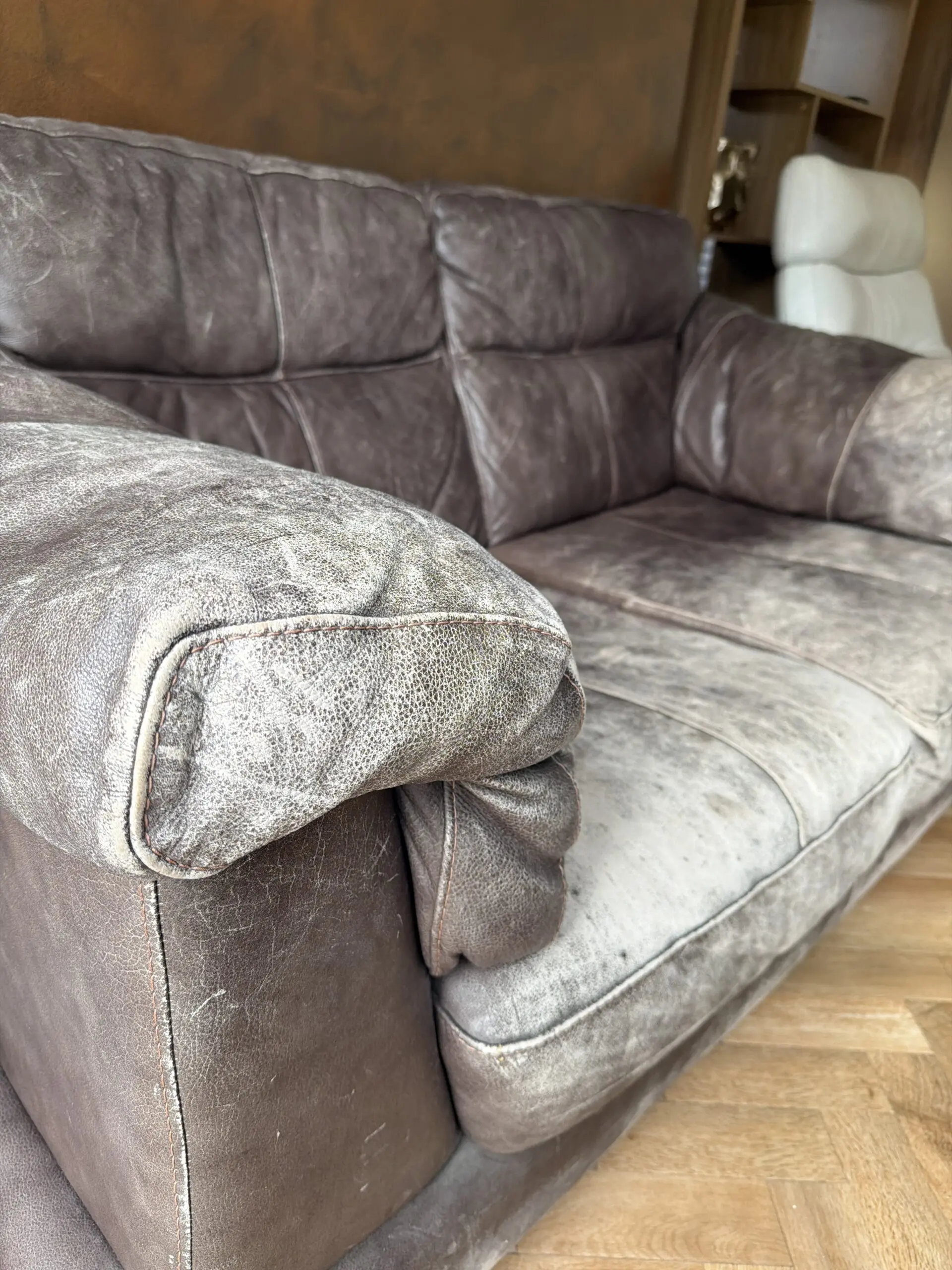 Retro, worn, cost brown sofa . One owner. Always too comfy to get rid of. Renovation dictates to let this beauty go.