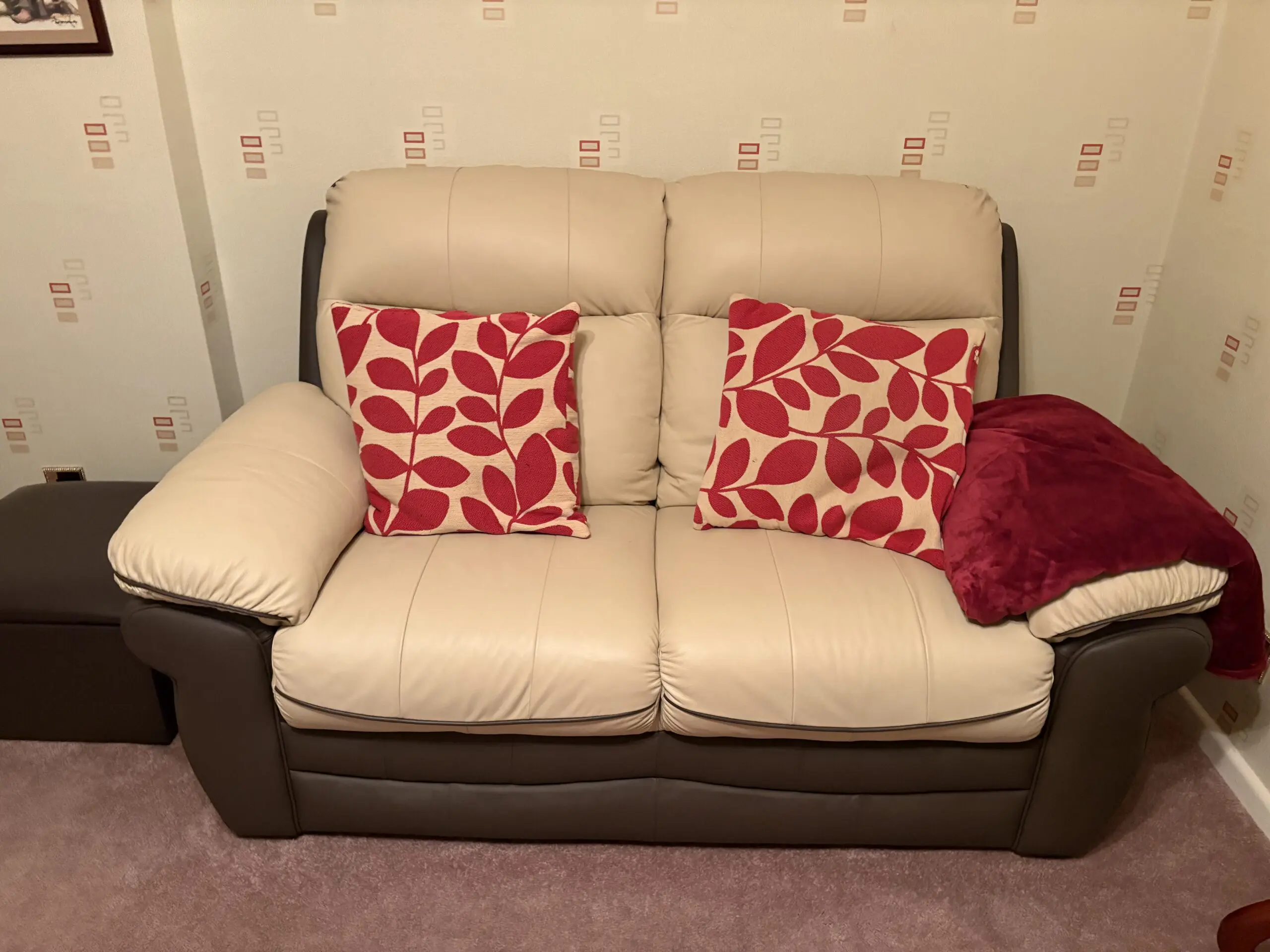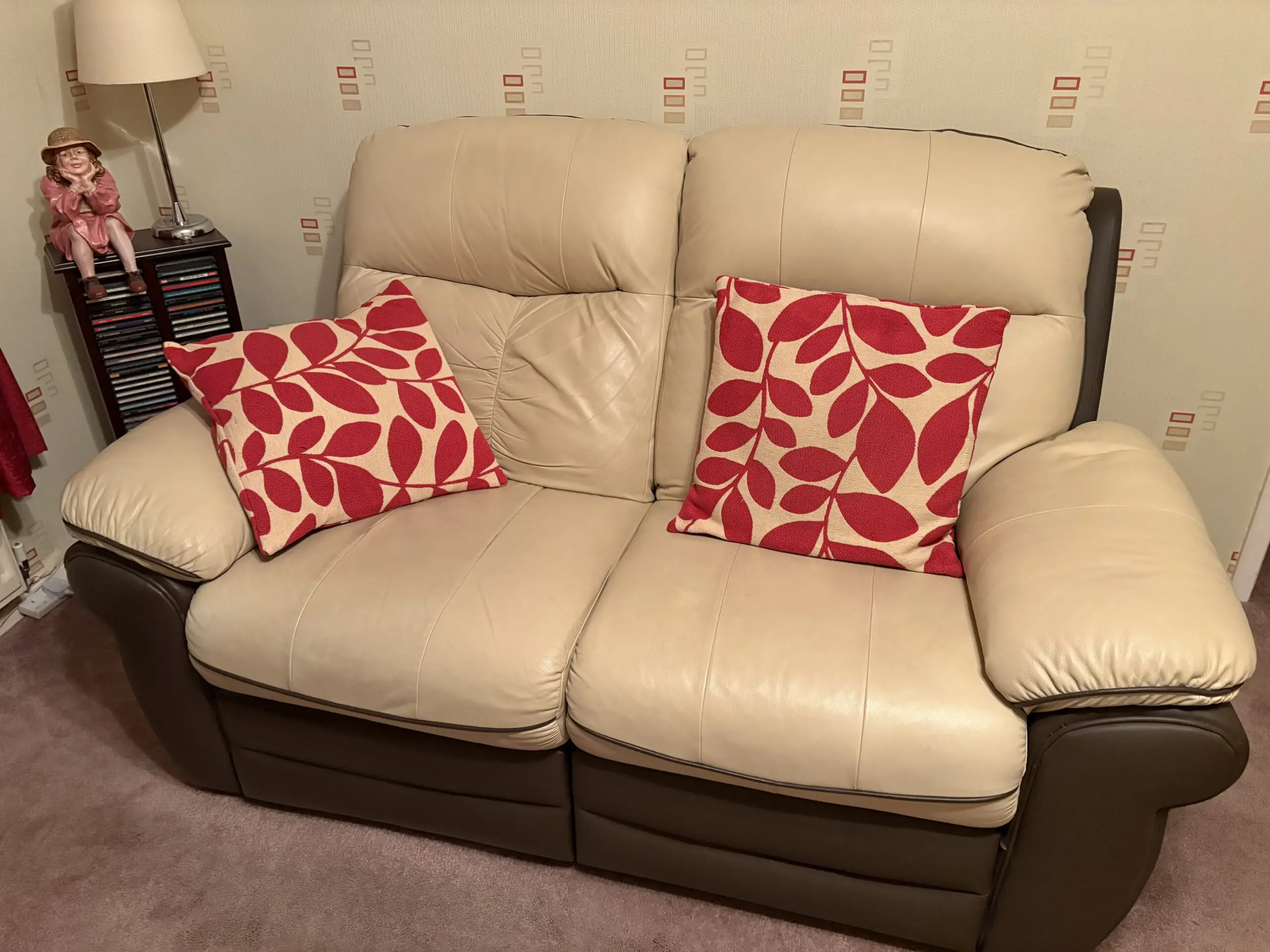 Brown and beige 2 x2 seater sofas one is a recliner both excellent condition both leather