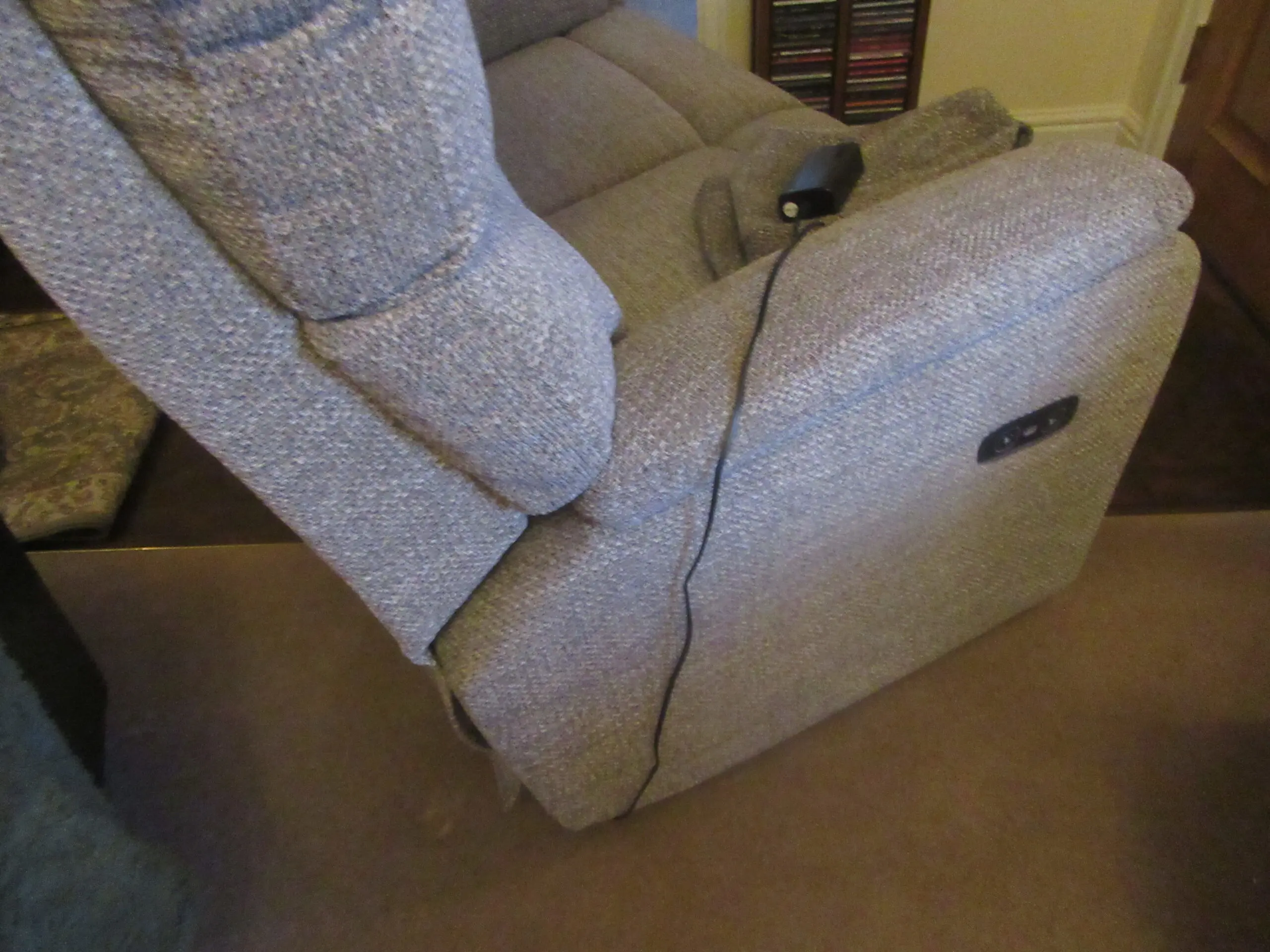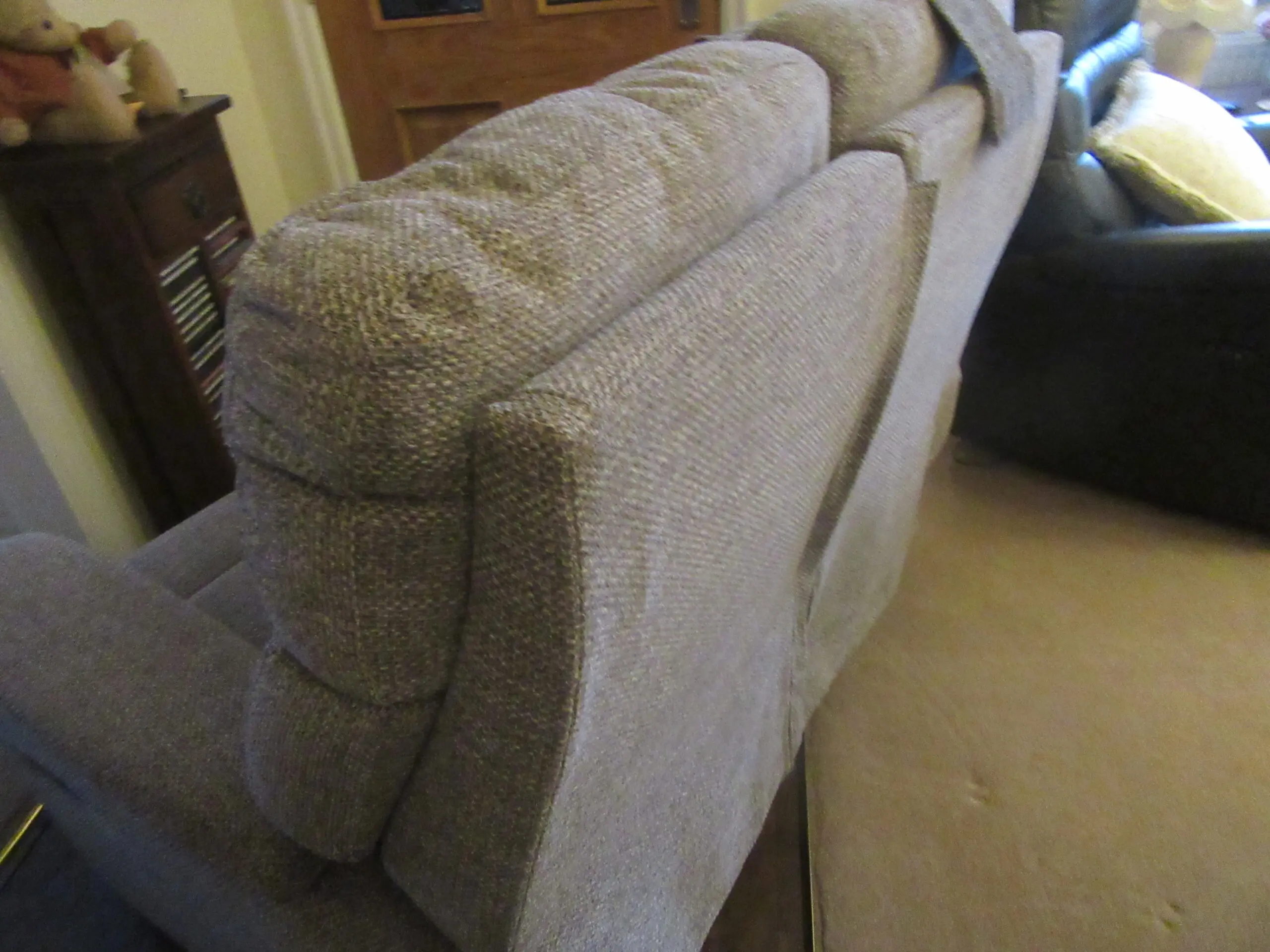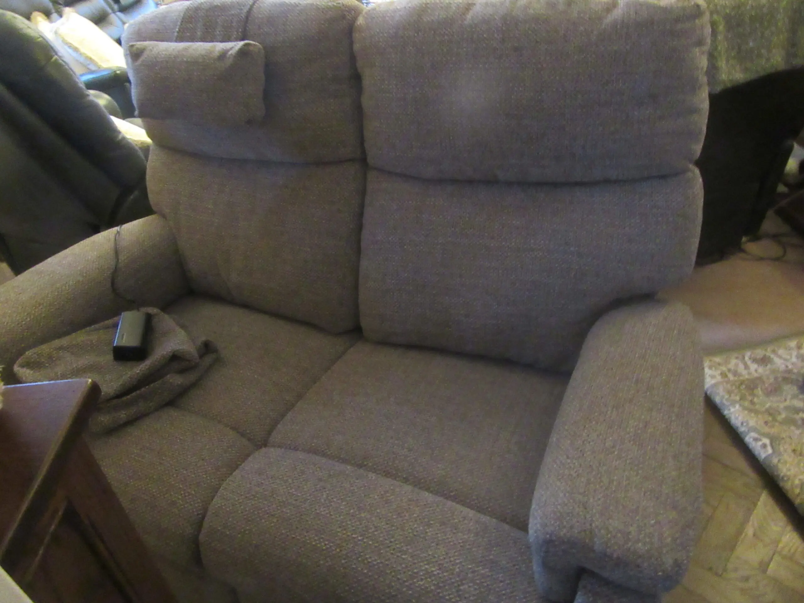 Lovely small two seater Sherborne Nevada Sofa, both sides are power recliners. Had arm caps and neck rest made to match by Sherborne. Colour in Bliss Moss.