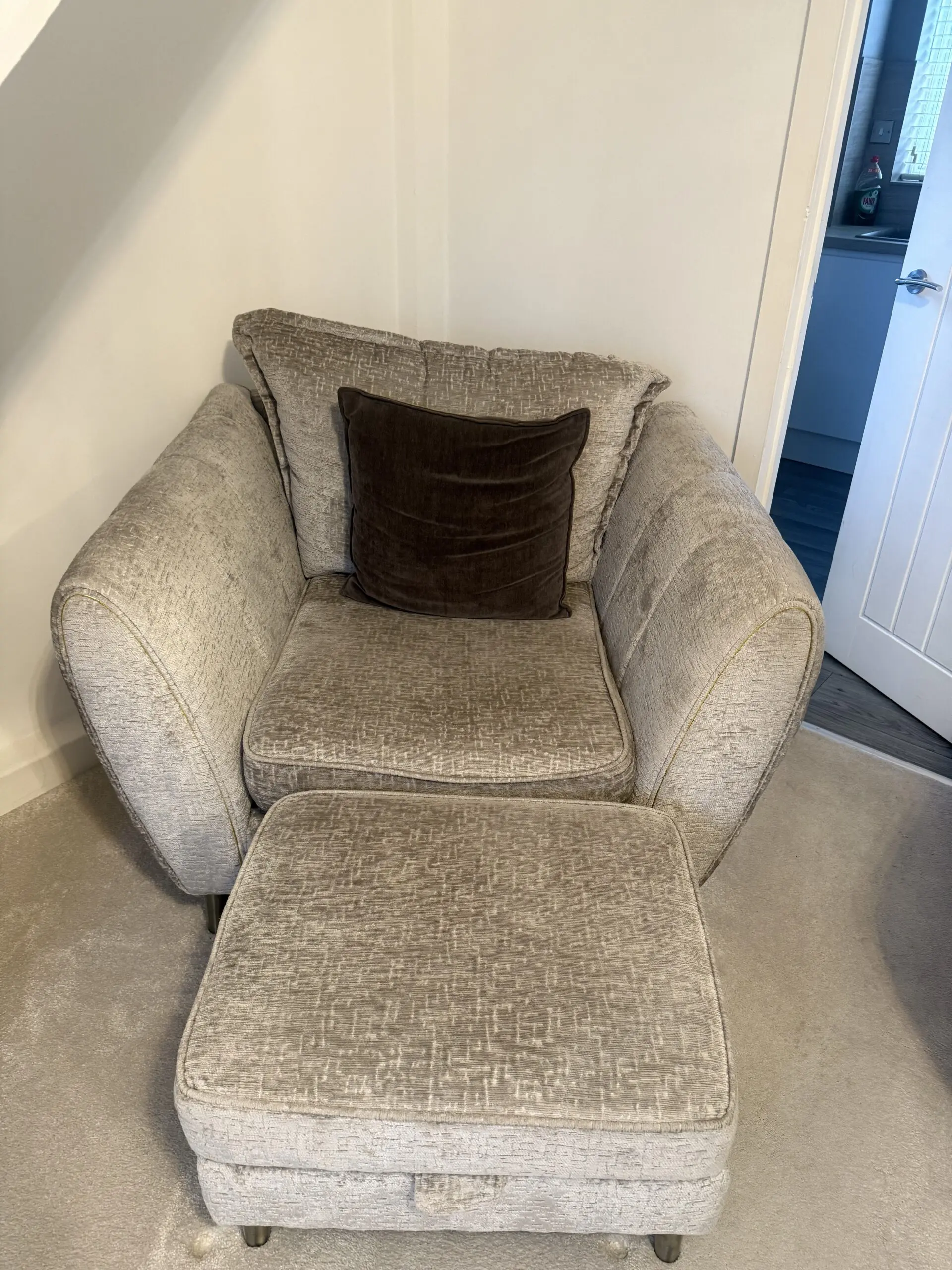 2 seater sofa, chair and storage footstool for sale.