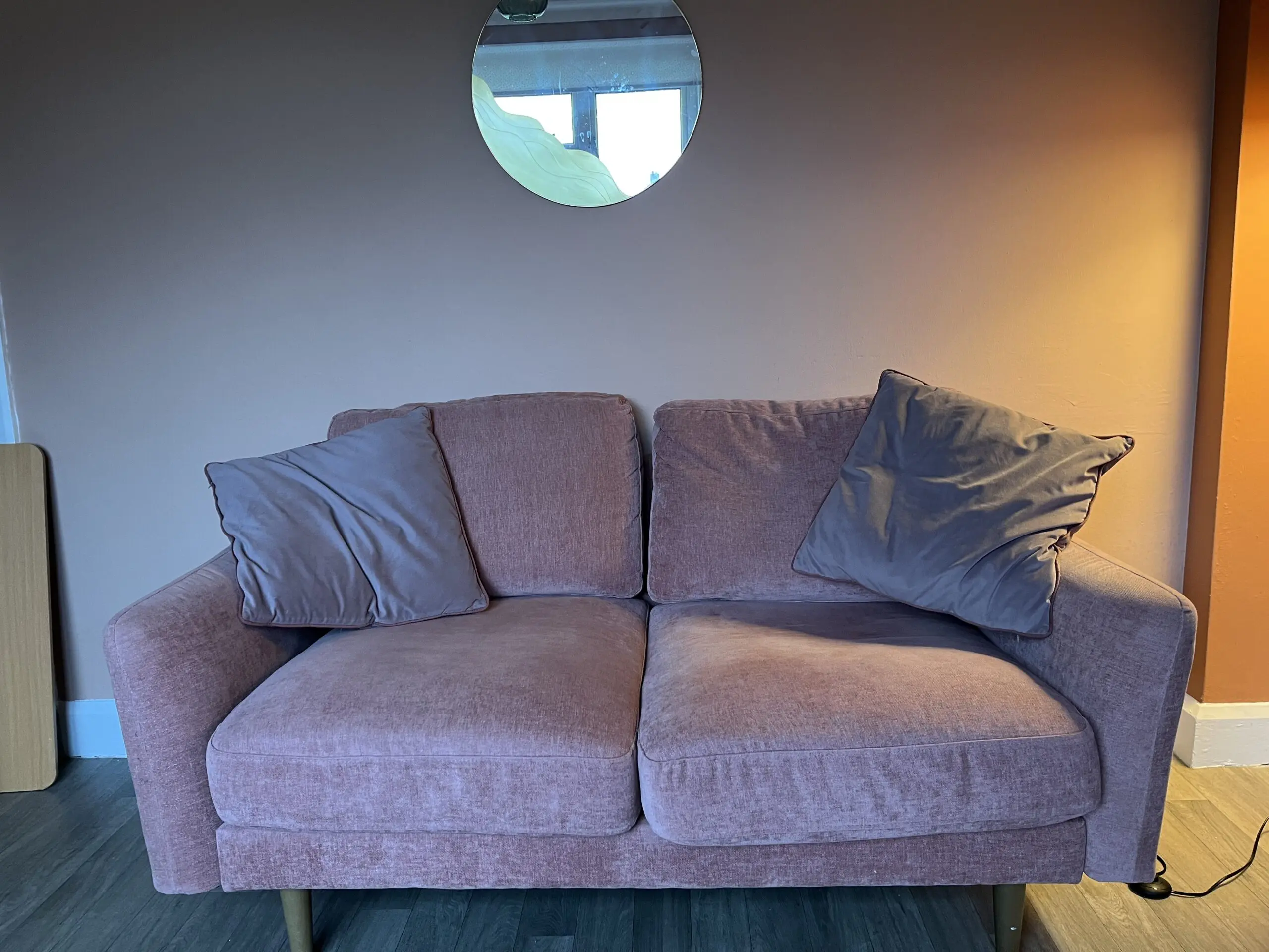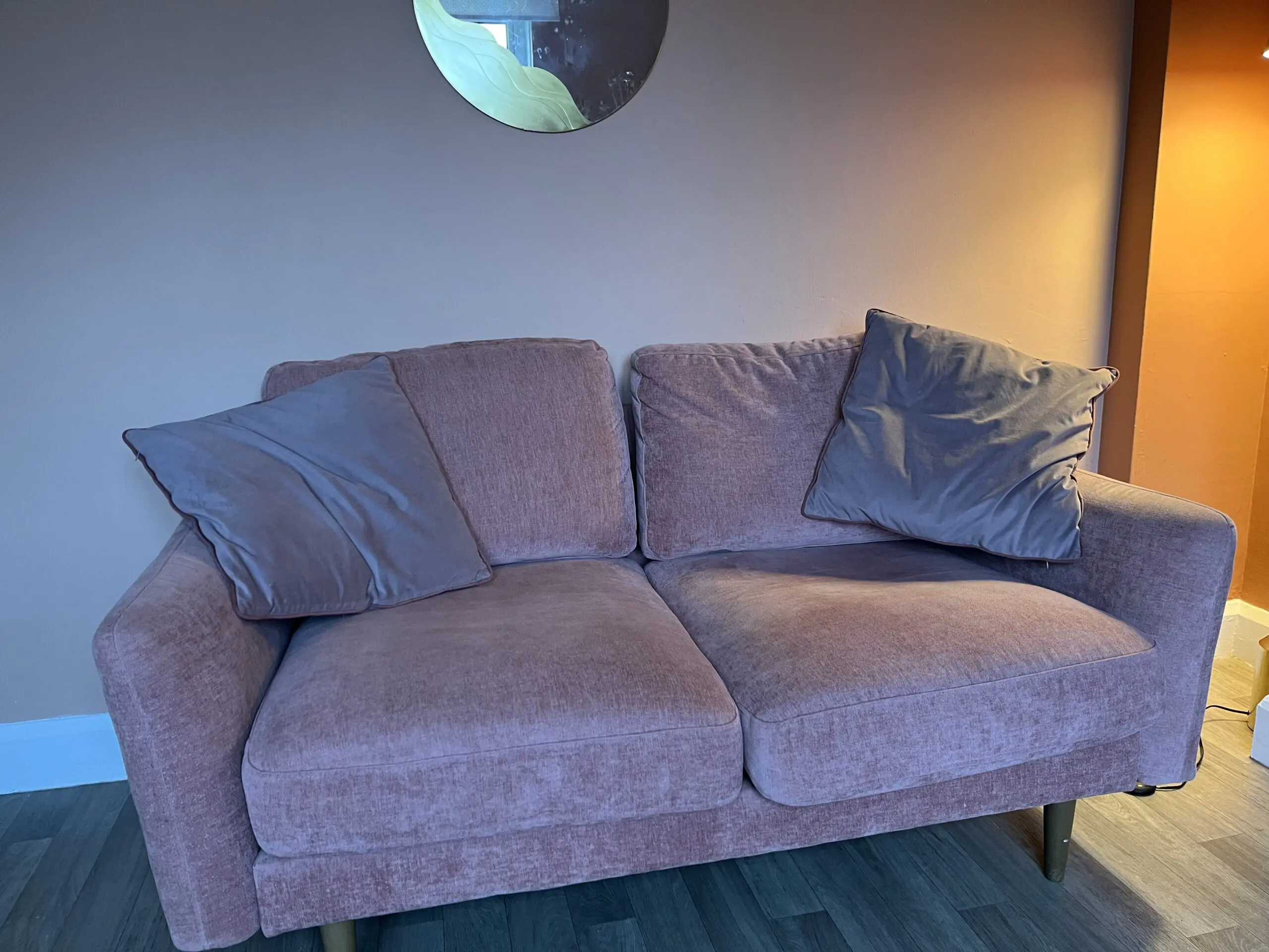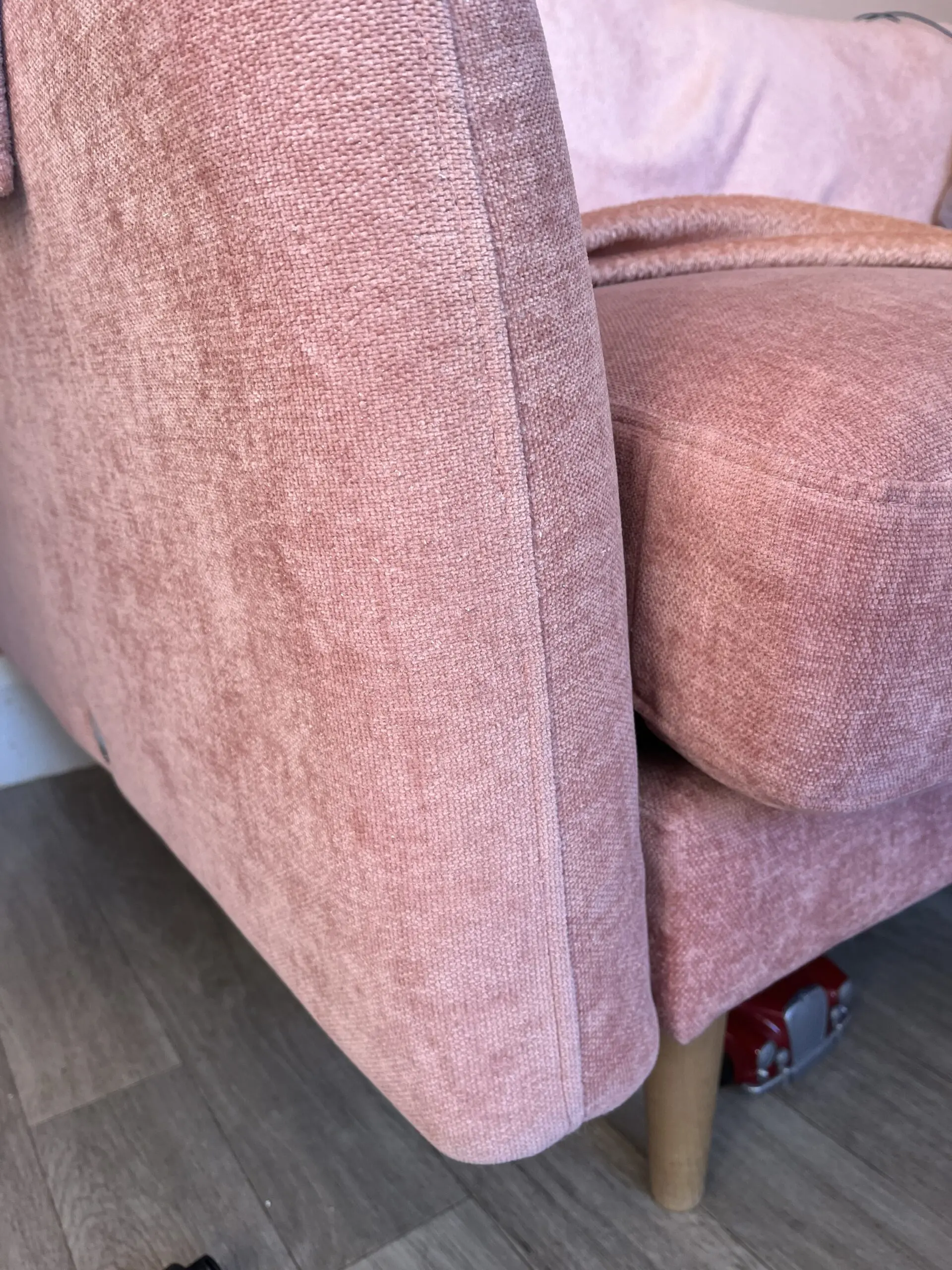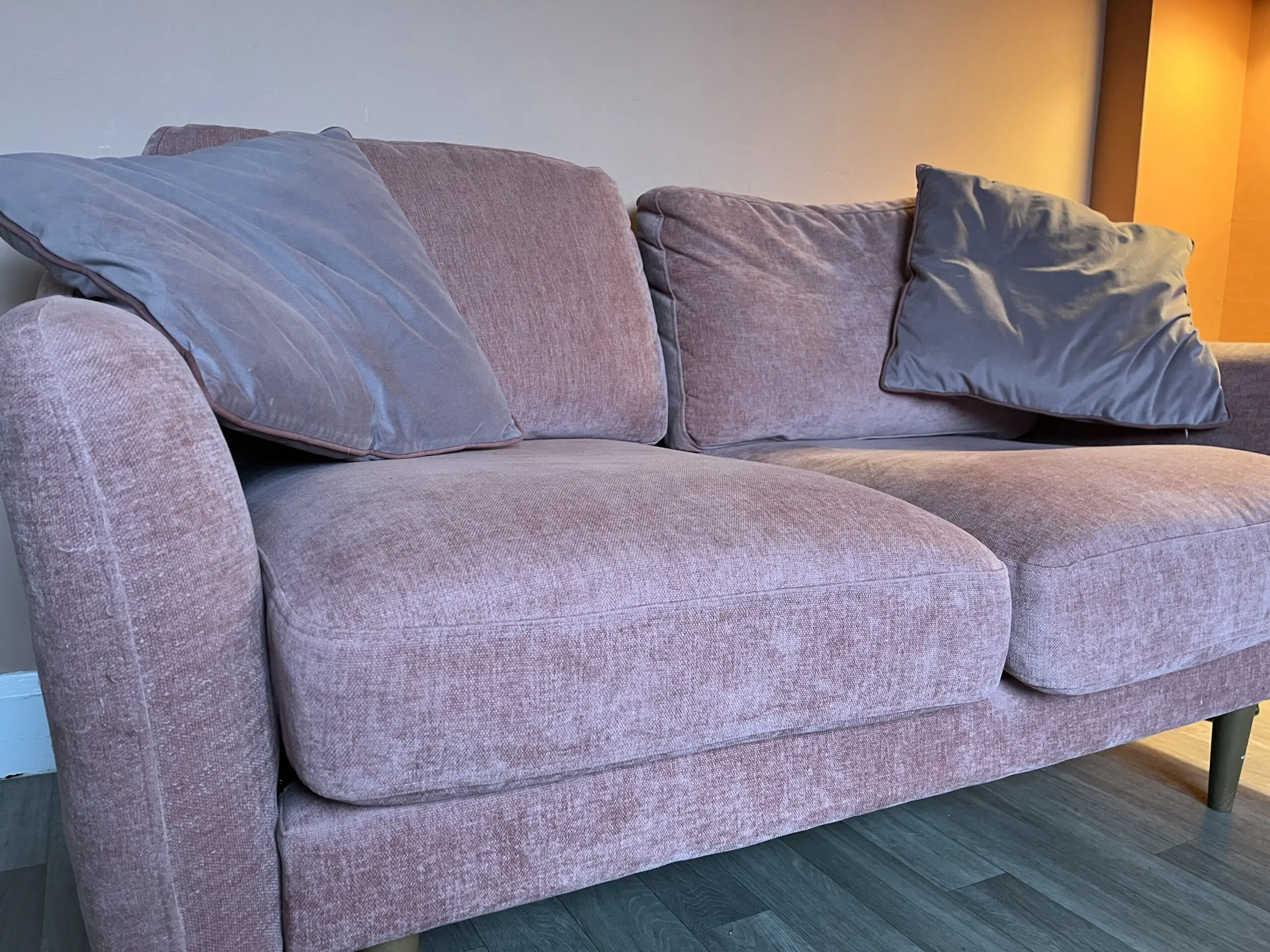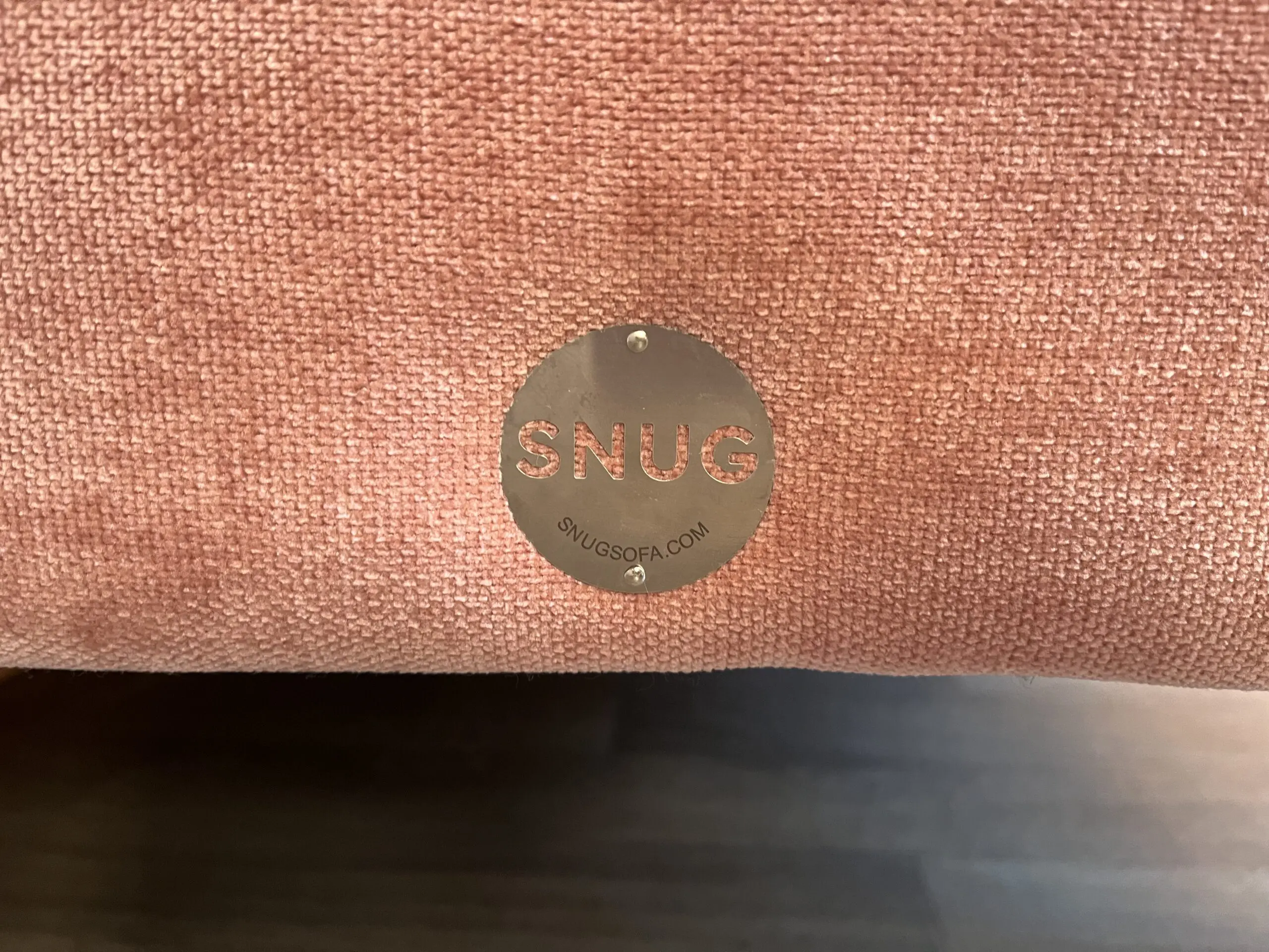 Beautiful blush pink ‘sofa in a box’ by Snug. Compact size, good for smaller rooms.