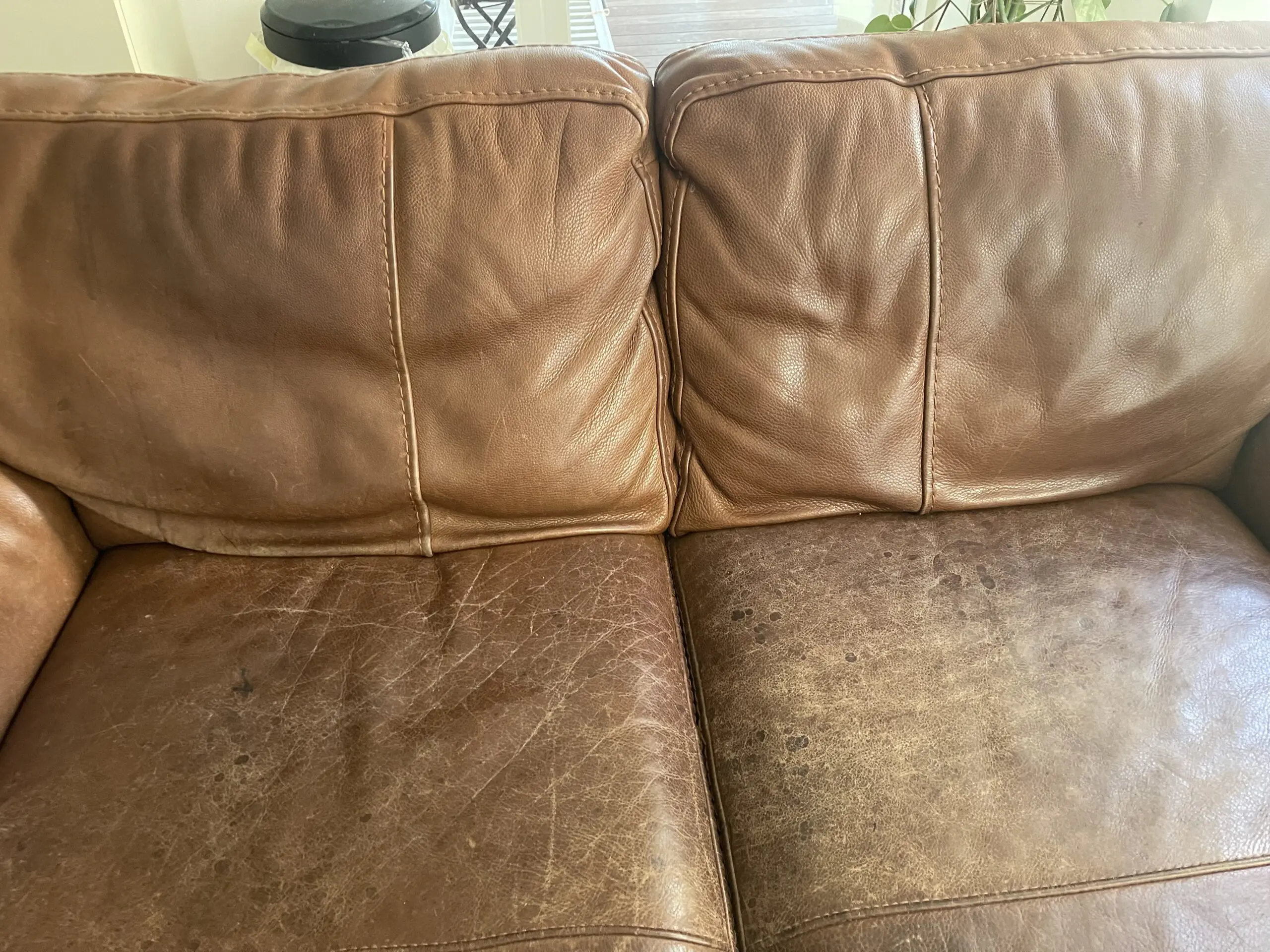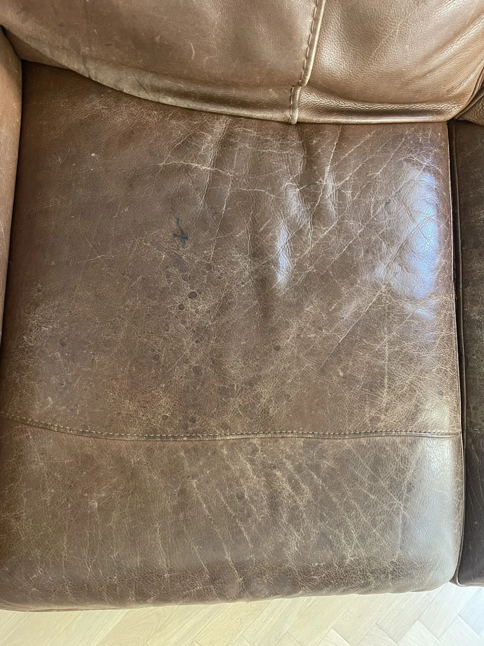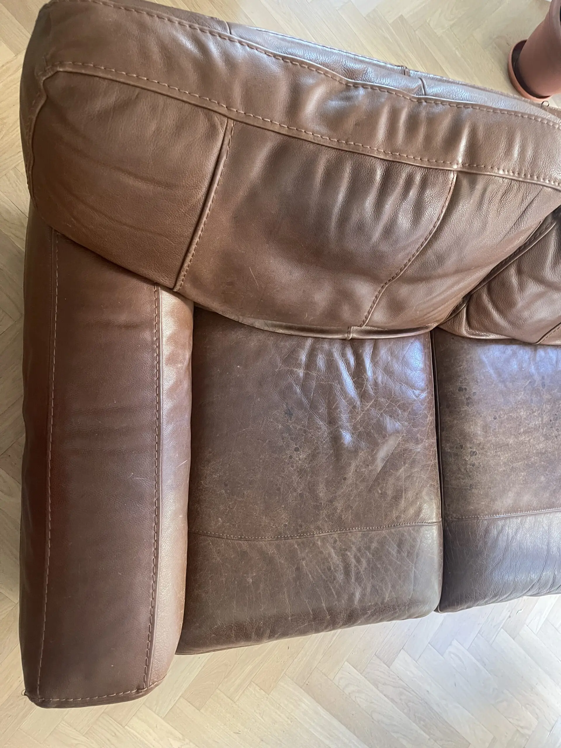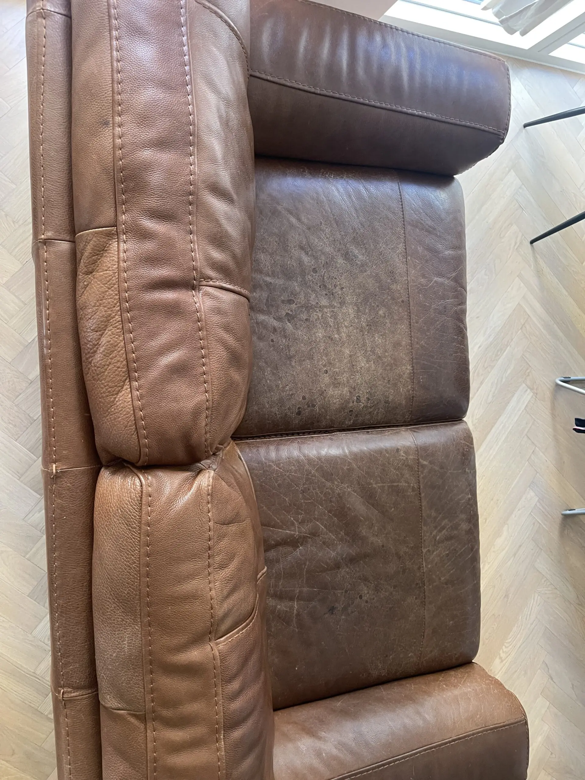 2 seater leather sofa, 5 years old. Bought from Sofology for £1,599. Good condition overall, super comfortable. Leather needs some love. Please see photos in details for marks and stains.