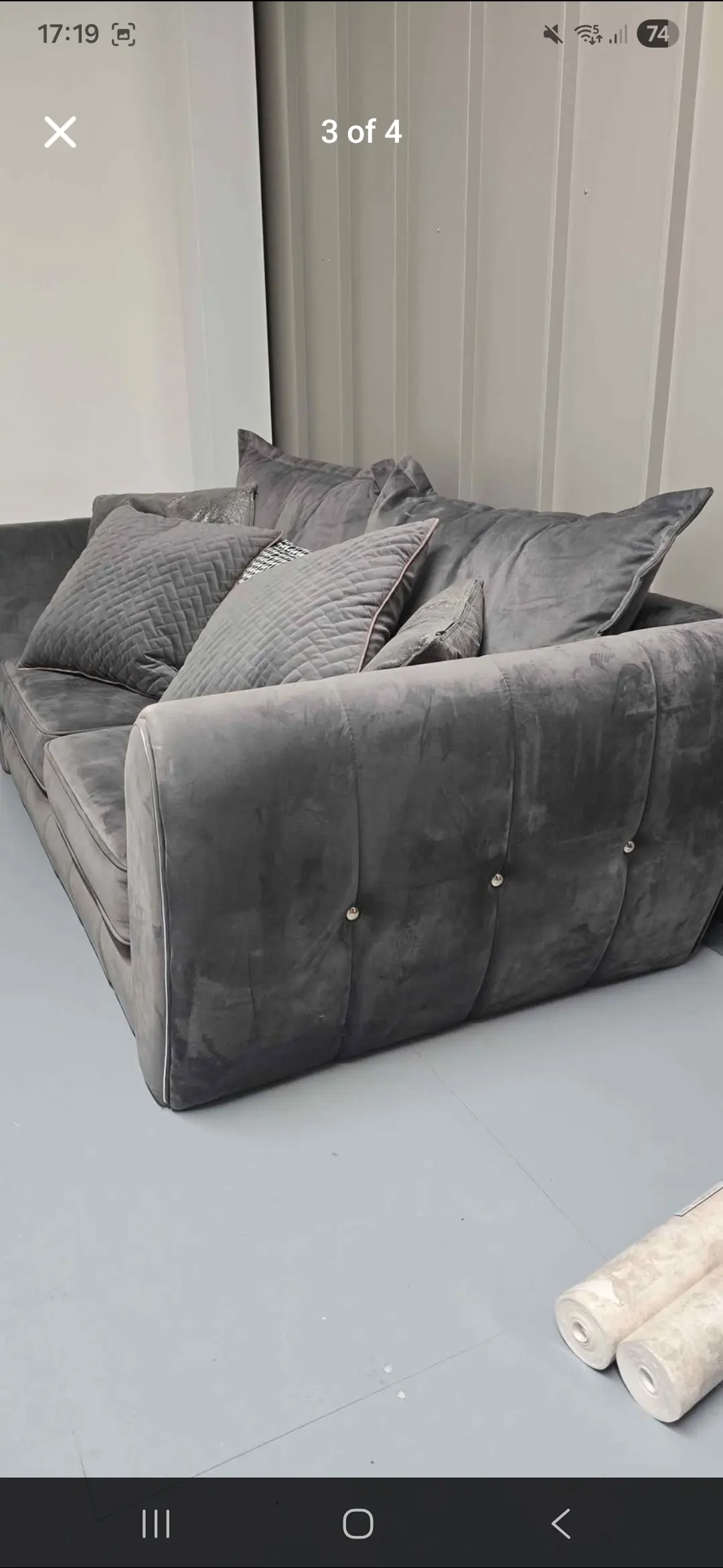We have this grey two seater sofa from Sofology. It’s the Gabrielle range and comes complete with the cushions and legs.