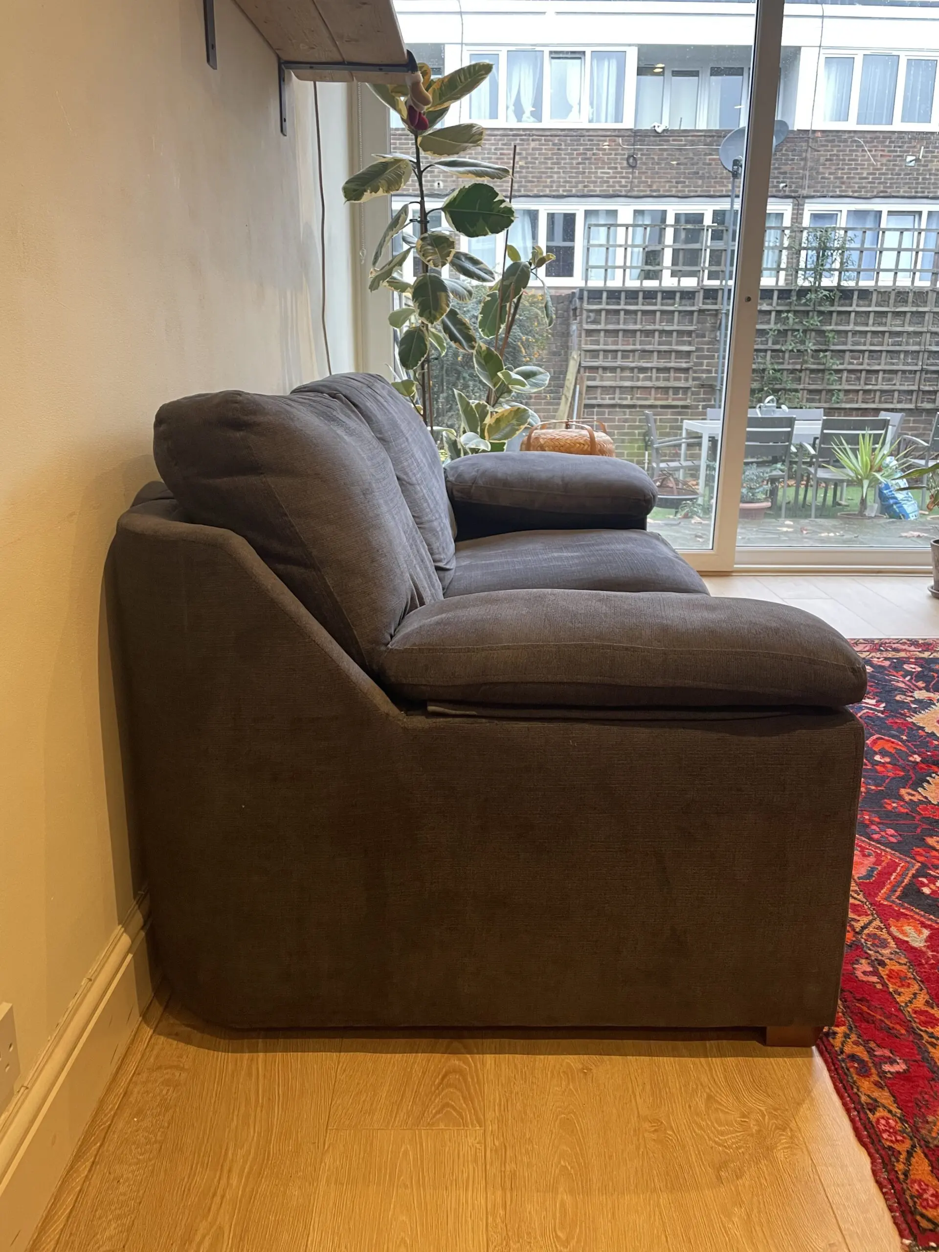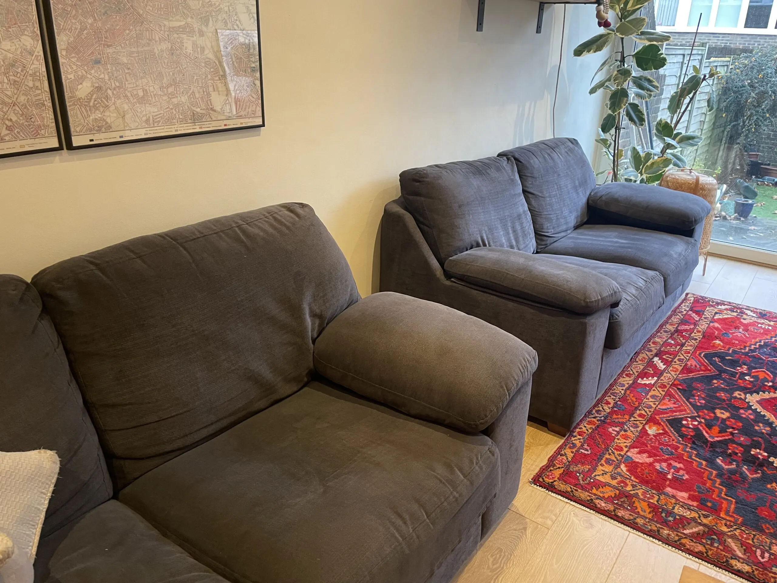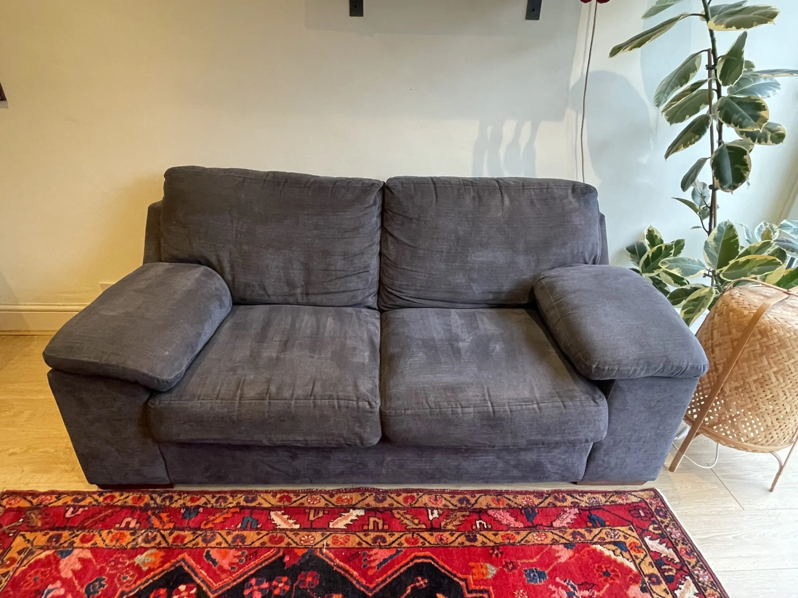 Very comfy and in good condition. We would keep it but the two combined are too large for our space, and we wanted something new. Coming from a pet free household.
