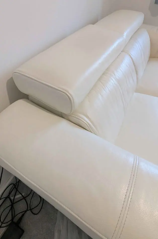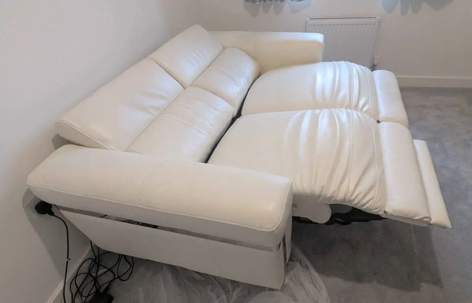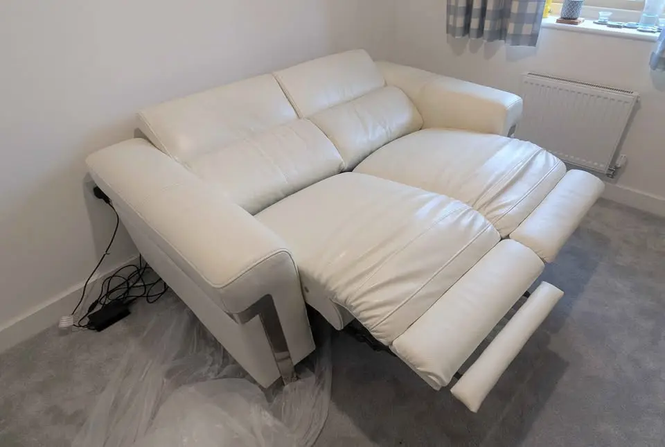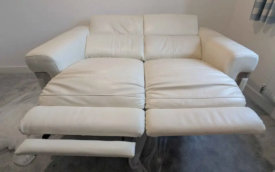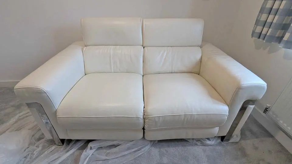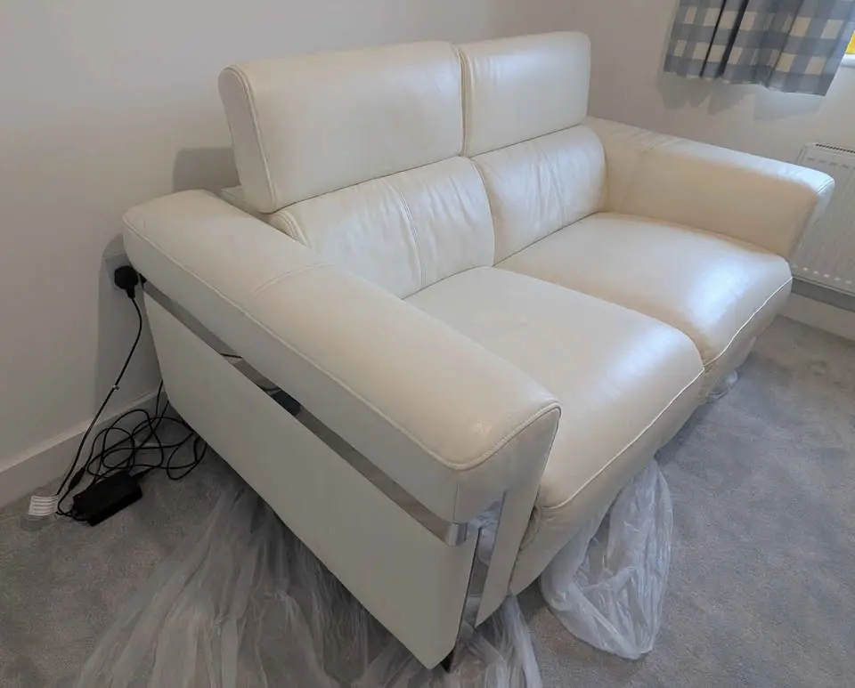 Two seater, off-white Sofology leather electric recliner in good condition, leather is clean and not worn, there is only one light scratch on one seat as seen on the images. Coming from a smoke and pet free home. Sofa has been stored inside for the past three years, not used. Was used for 4 years prior to that but kept in good condition.