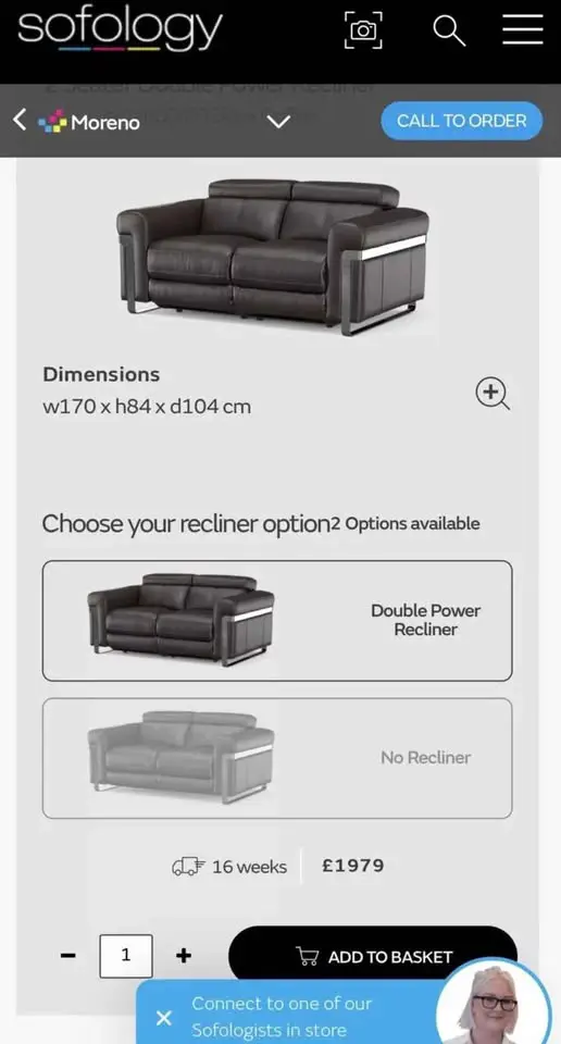 The sofa has two separate plugs at the back (one each side) for the reclining function. Reclining is via finger sensors down the sides of the cushions. The head rests can be used upright or turned down when in full recline.