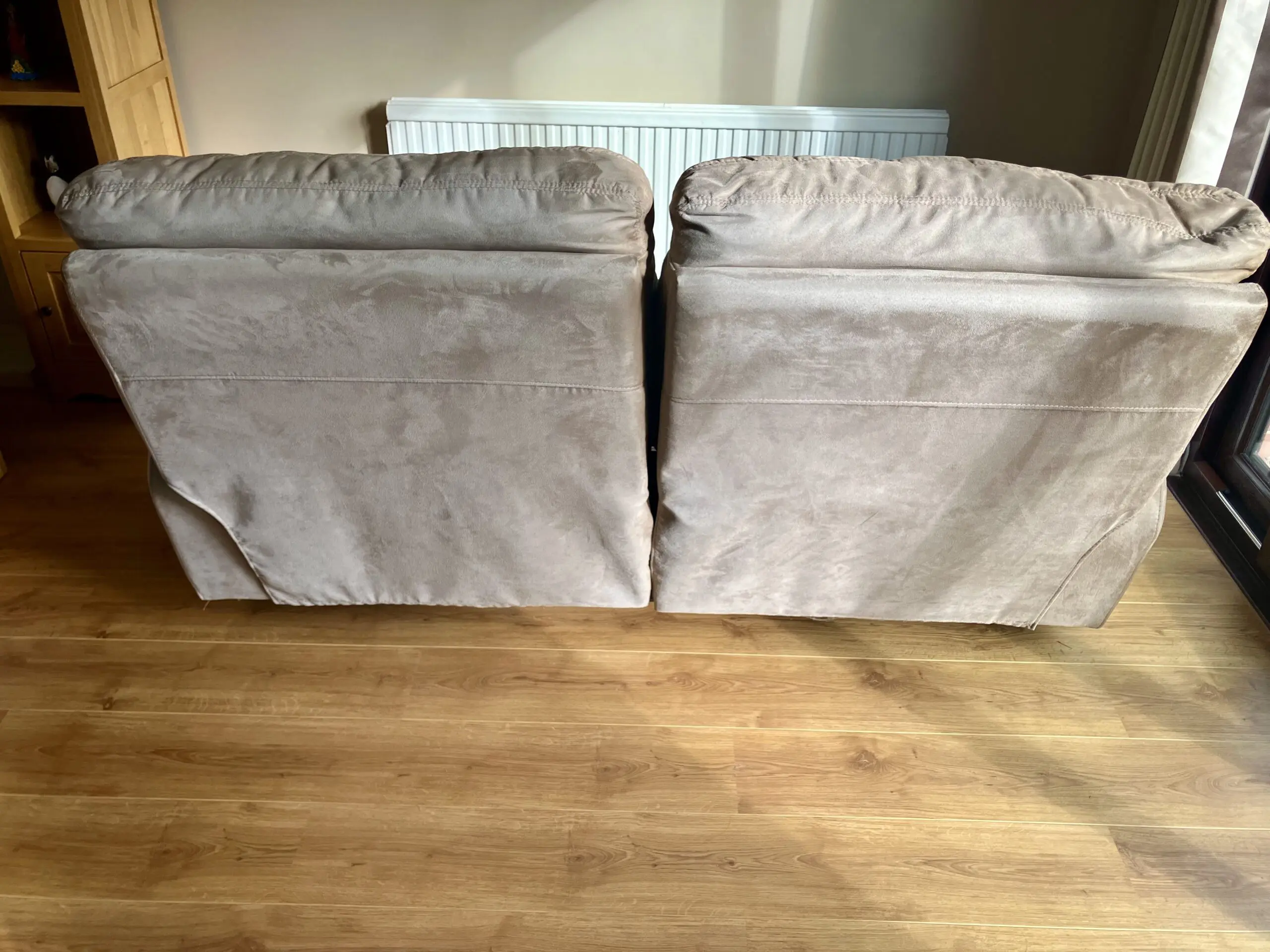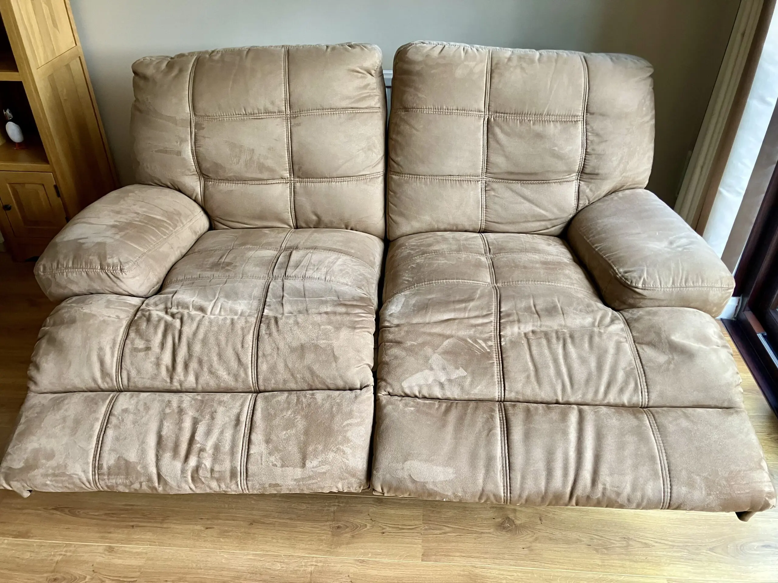 Coming from a NO PET, NO SMOKE house comes this lovely and comfy manual recliner two-seater in tan/beige colour.