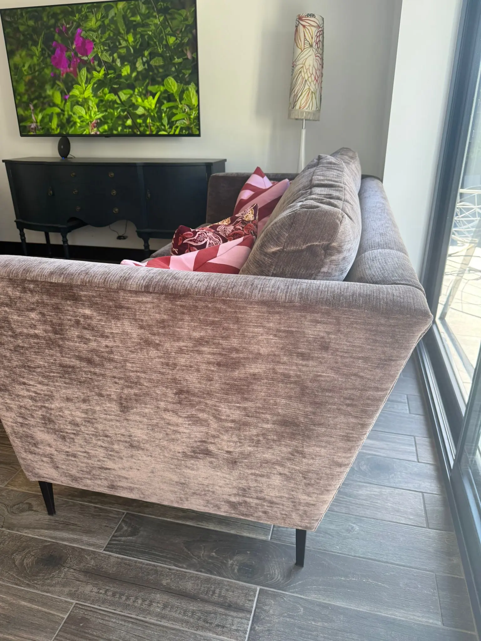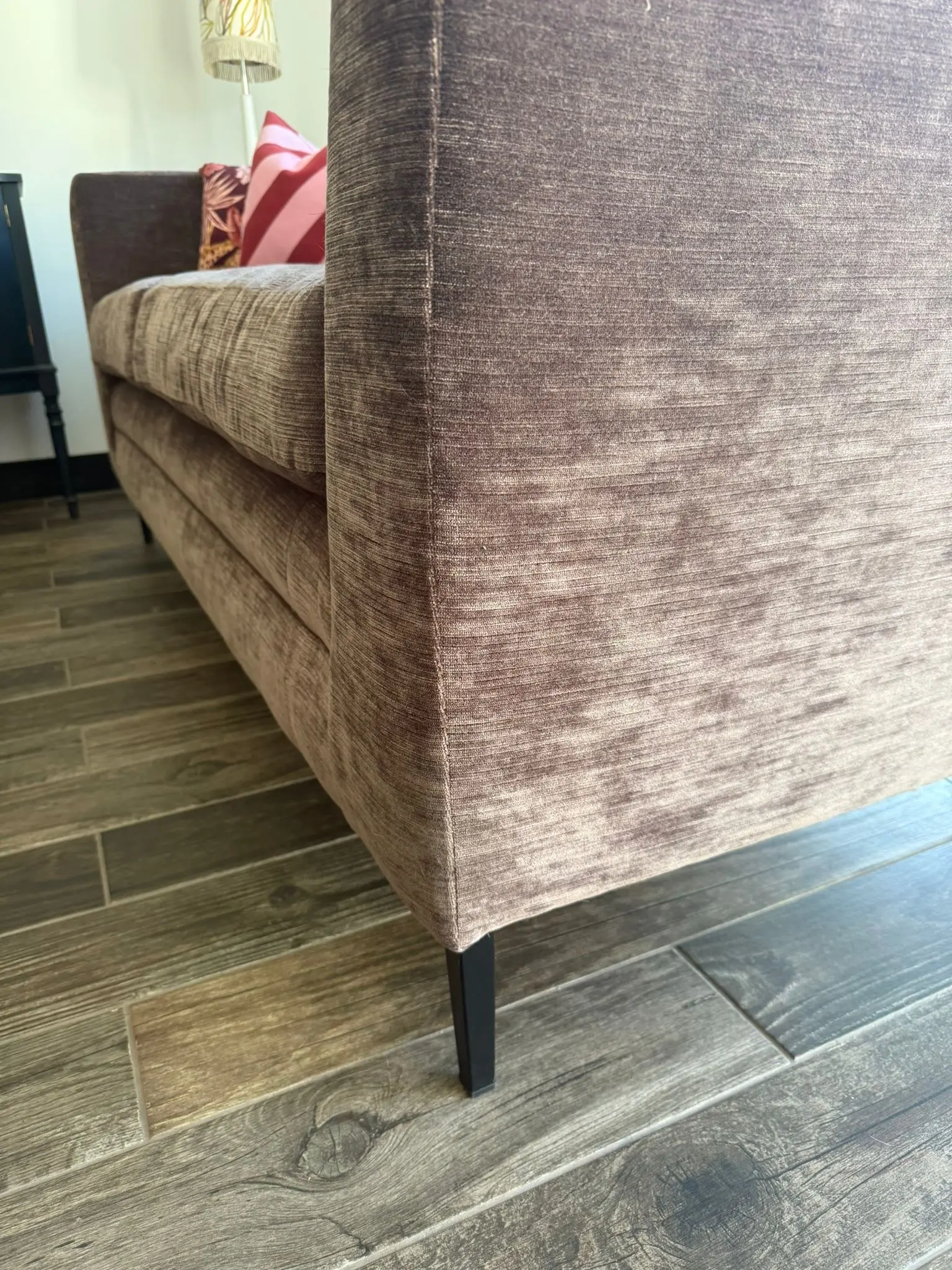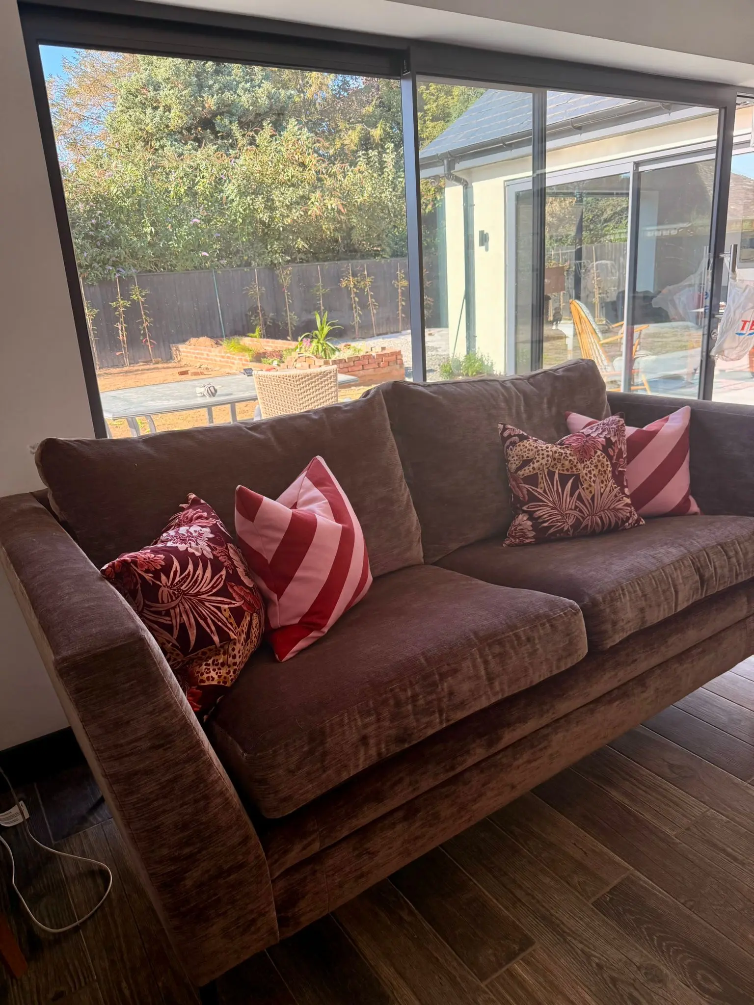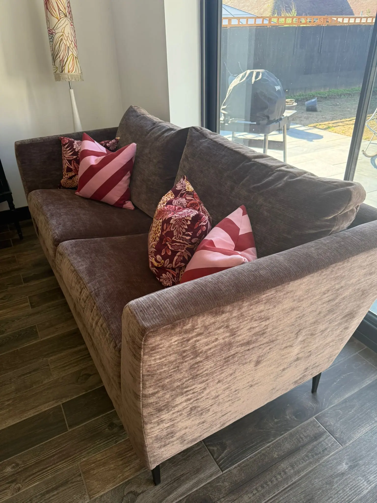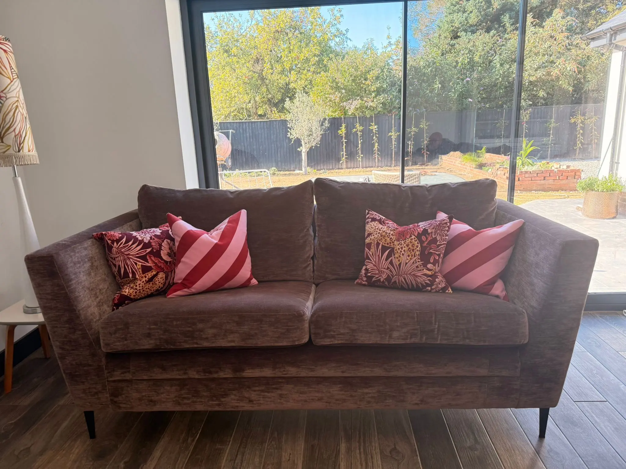 Recently reupholstered in luxurious Kirby design brown velvet fabric, this elegant sofa combines timeless craftsmanship with a modern touch. Finished with contrasting scatter cushions in designer fabrics from Clarke & Clarke and Harlequin (sold separately), it makes a striking centrepiece for any living space.