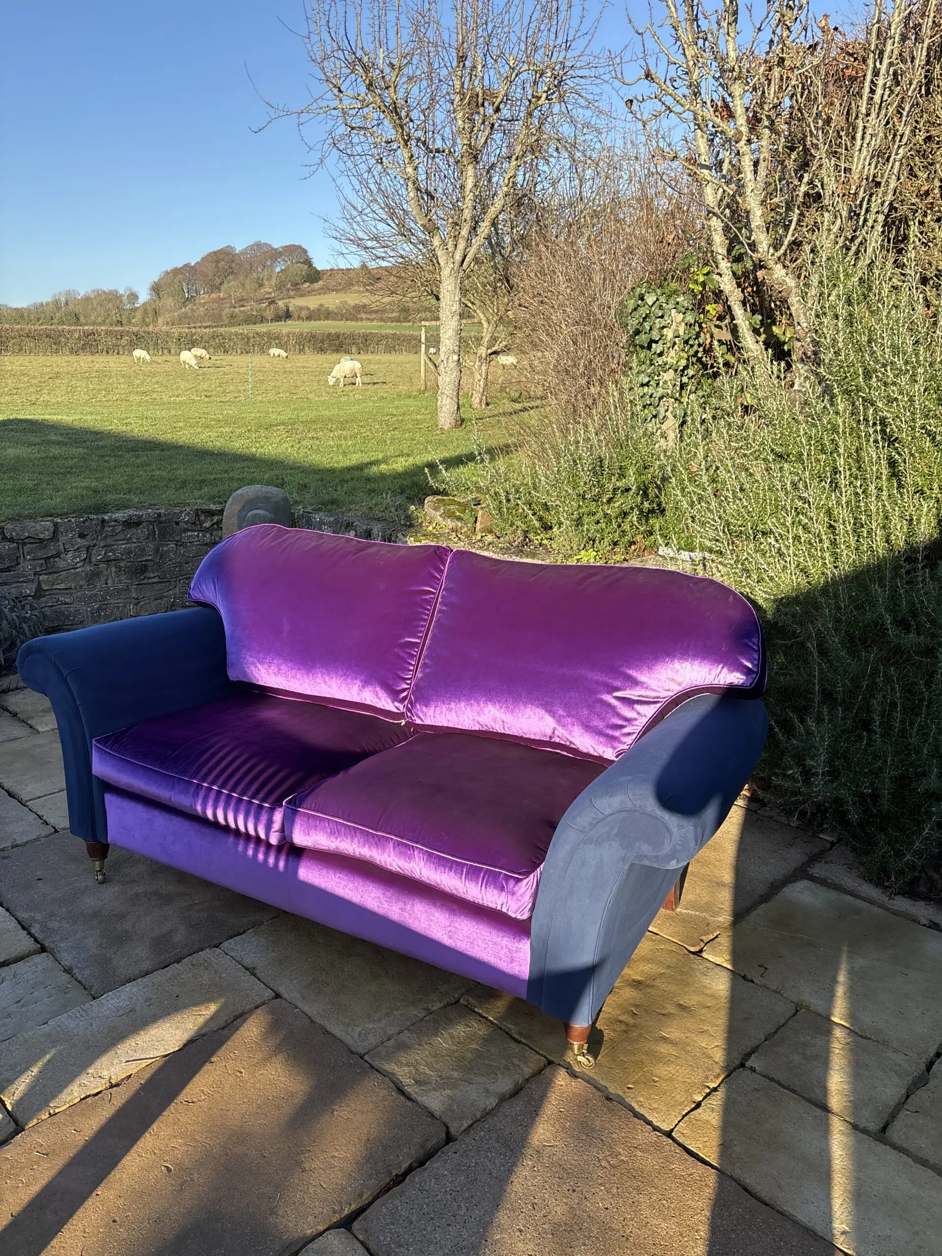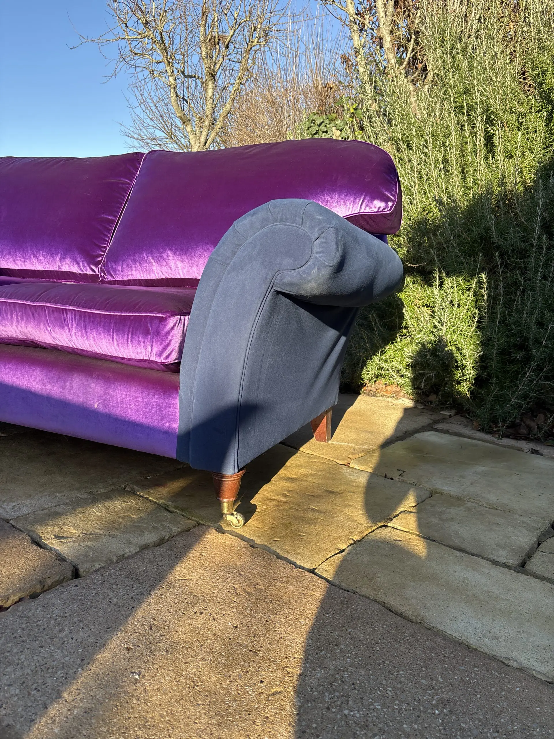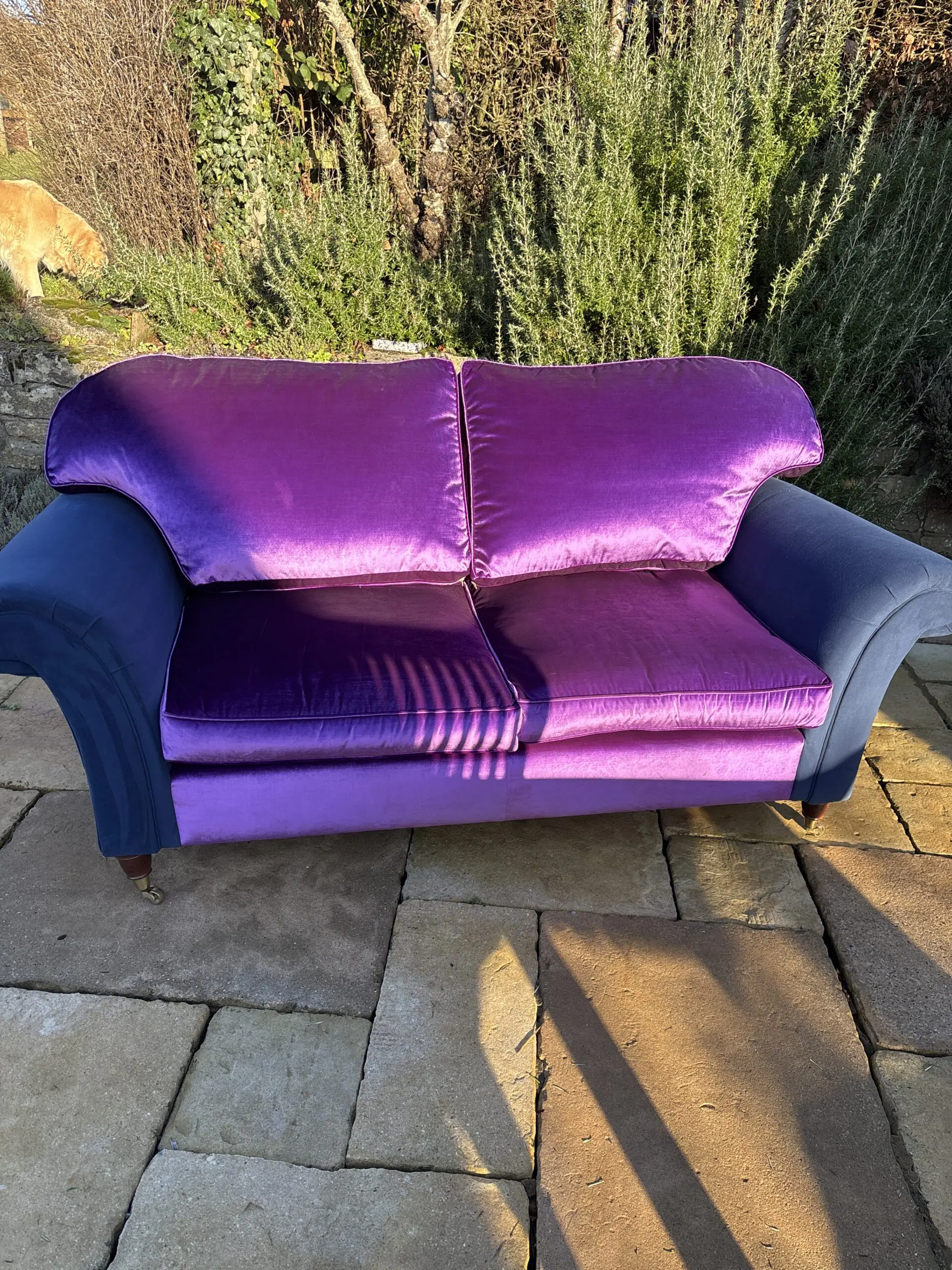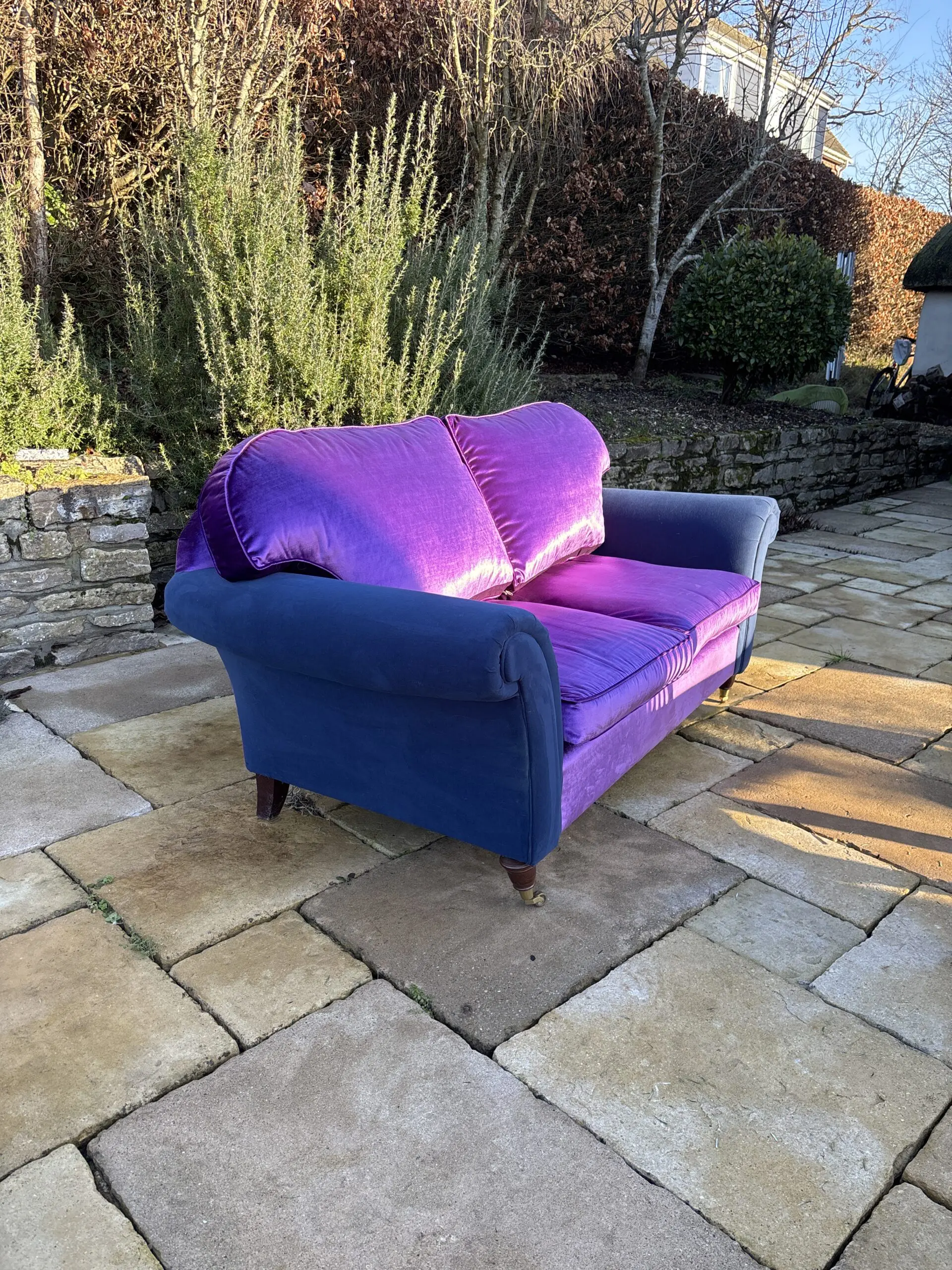Large two seater which is very comfortable. Newly upholstered in Designers Guild violet velvet , with a glorious sheen! It is stunning. The arms are upholstered in a contrasting navy blue velvet for a contemporary look.