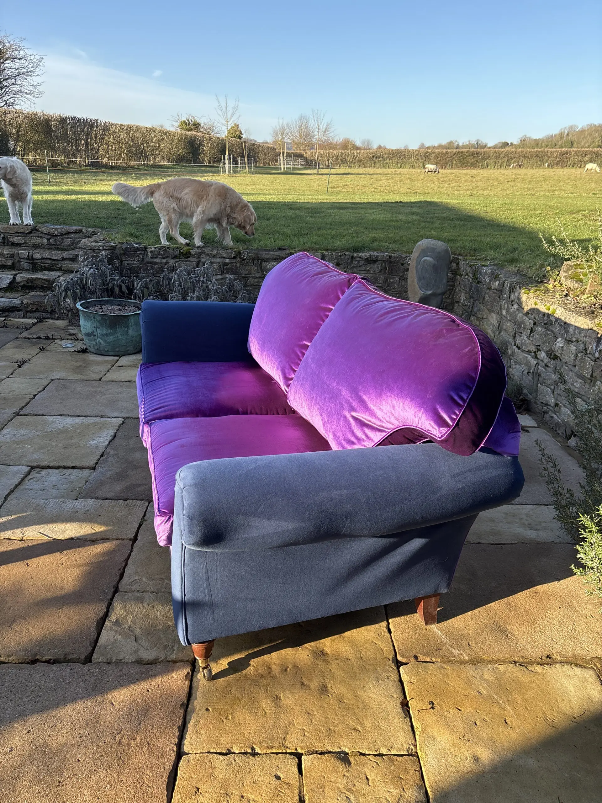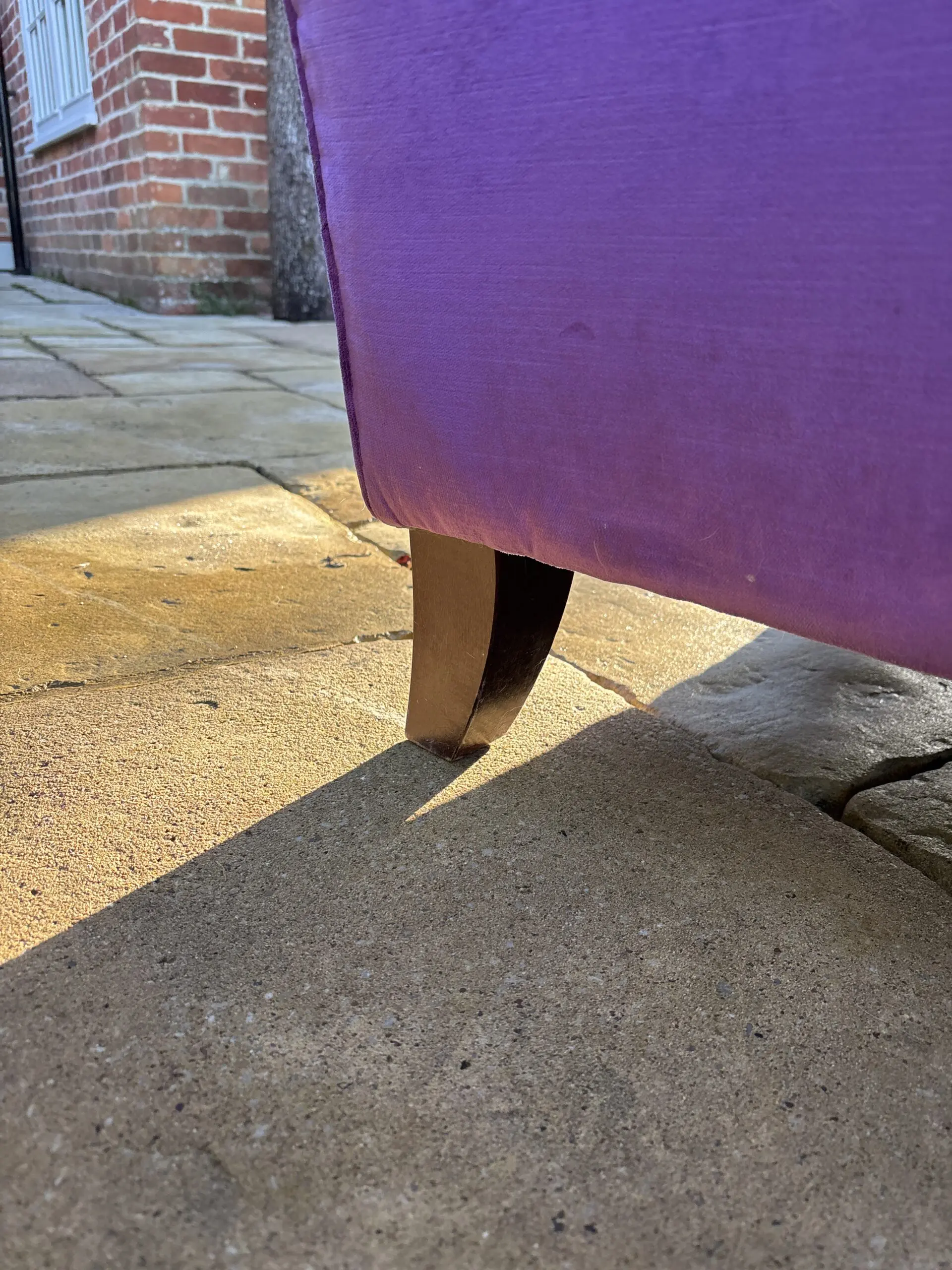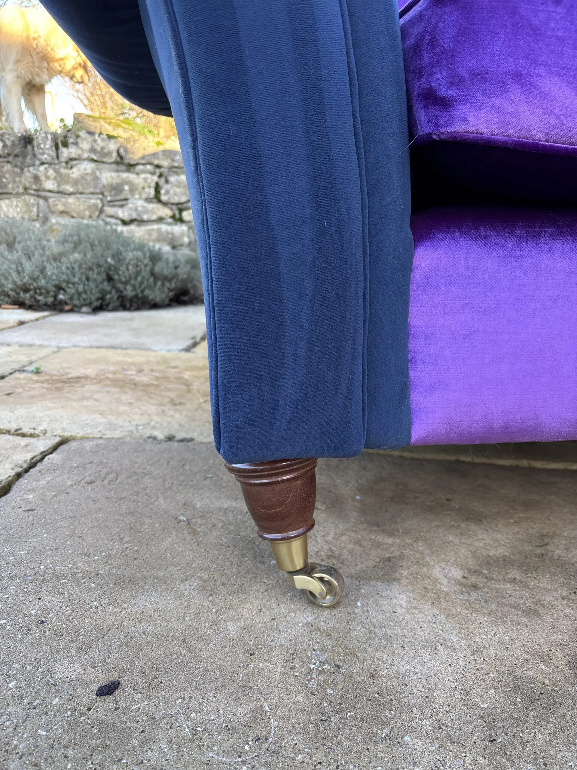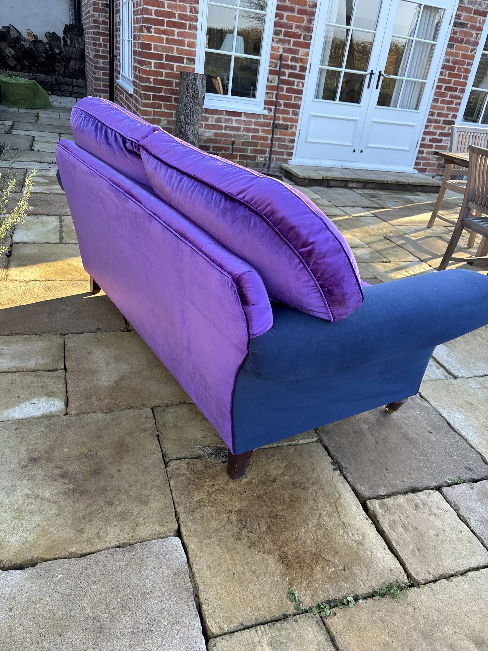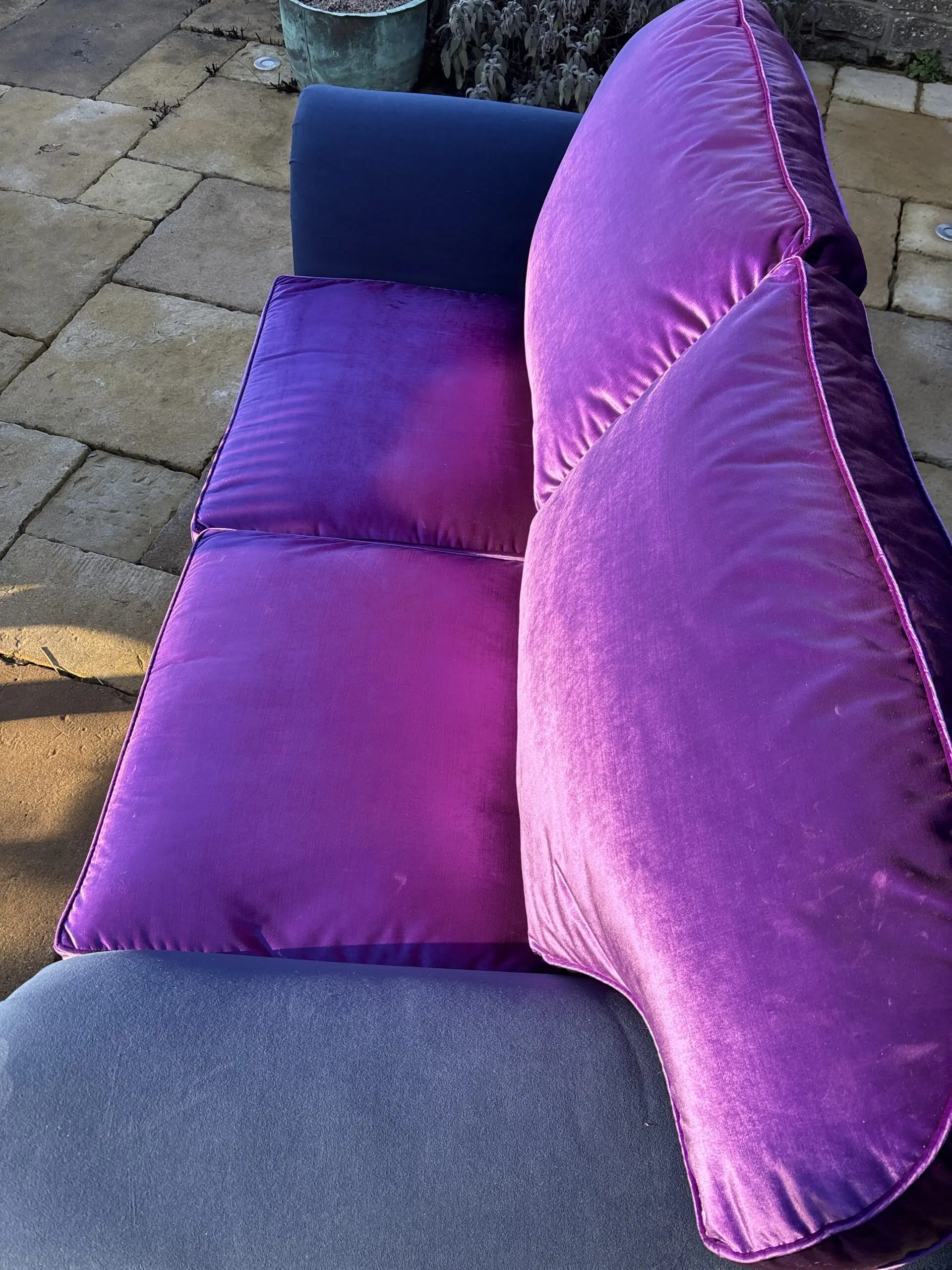 Large two seater which is very comfortable. Newly upholstered in Designers Guild violet velvet , with a glorious sheen! It is stunning. The arms are upholstered in a contrasting navy blue velvet for a contemporary look.
