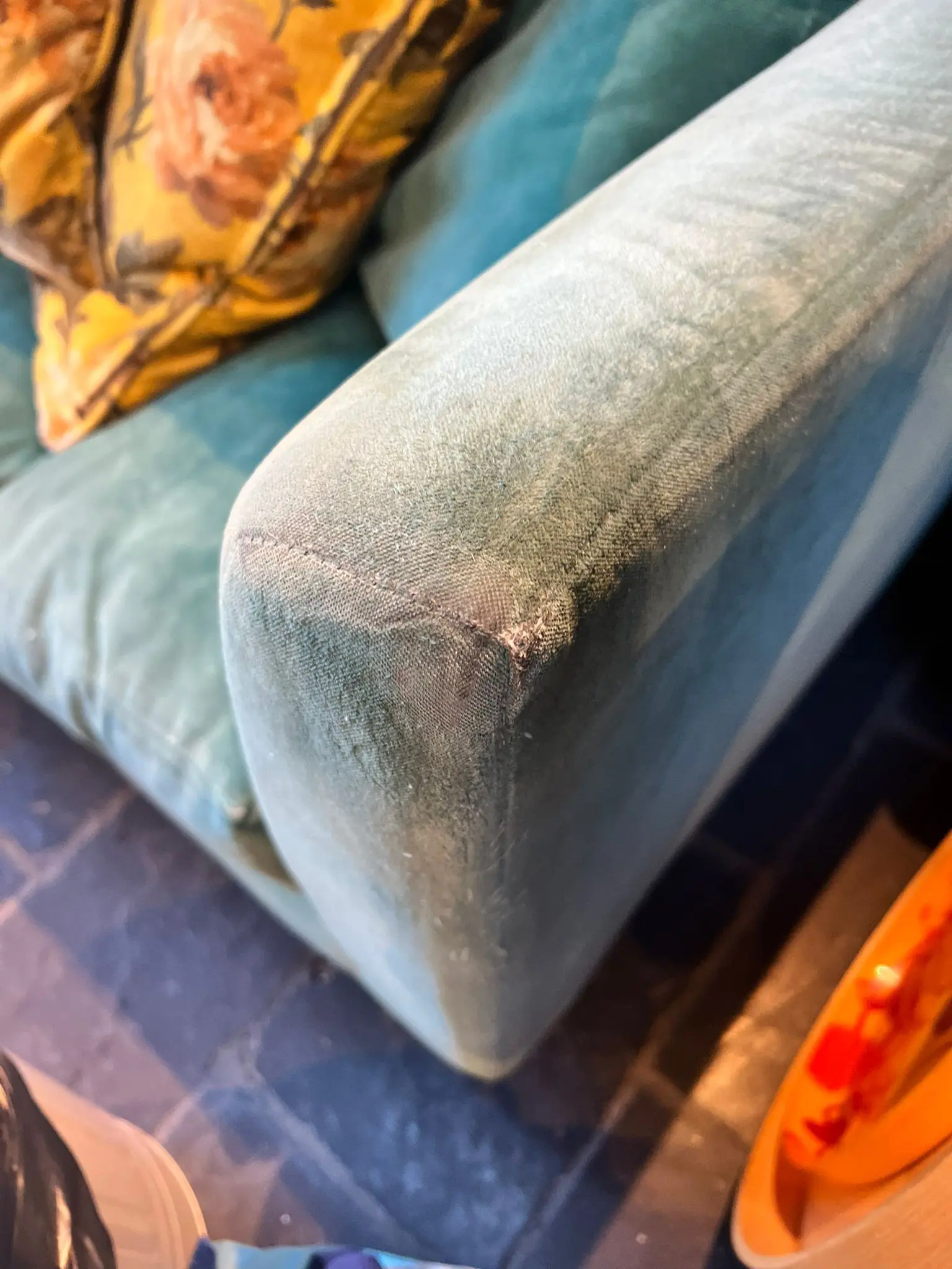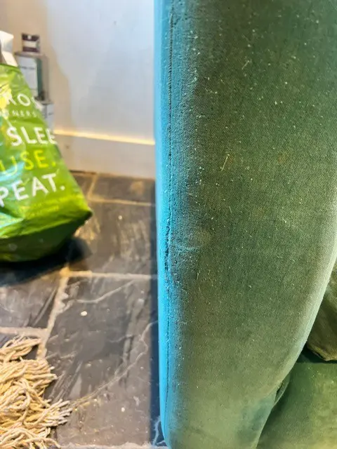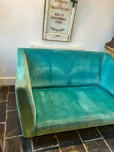 Two Teal velvet shabby chic sofas with feather seat and back cusions. Comes with 4 matching cushions