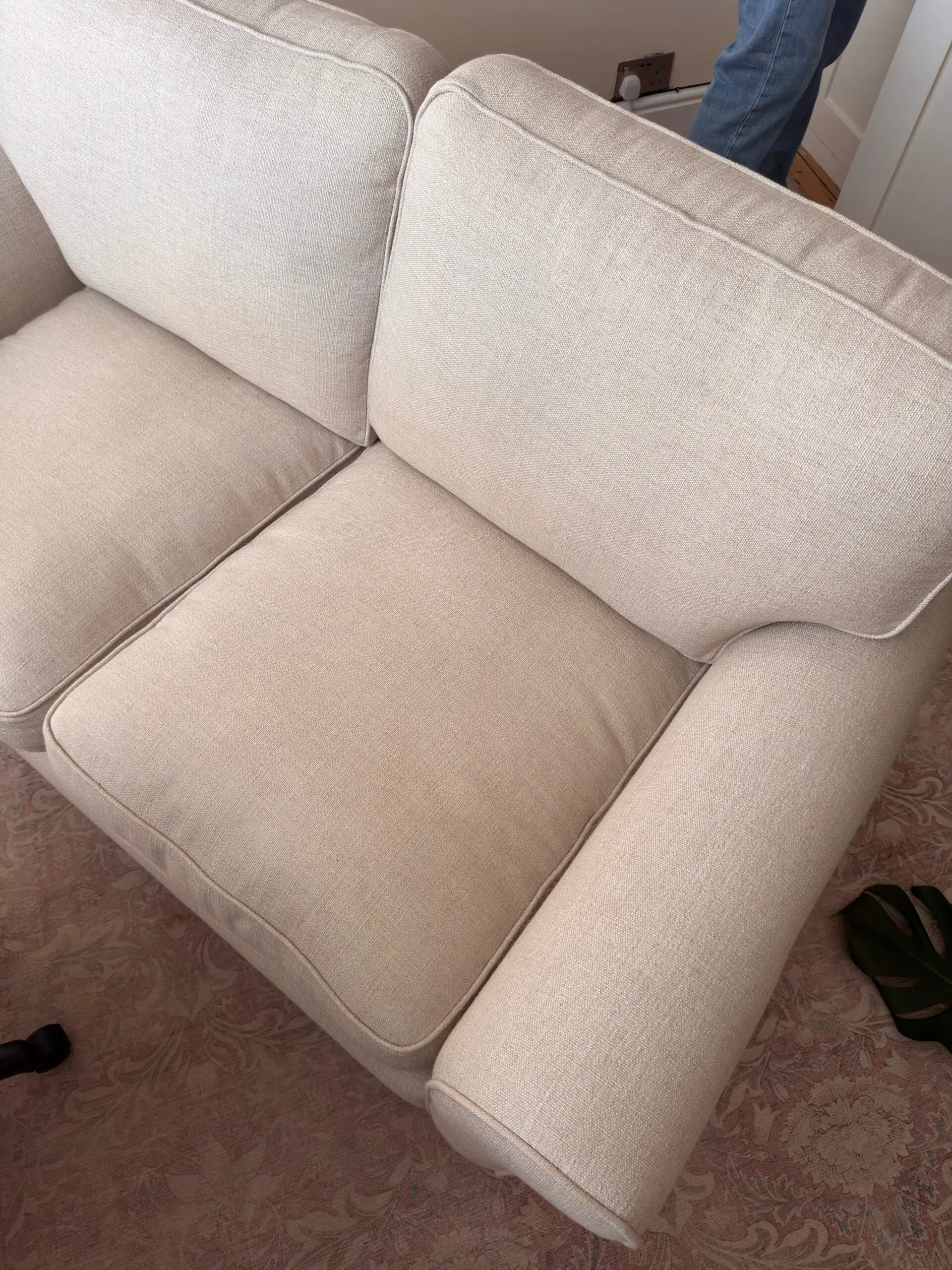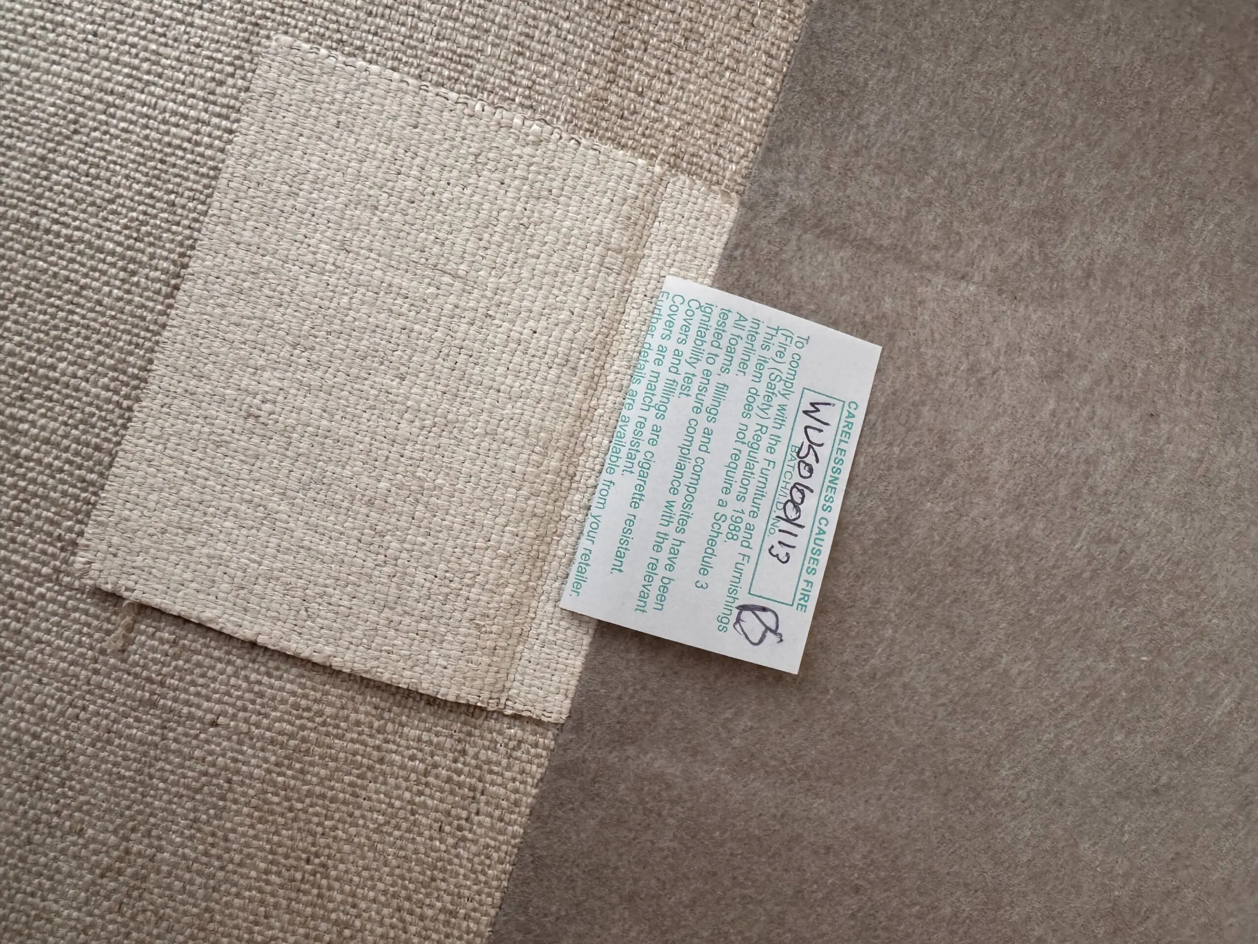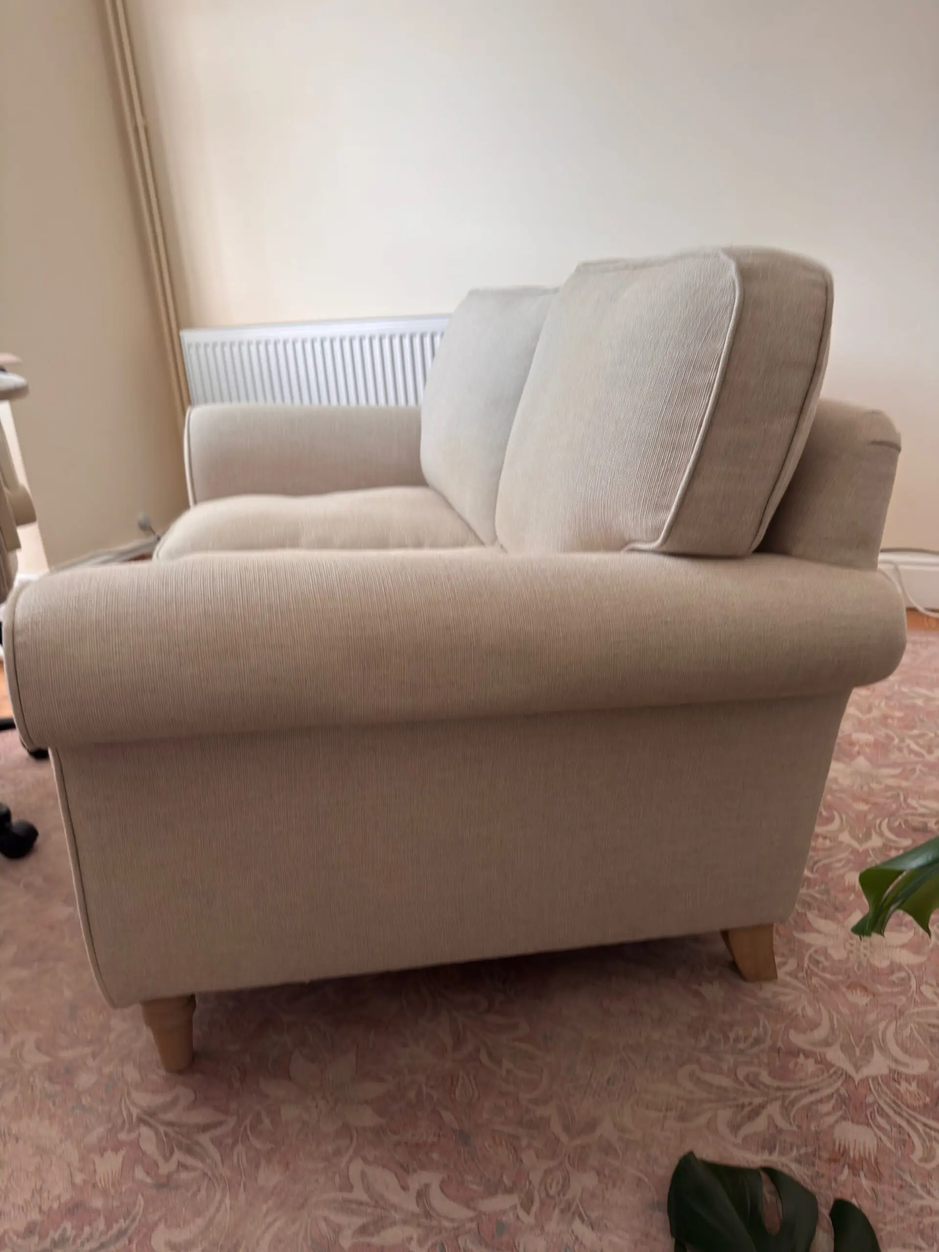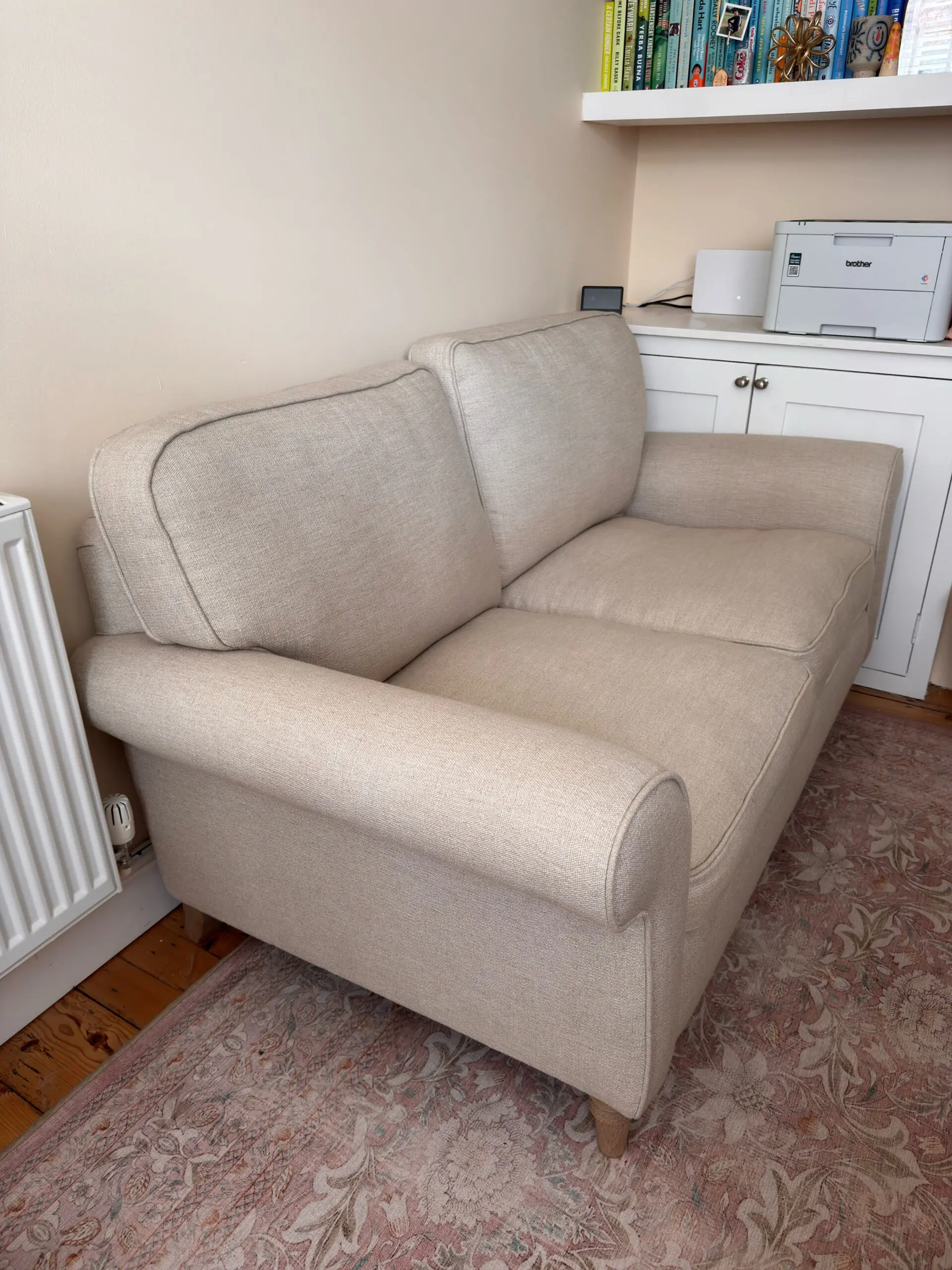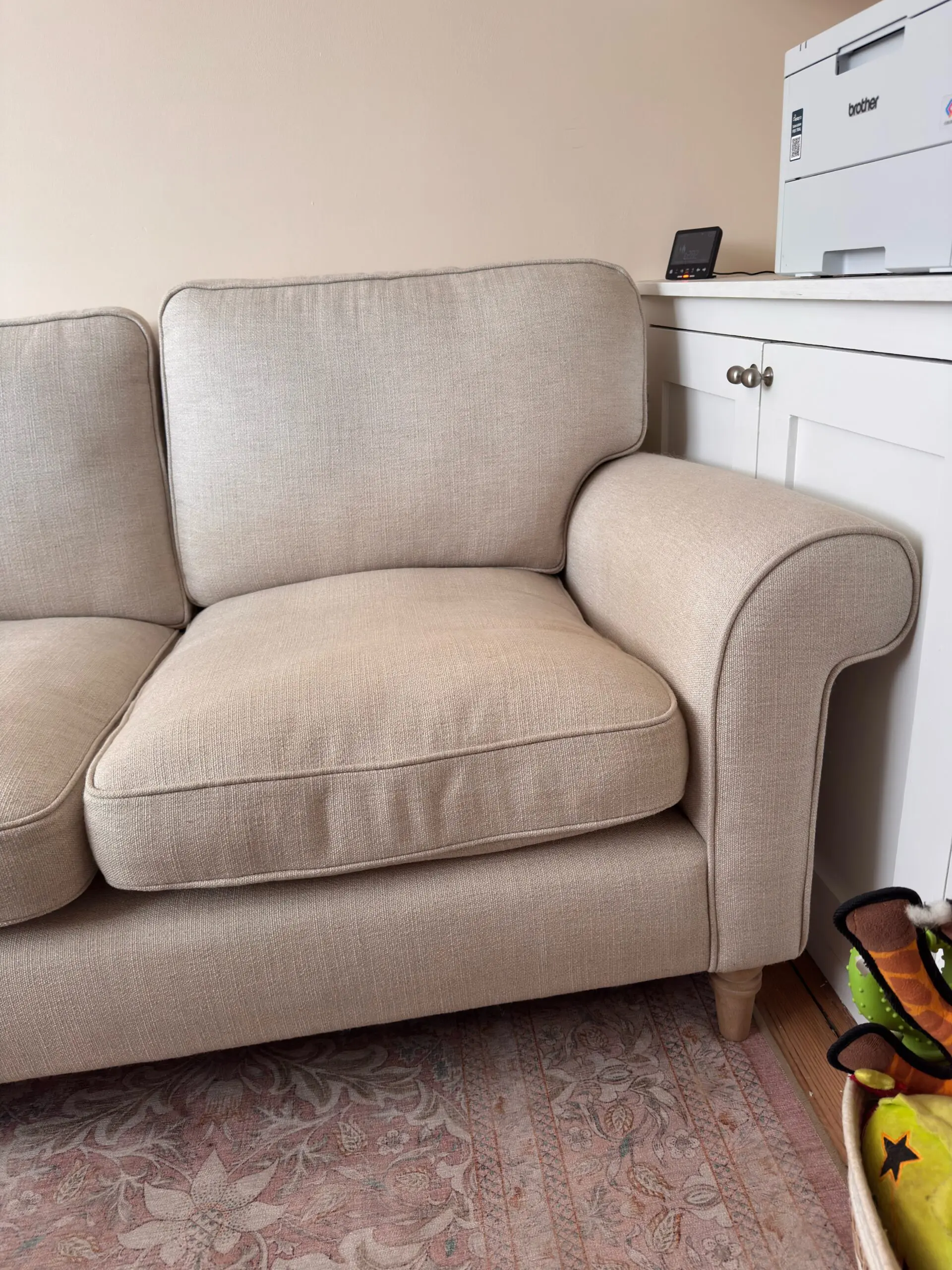 We bought it new about 18 months ago for £1,699 and it’s been very, very gently used. Used as a sofa in a home office rather than a primary sitting room sofa – sat on maybe once a week for 10-15 minutes. No spills, no stains, no tears. We’ve just moved and, sadly, it doesn’t work in our new space. We do have a pet dog but he did not use the sofa.