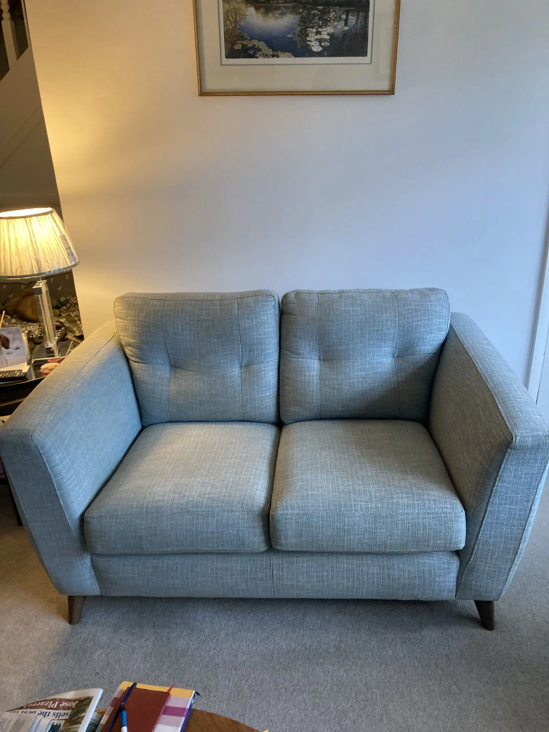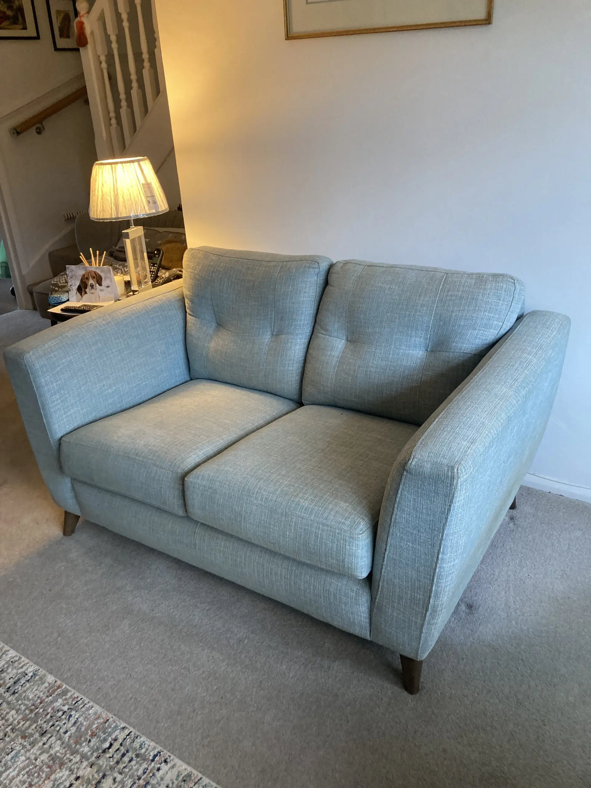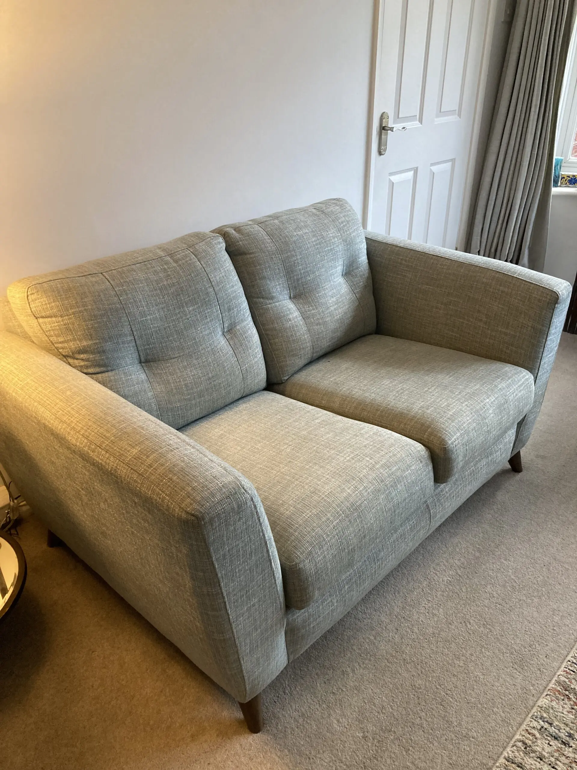 Very comfy linen style finish sofa. Very good condition. No damage to fabric or structure. Pale teal colour. Removable legs.