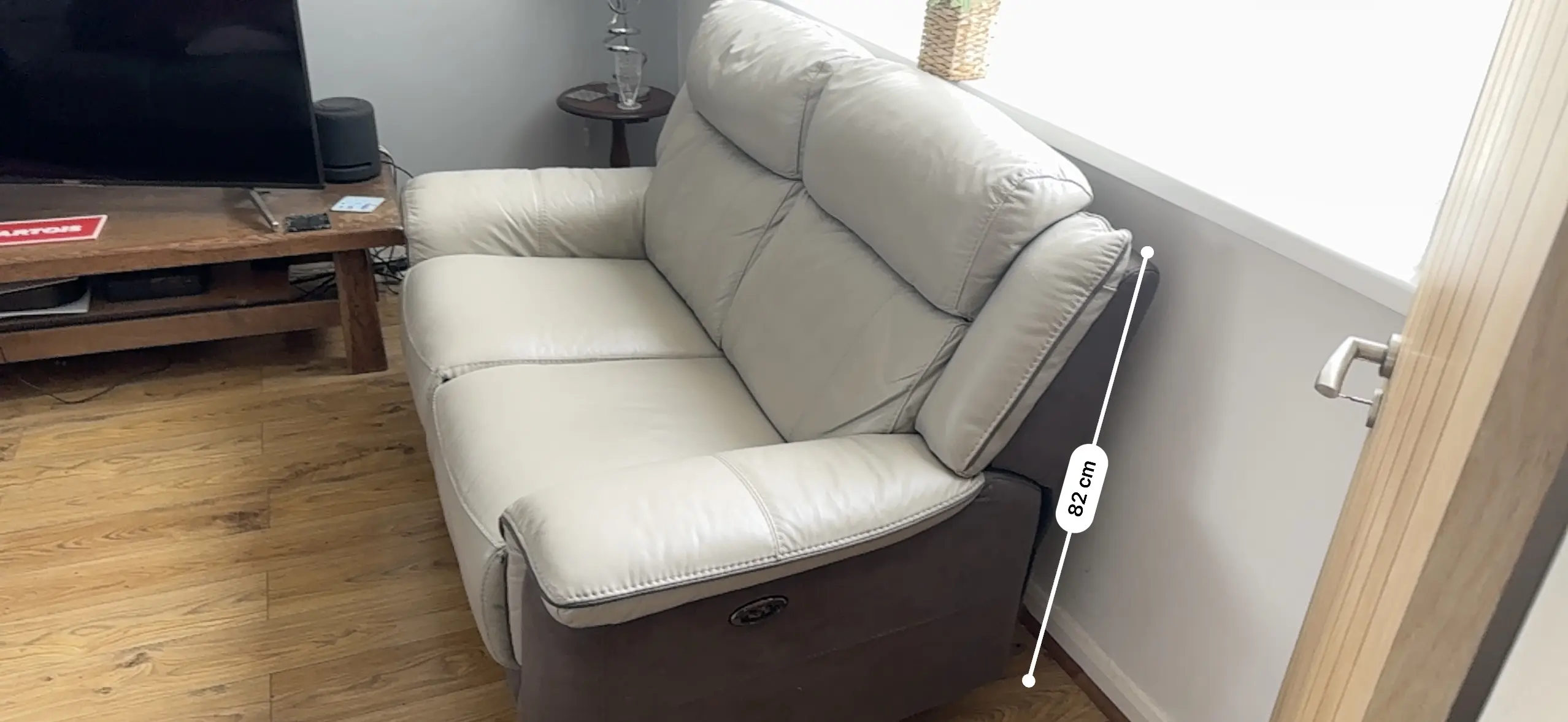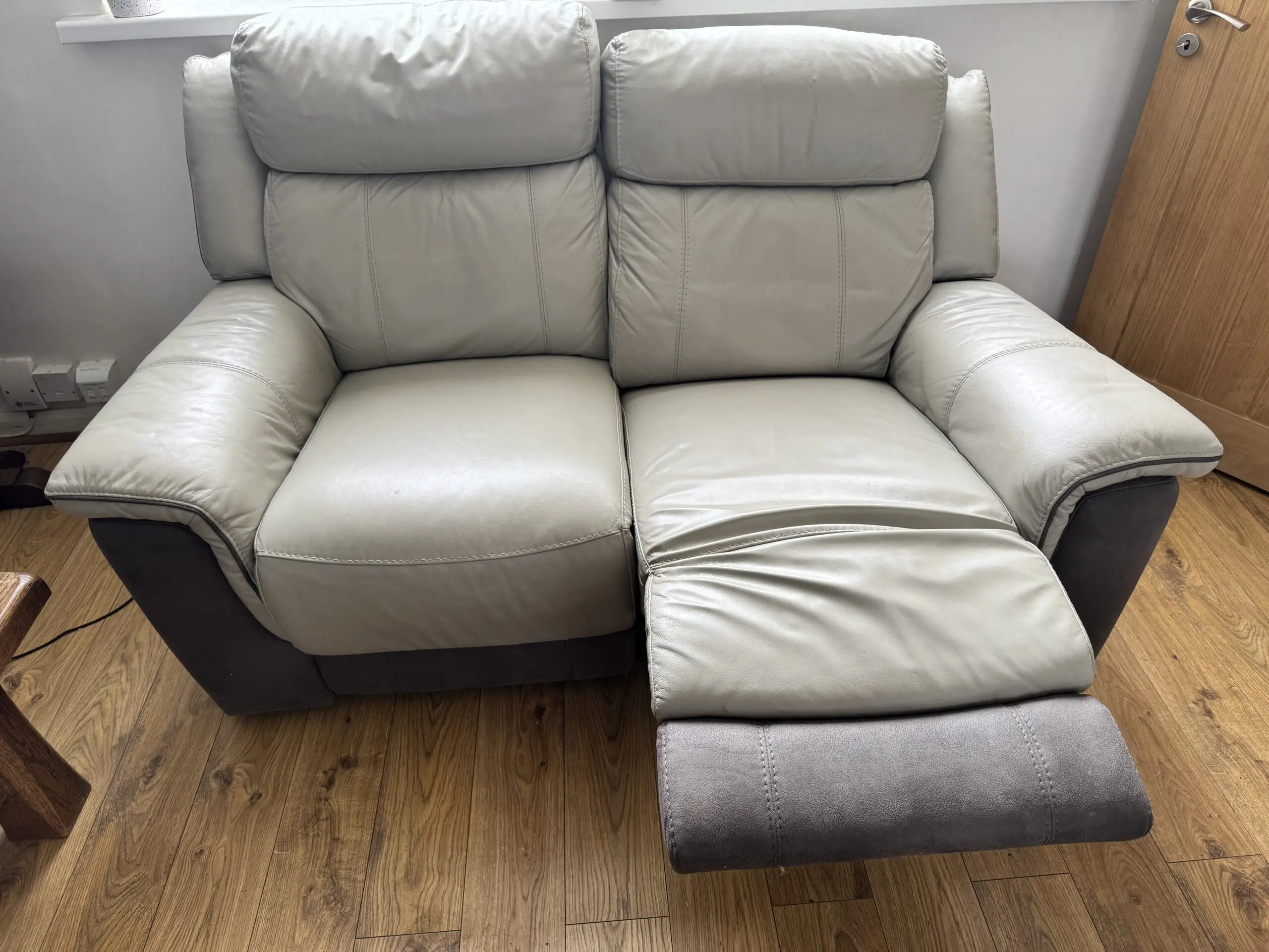Two off DFS 2 seater grey leather sofas. With electric operated leg supports good condition, very minor cat scratch on arm not noticeable unless up close.
