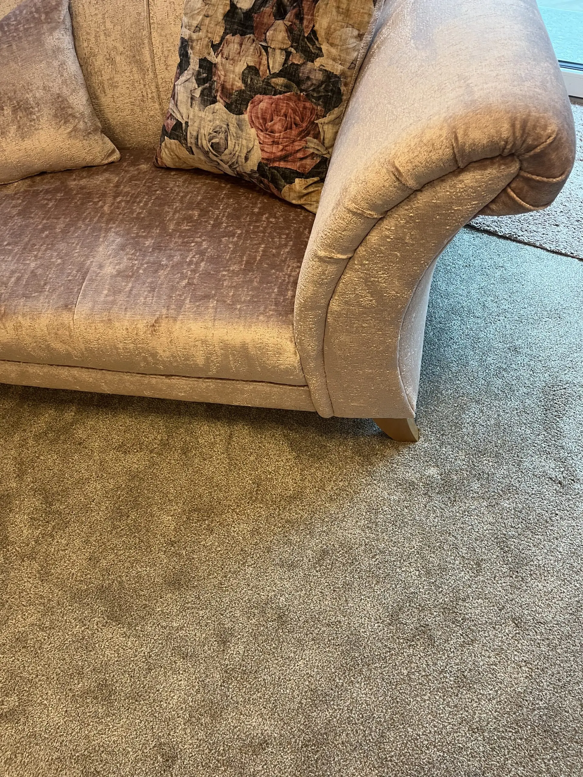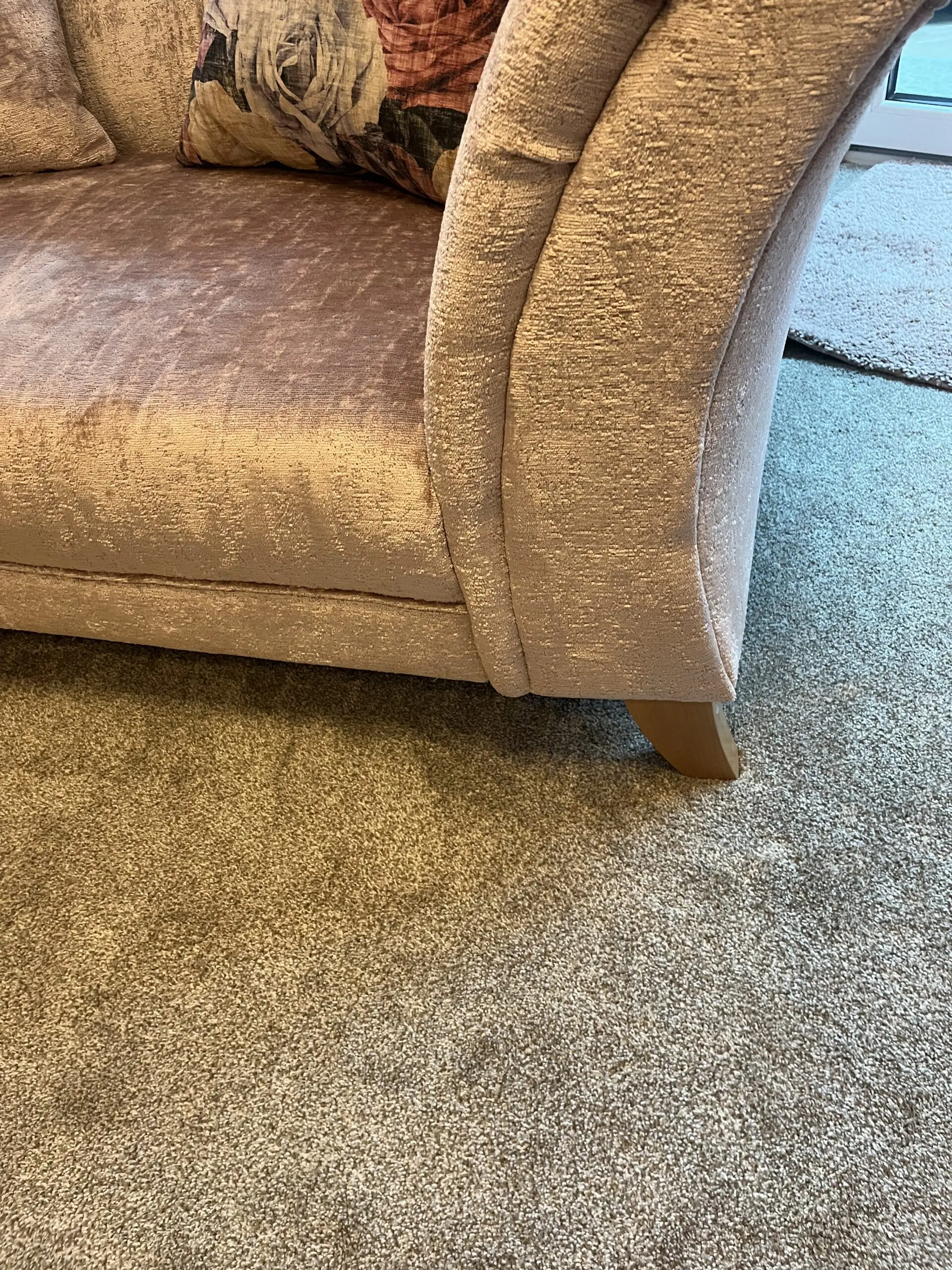 Two seater pink velour fabric sofa from furniture village.