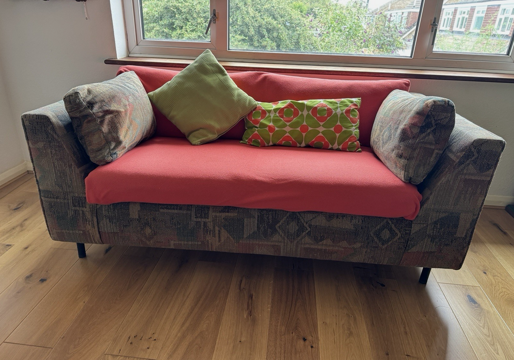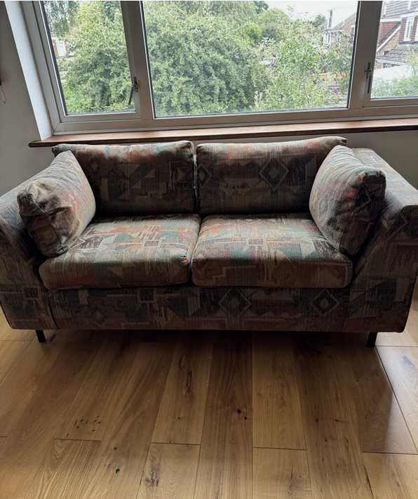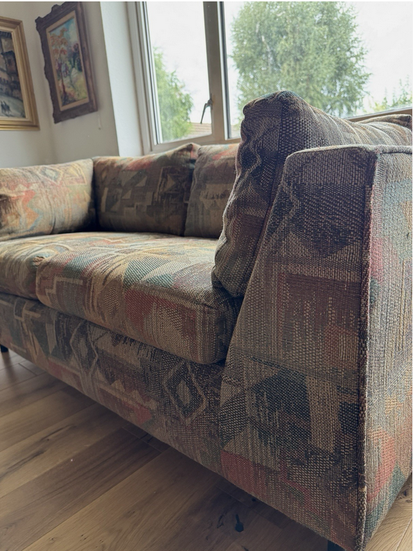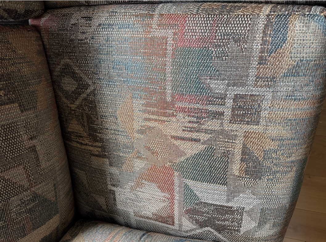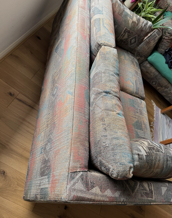 The multi-coloured fabric upholstery and Mid-Century Modern back and arm style give it a unique and retro charm.