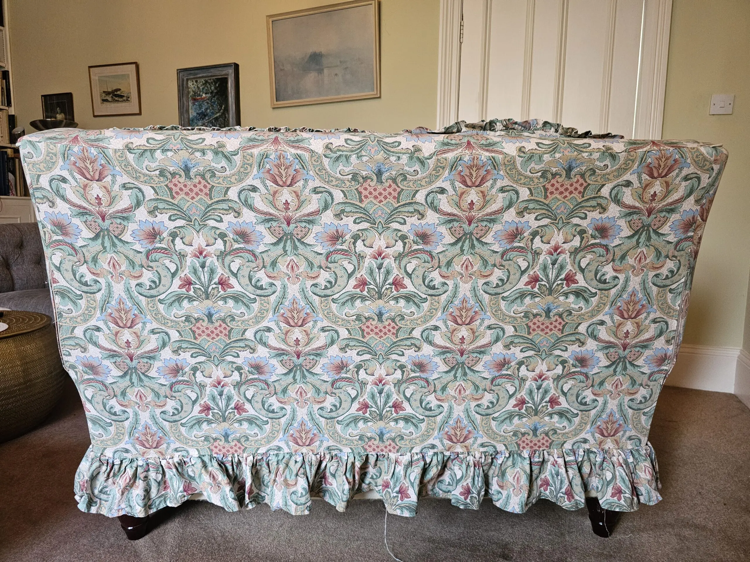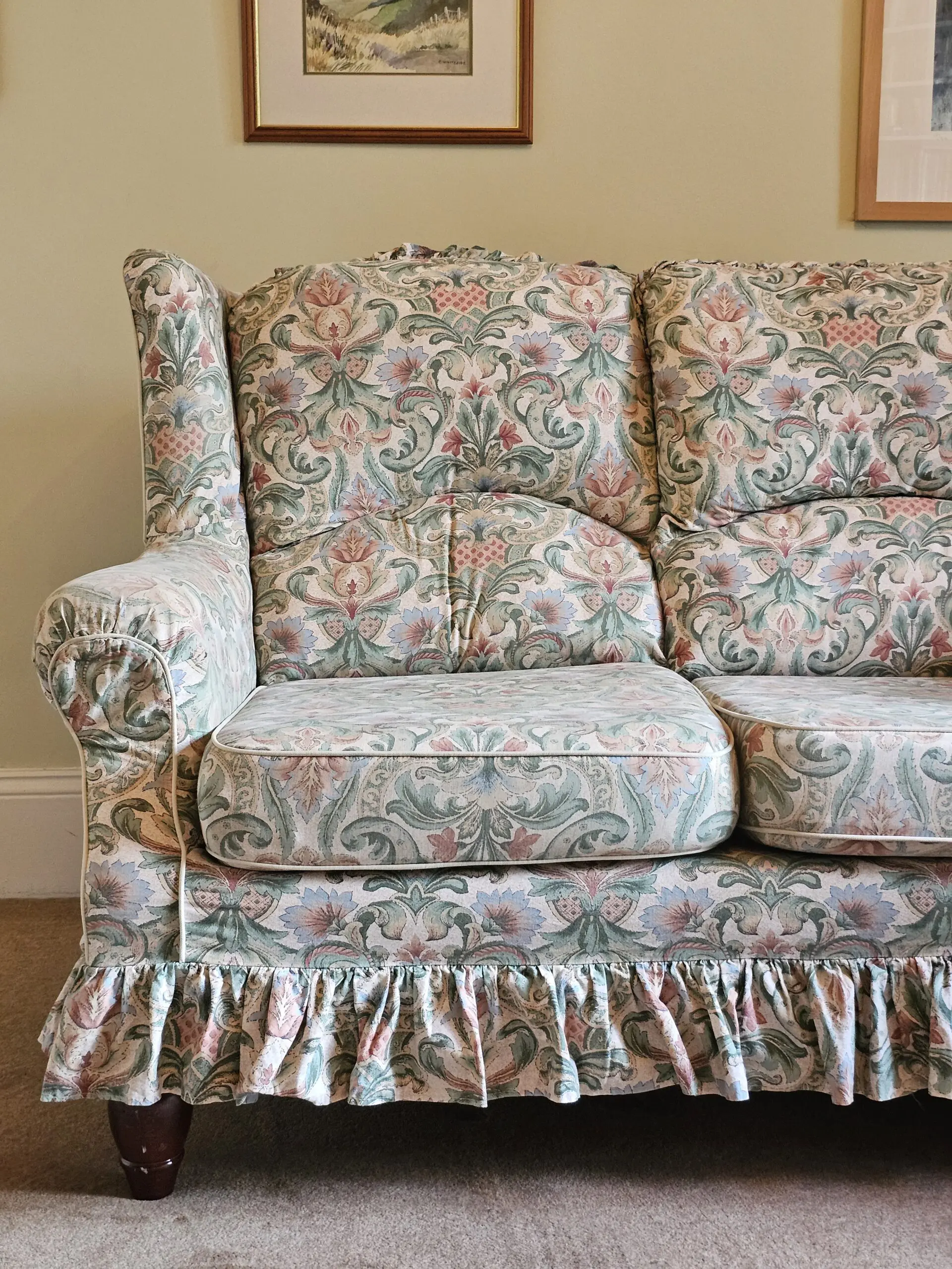 Elegant comfortable vintage-style sofa in Laura Ashley style pastel floral tapestry fabric. Has one tiny ink stain on bottom of cushion but otherwise is in great condition. The covers have been recently dry cleaned and it not been used since