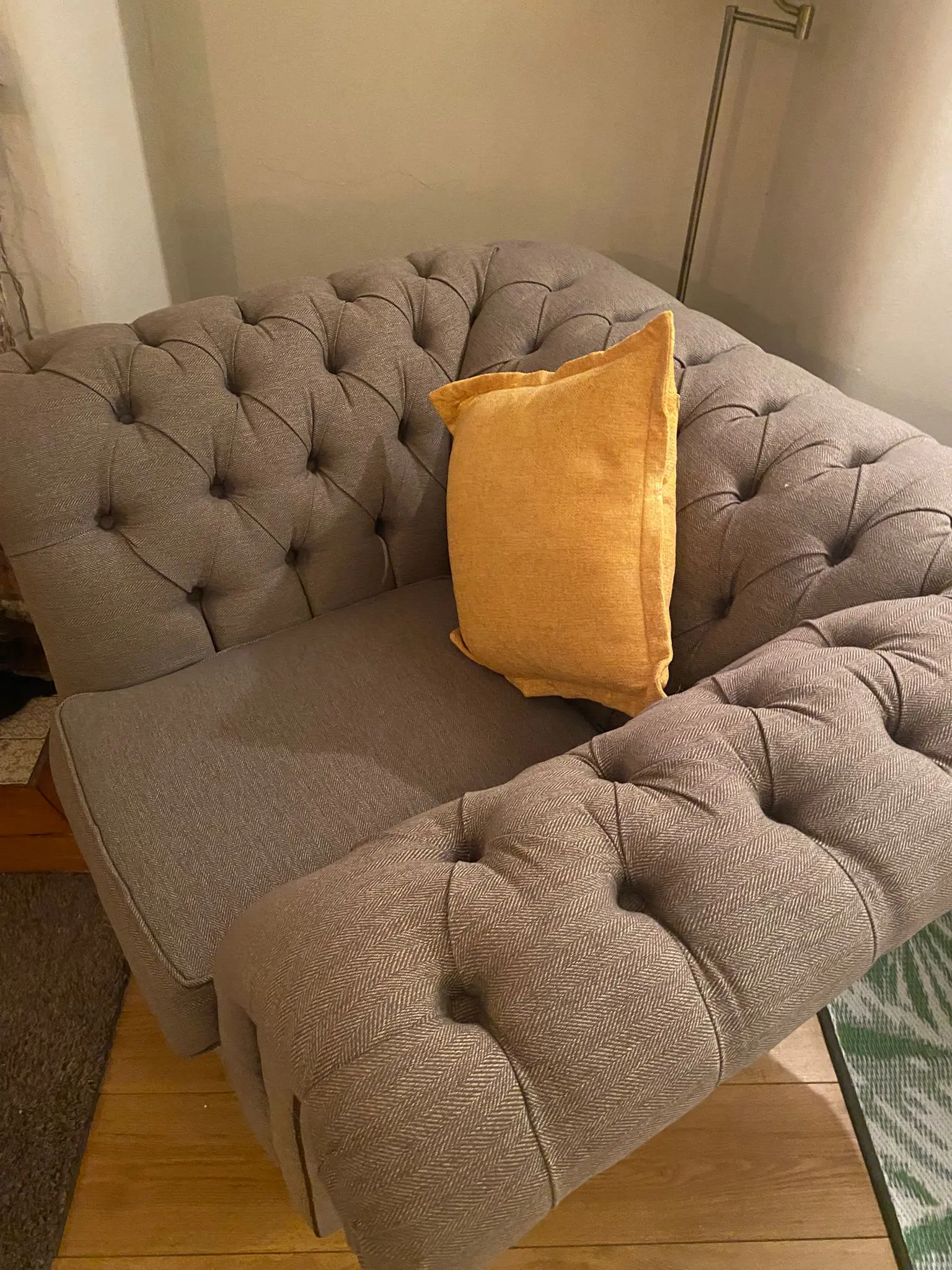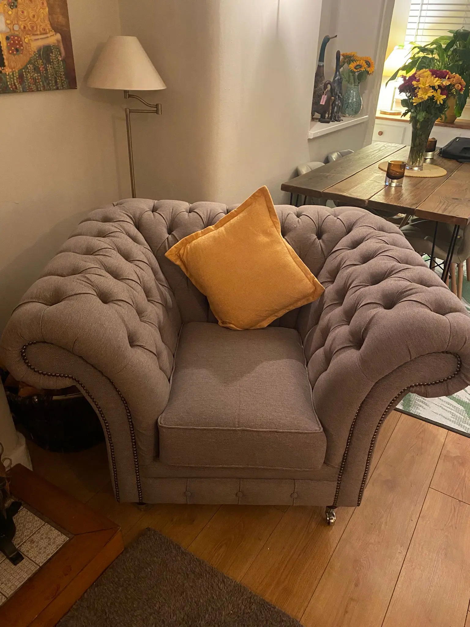 Very good condition, warm grey herringbone Chesterfield 2 seater sofa and air chair.