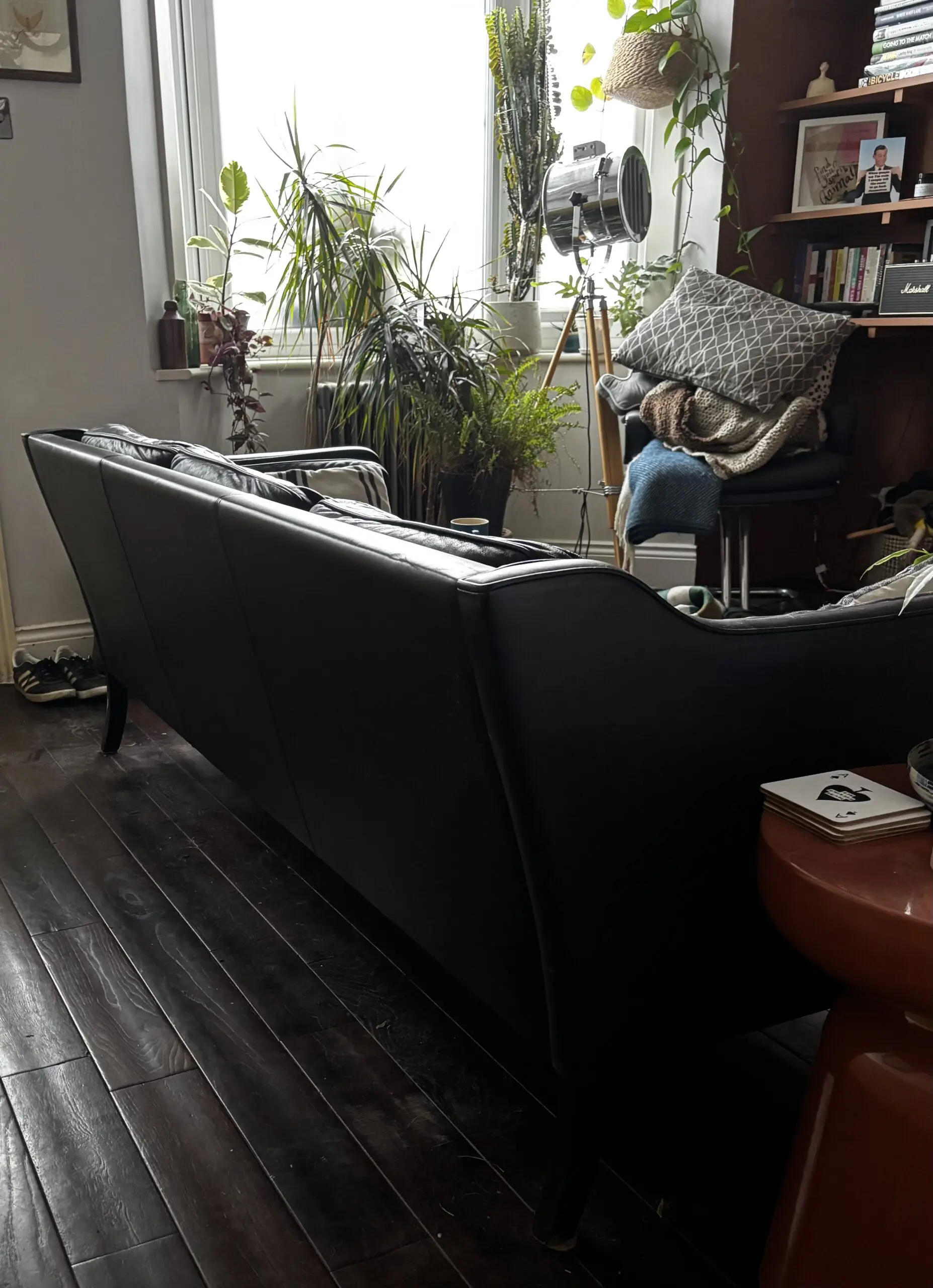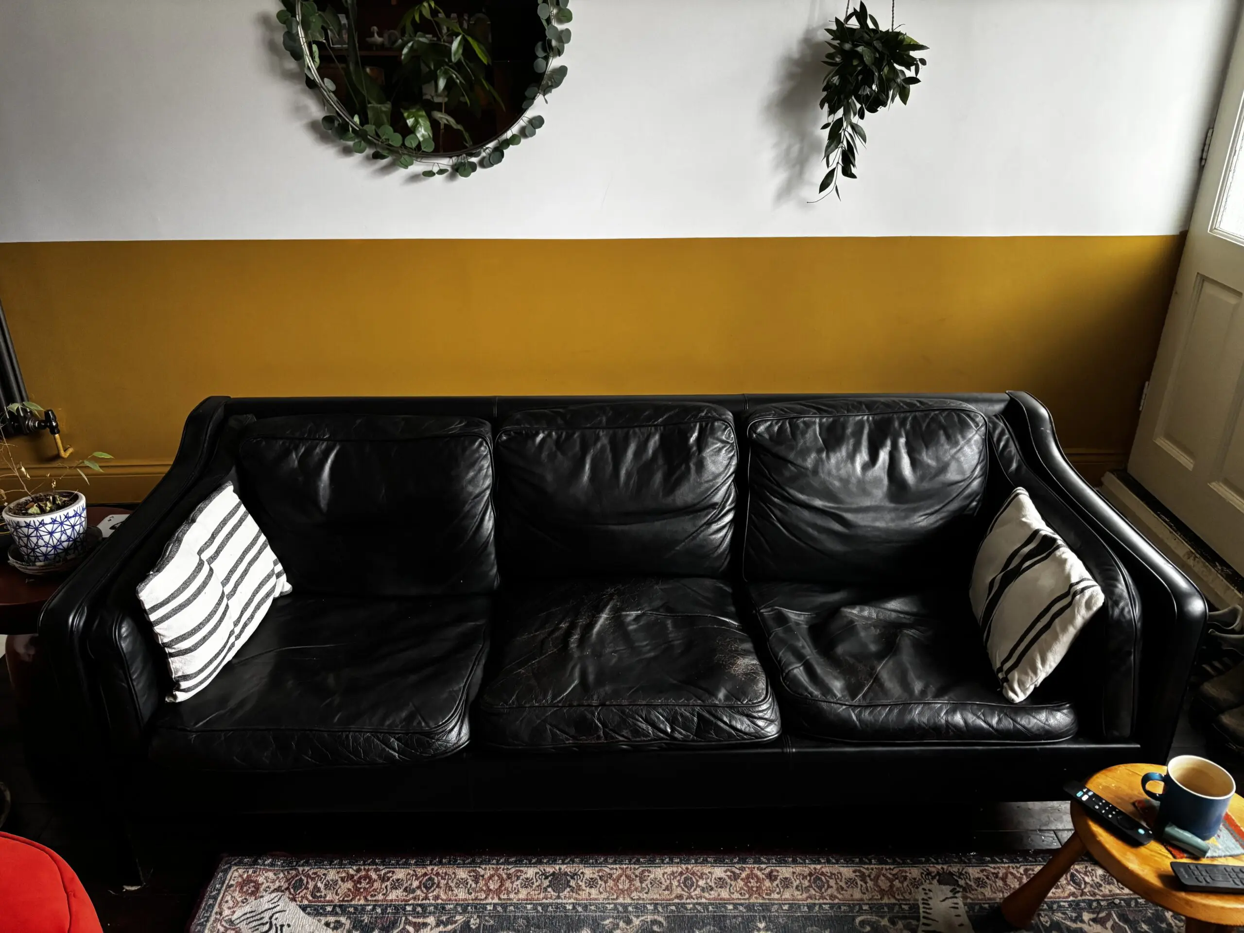 Black Leather Danish mid century 3 seater sofa. Purchased from Vinterior 4 years ago. It’s a beautiful piece with frame perfectly in tact and no cuts in the leather. The fabric decking under the seat cushions need repairing hence the reduced cost.