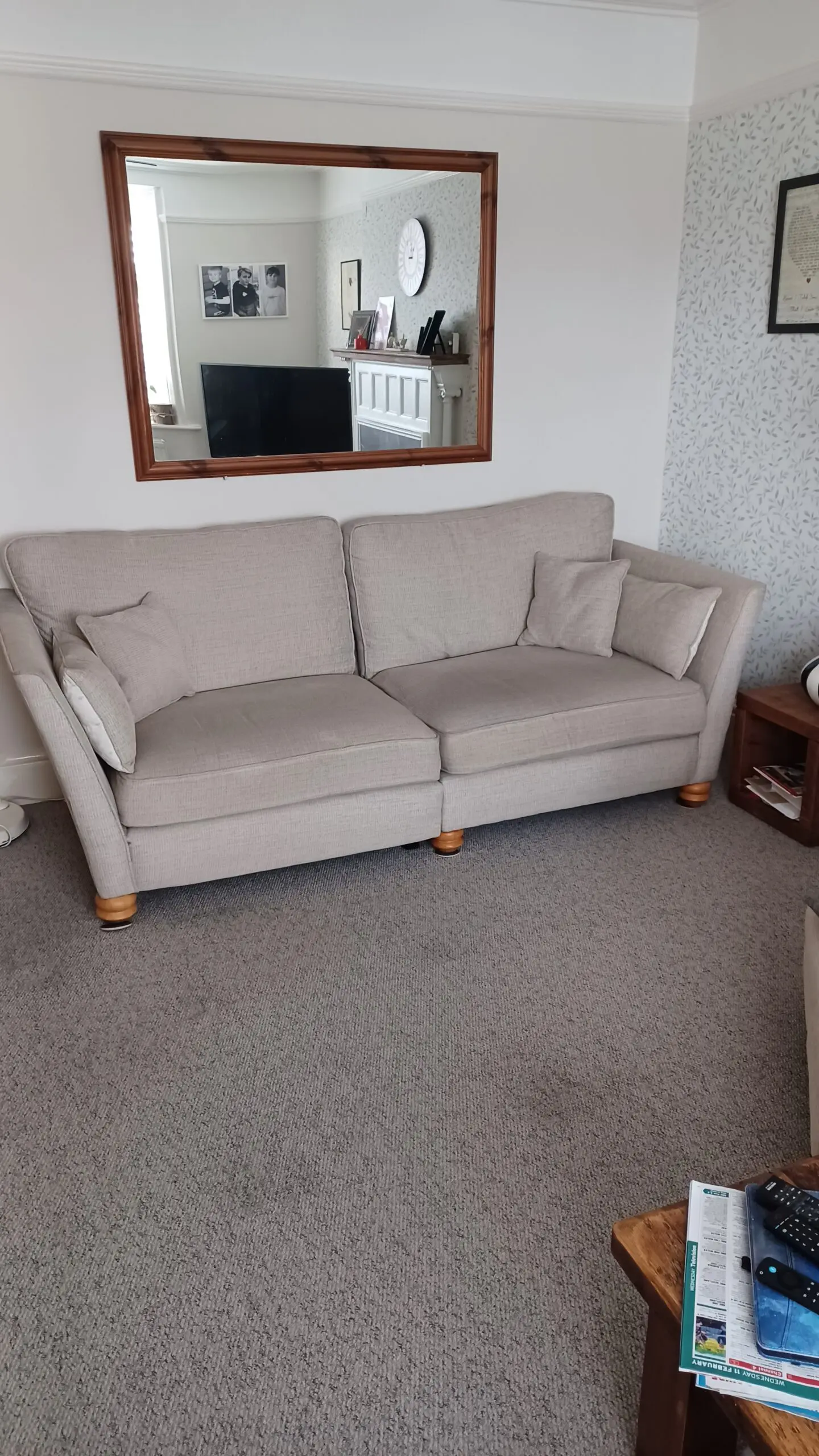 Two large Oak Furnitureland sofas and stool. Very good condition. With wooden feet. Very comfortable and plenty of room to relax and spread out.
